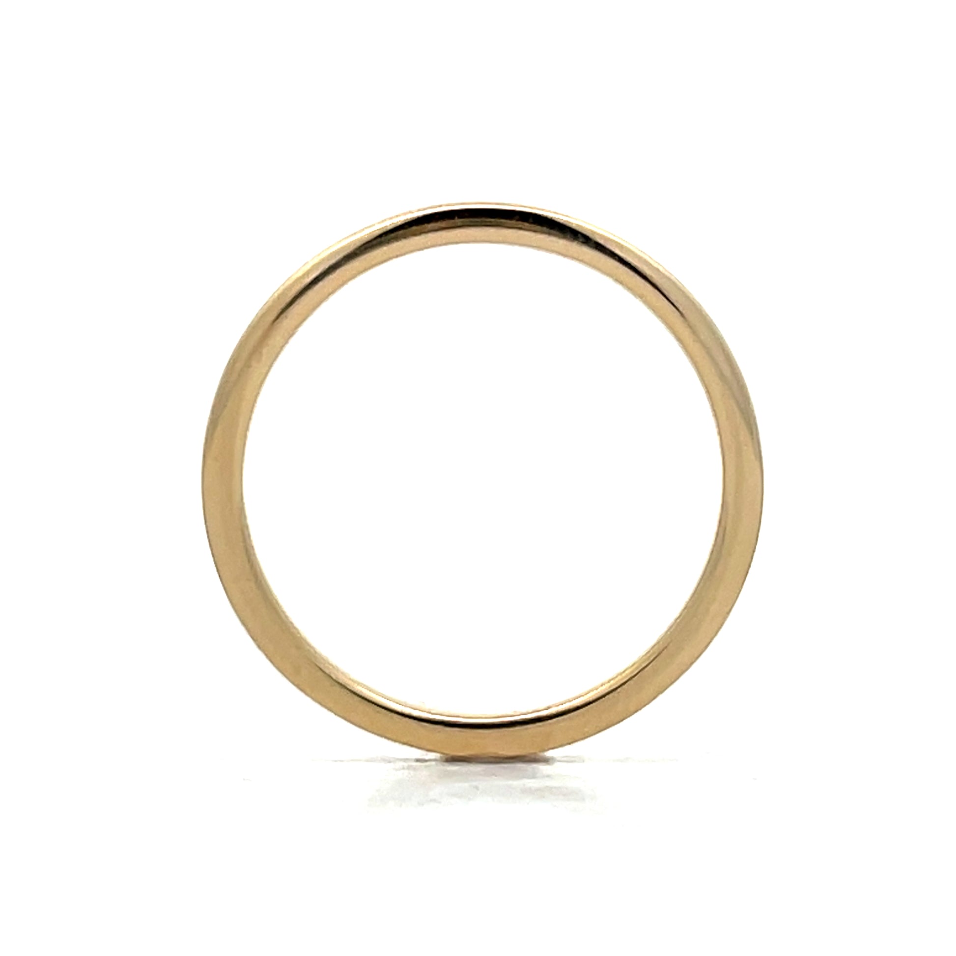 This 14 karat yellow gold contoured wedding band features a distinctive oval-shaped cutout and measures 5mm in width with a flat edge design. The contoured shape allows it to stack nicely with other rings, while the oval cutout gives it a more modern look than traditional plain bands. The band's width hits a sweet spot between being substantial enough to notice but not so wide that it feels bulky on your finger.