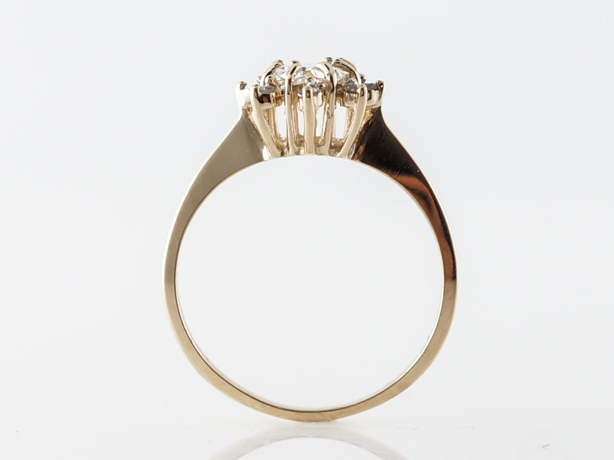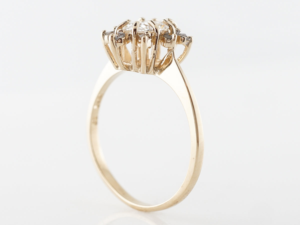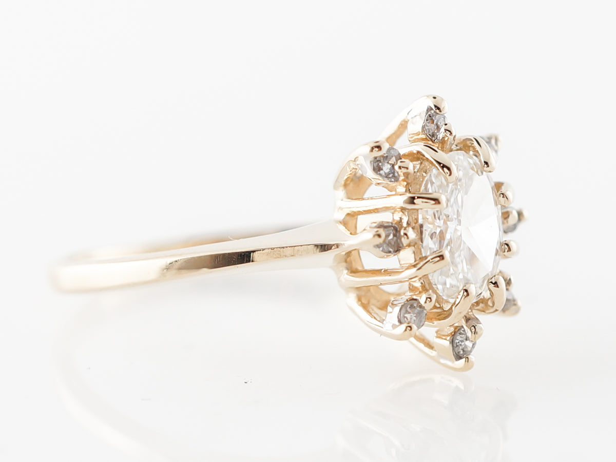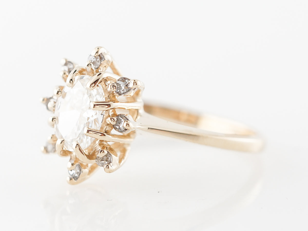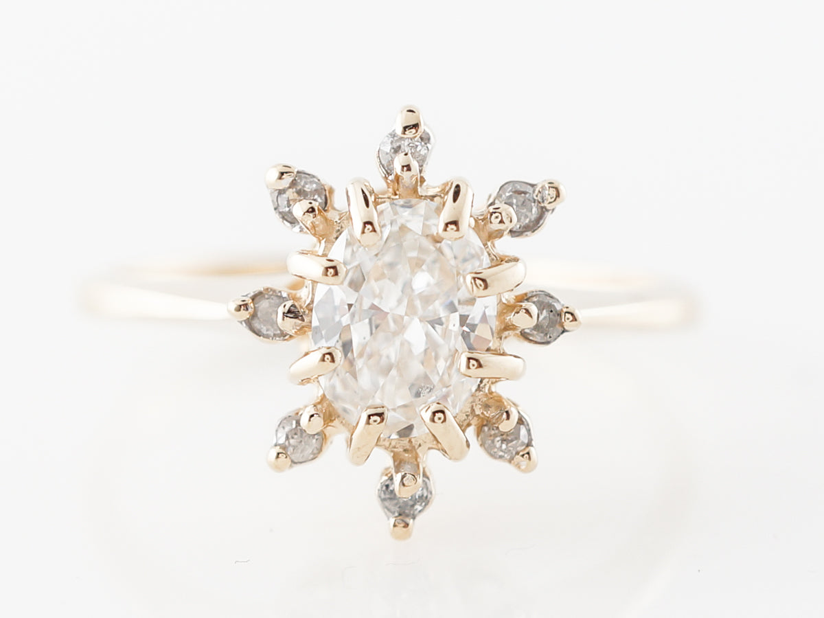 Oval Diamond Halo Engagement Ring in Yellow Gold. This engagement ring is a hybrid of an old new and features a .62 carat oval cut diamond at its center with .16 carats of round diamonds surrounding it and set in 14 karat yellow gold. The accent stones surrounding the oval in the center are spaced out to create a bright, starburst look. The basket shows plenty of open space on the sides of the diamond to bring as much light into the stone as possible.
