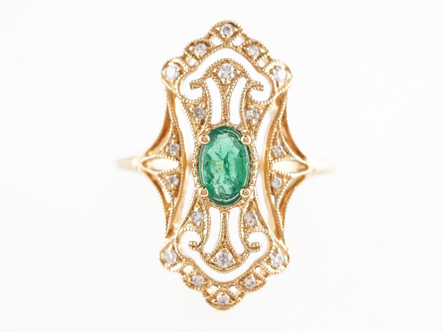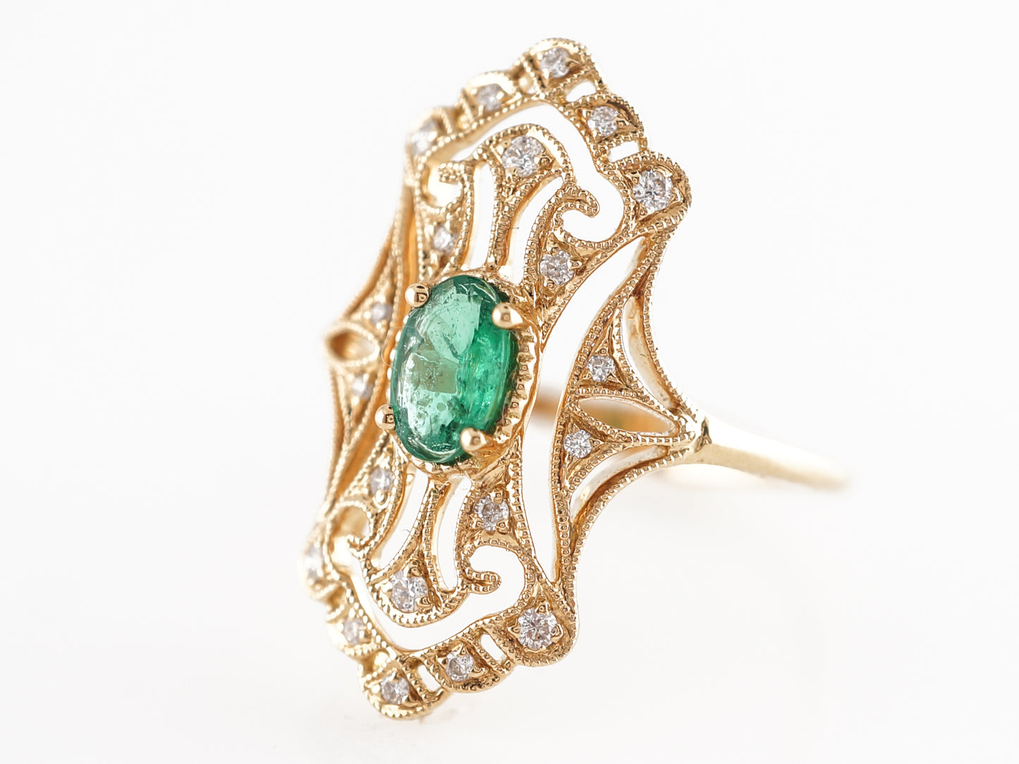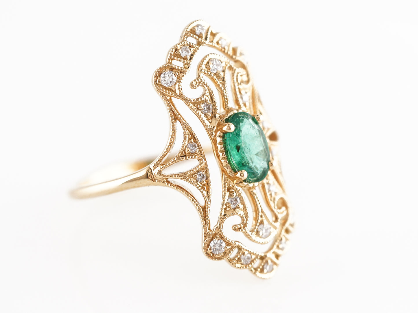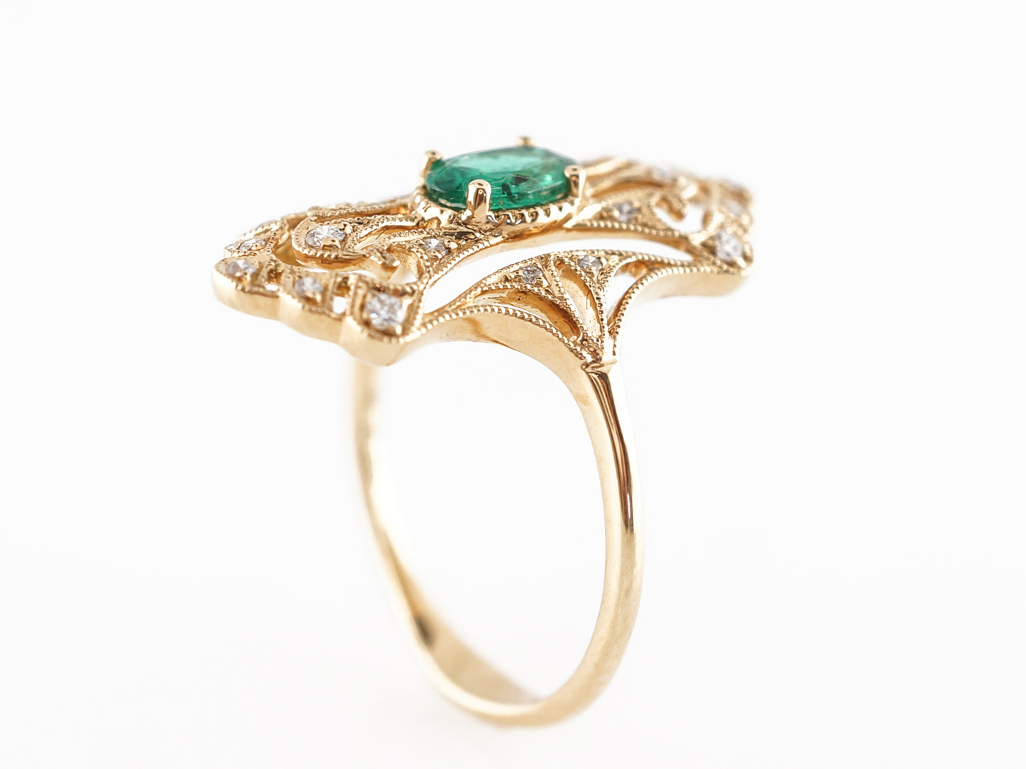 Oval Emerald Cocktail Ring w/ Diamond Accents in 18K. This bright elongated cocktail ring features an oval cut emerald set in 18 karat yellow gold with .13 carats of round cut accent diamonds. The .34 carat emerald sits inside a wonderful mounting surrounded by curved open spaces and milgrain detail, making this a great shape for an archer ring. A fabulous cocktail ring with a big look but a rather light and airy feel.