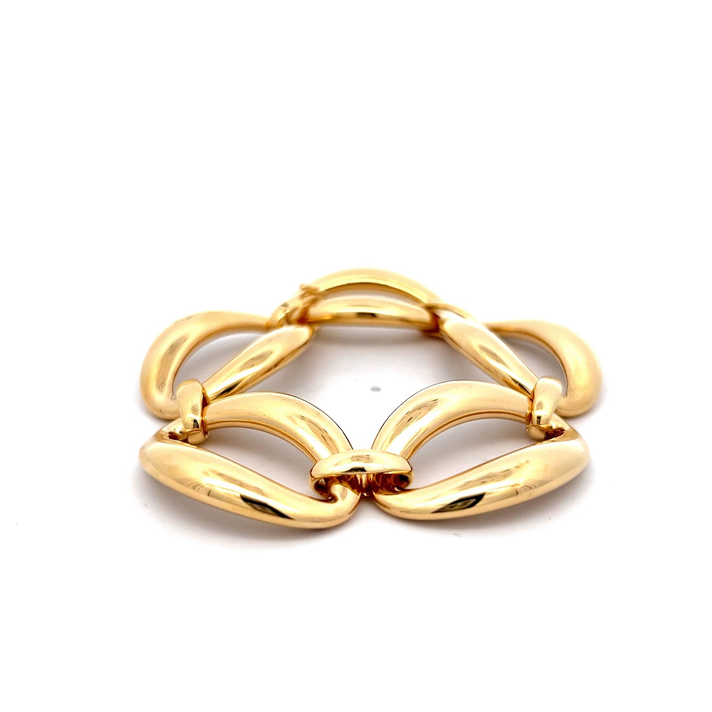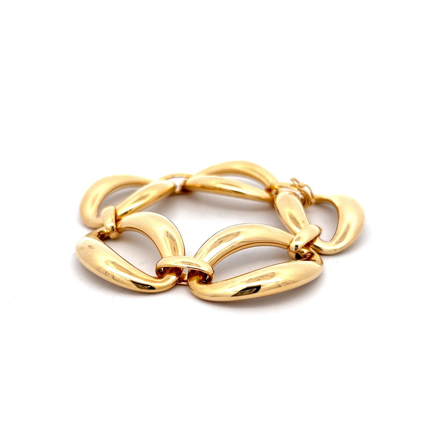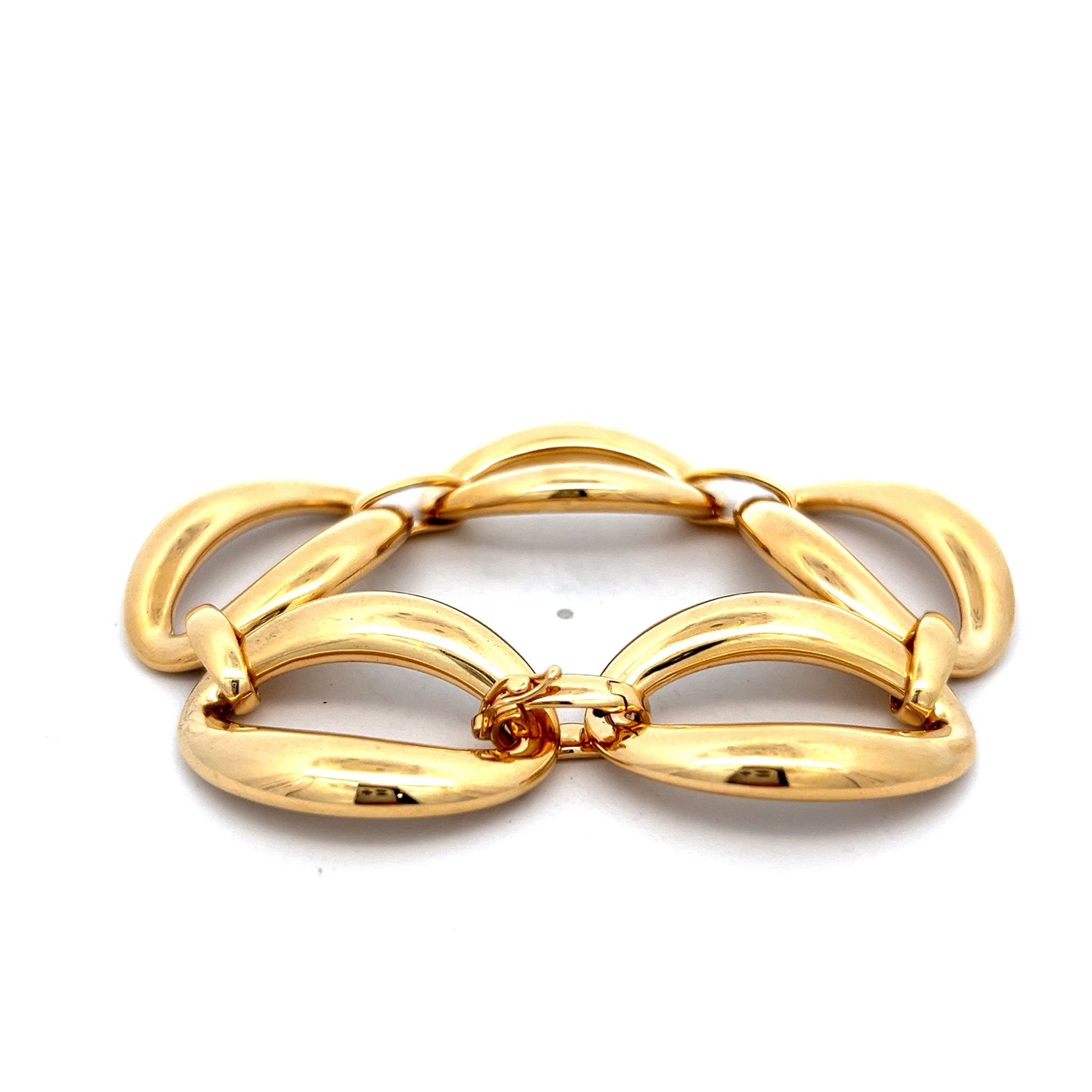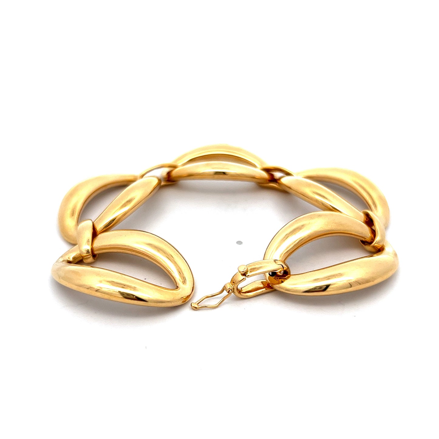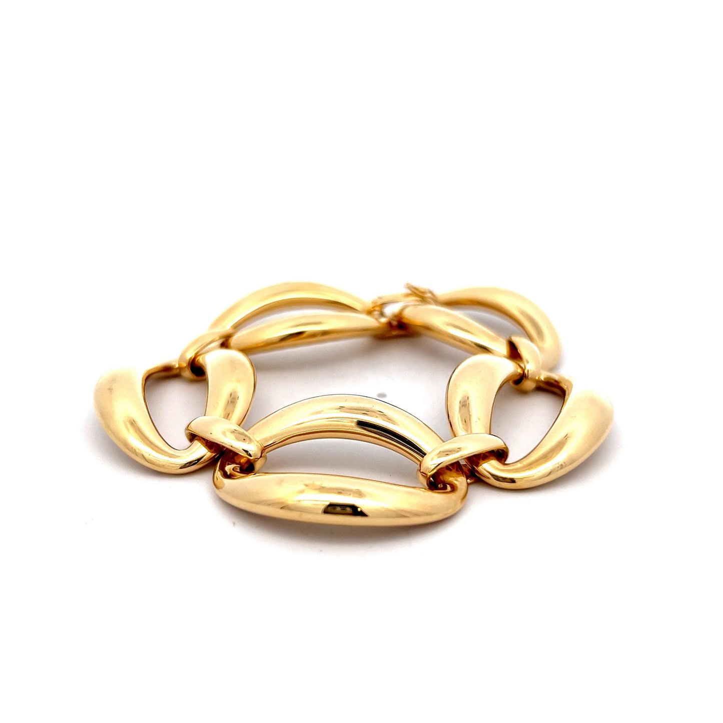 Crafted in 18 karat yellow gold, this bracelet features a unique oval link design that adds a modern touch to the classic chain bracelet. The hollow links give a lightweight feel, making it comfortable to wear all day long. The high polished gold adds a luxurious shine to the piece, making it an eye-catching accessory for any occasion. Measuring 7 inches long, this bracelet is the perfect size to wear on its own or stacked with other bracelets. It's versatile enough to be dressed up or down, making it a go-to piece for any daytime or nighttime look. The lobster-clasp fastening ensures a secure fit, giving you peace of mind while wearing it.