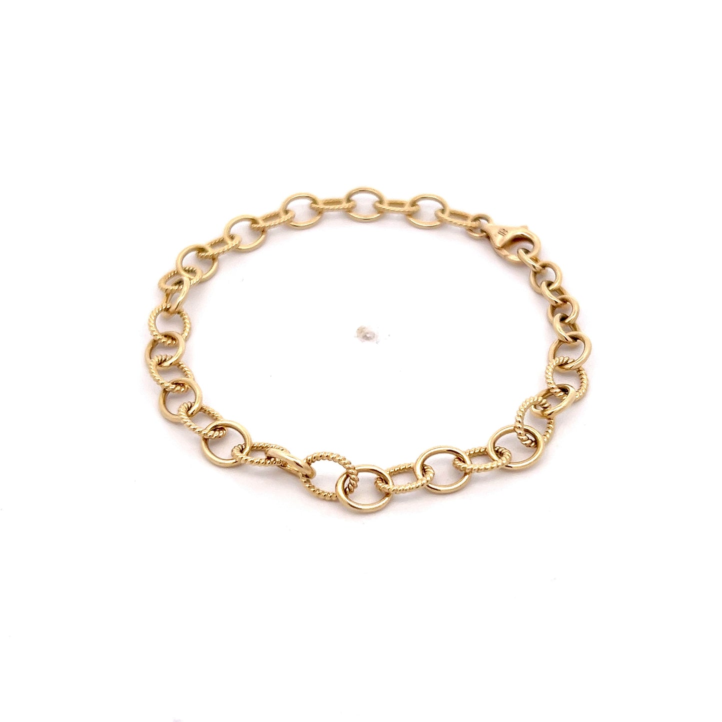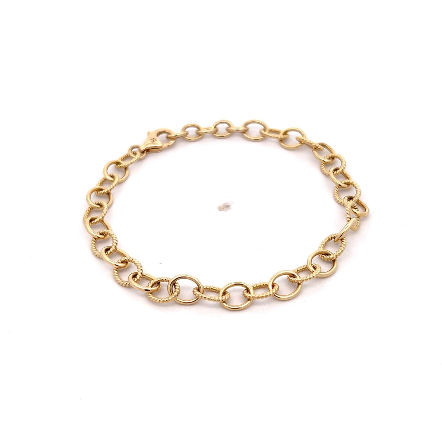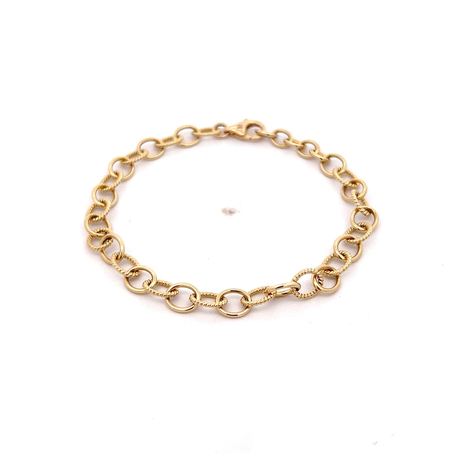 This modern oval-link charm bracelet features a dynamic design of alternating polished and rope-textured links. The lightweight yet durable structure makes it a versatile piece, perfect for stacking or wearing solo. Crafted in 14k yellow gold, its clasp ensures a secure fit.