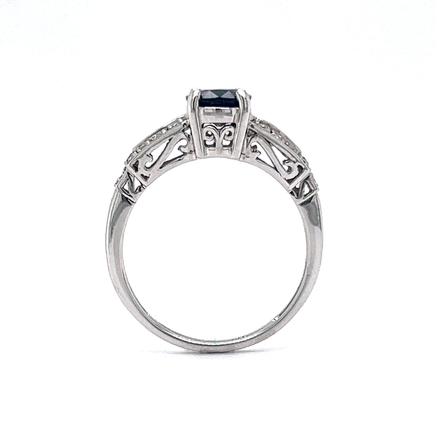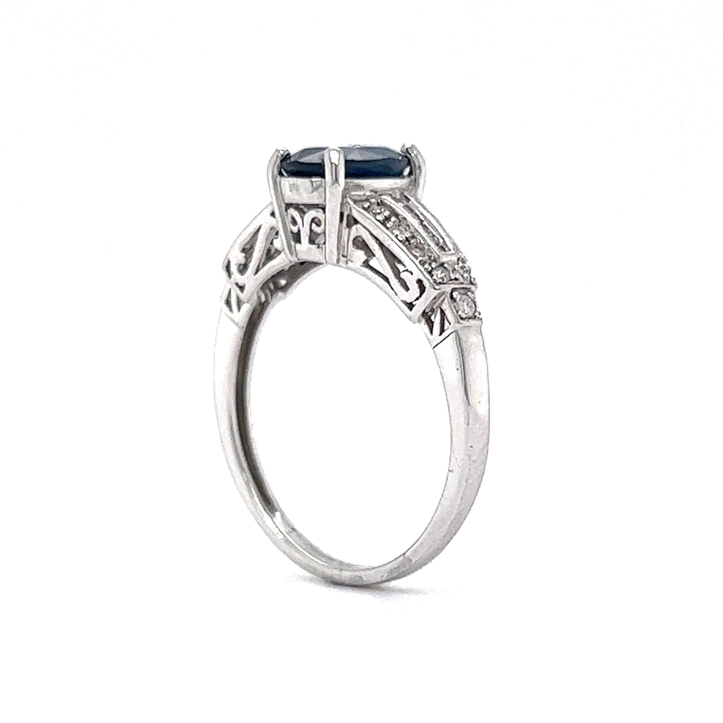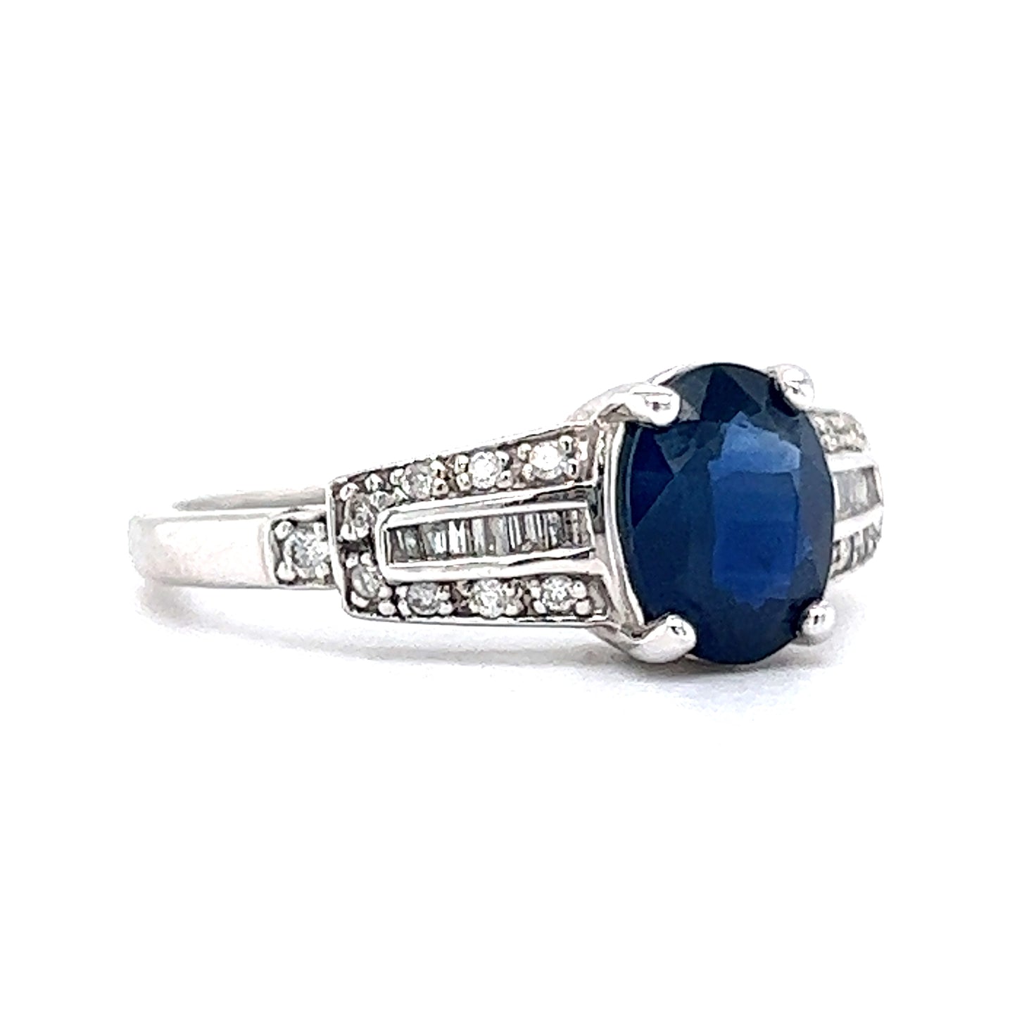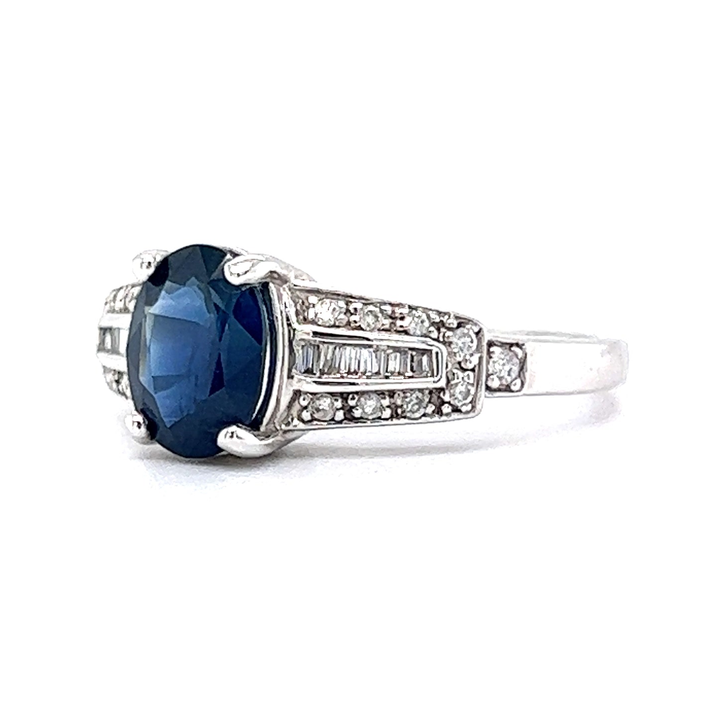 This modern sapphire engagement ring features a 1.29 carat oval cut sapphire with .51 carats of accent diamonds. The accent diamonds on the shoulders are a dynamic collection of baguettes and round cuts. From the side profile, the ring showcases lovely filigree details as well. This 14 karat white gold ring is creative.