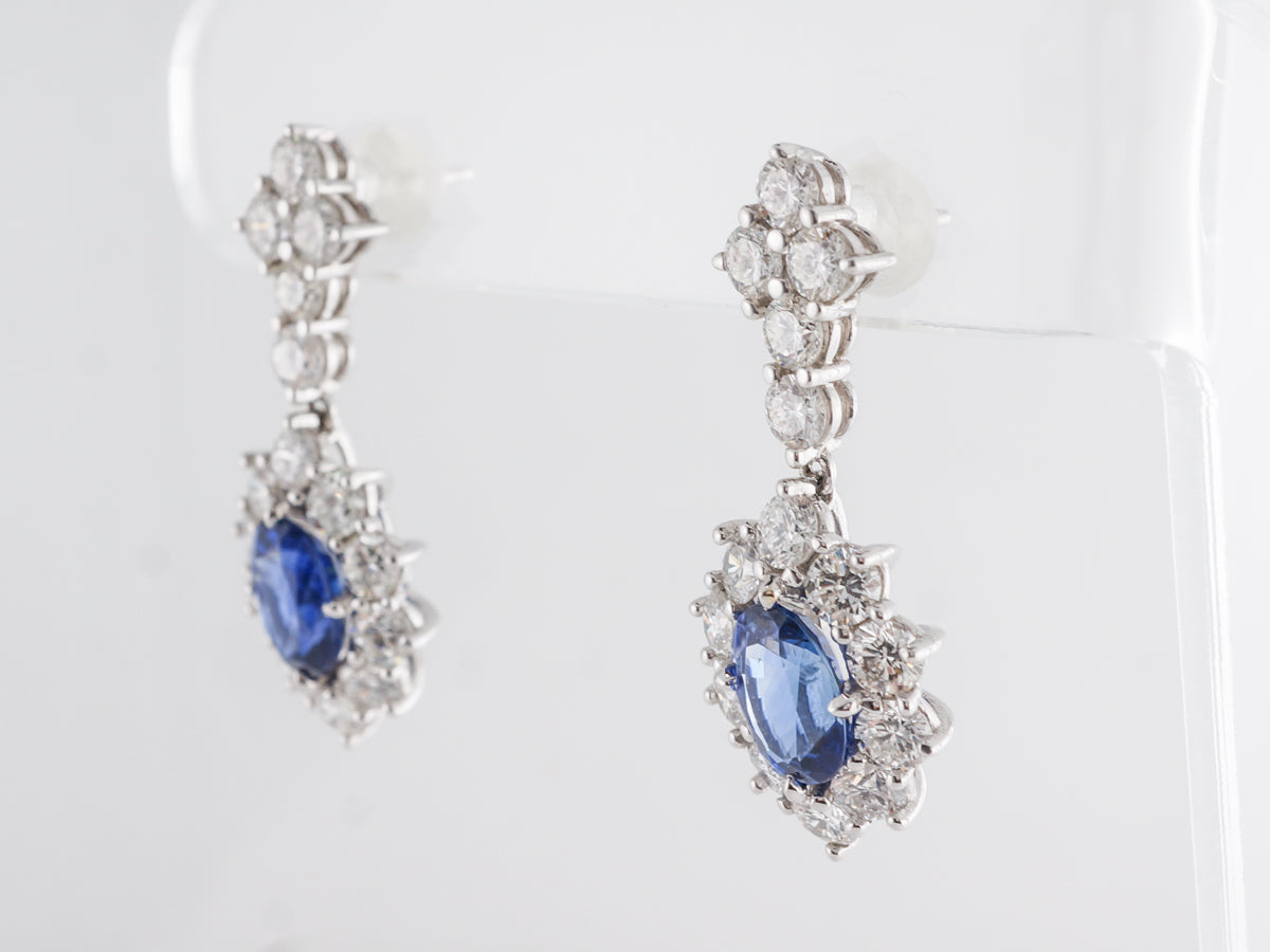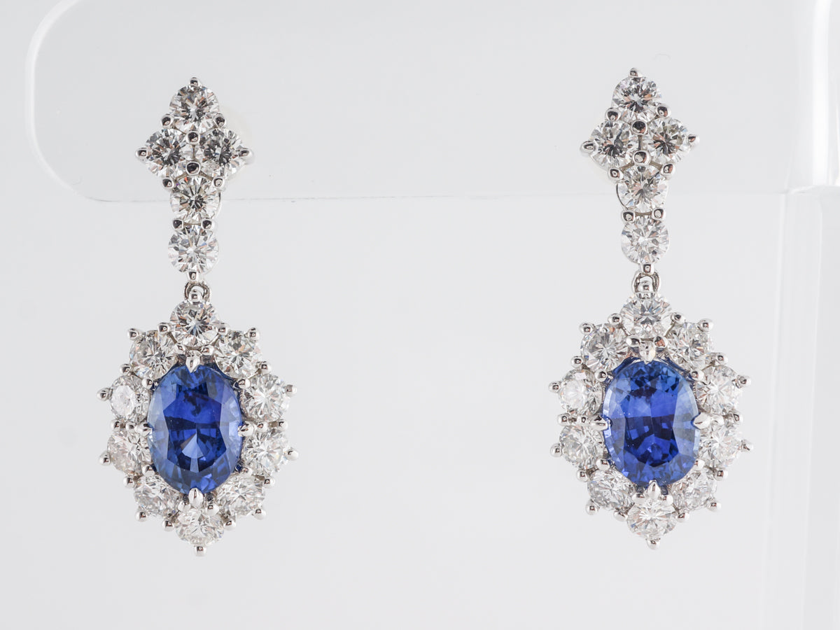 Oval Sapphire w/ Round Diamond Cluster Earrings. These 18 karat white gold sapphire and diamond drop earrings are a modern classic. The oval center sapphires are prong set with a total weight of 4.25 carats. The sapphires are a rich royal blue with a violet tone and high transparency. The sapphires are surrounded by round brilliant diamonds creating a cluster with great scintillation. The earring post is set with round brilliant diamonds in a shield pattern. The total diamond weight is of the thirty round brilliants is 4.20 carats. The earrings measure 1.75 in length.