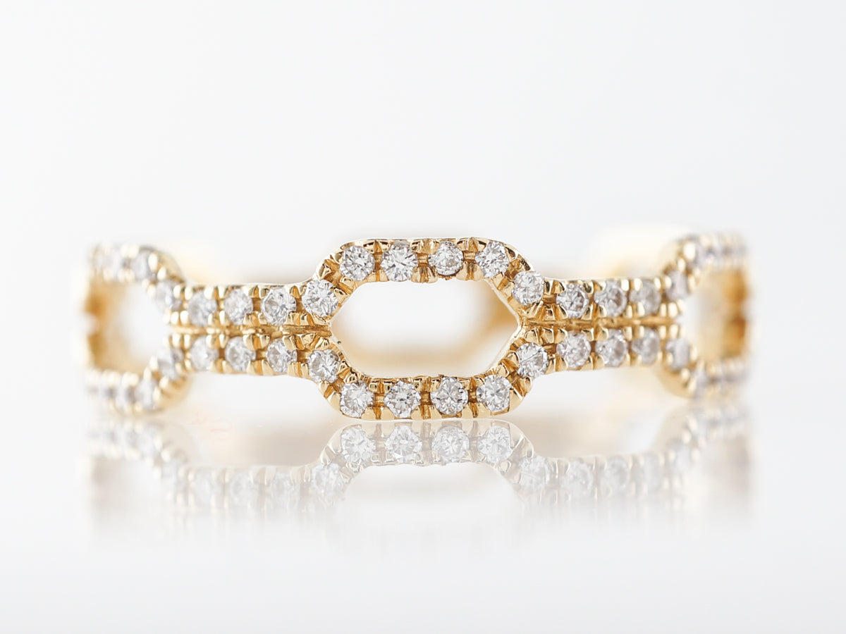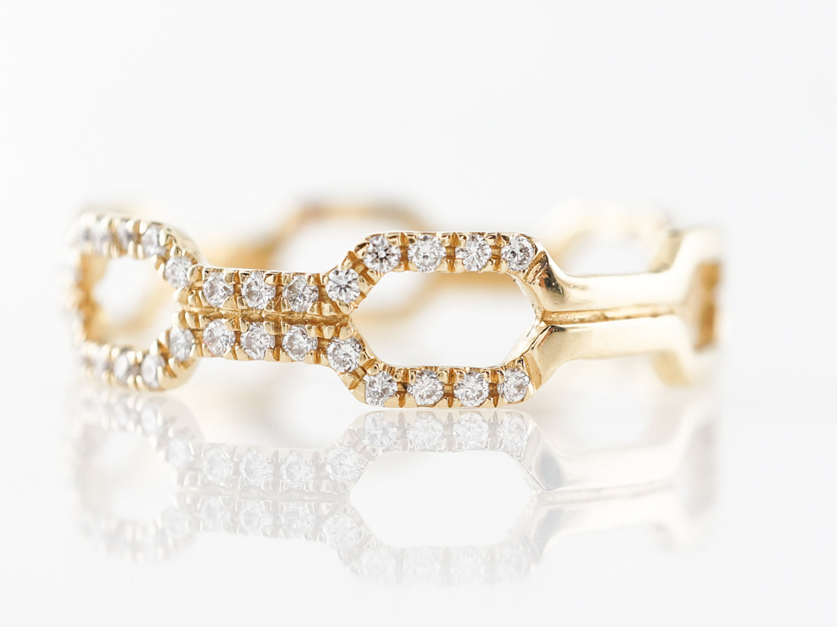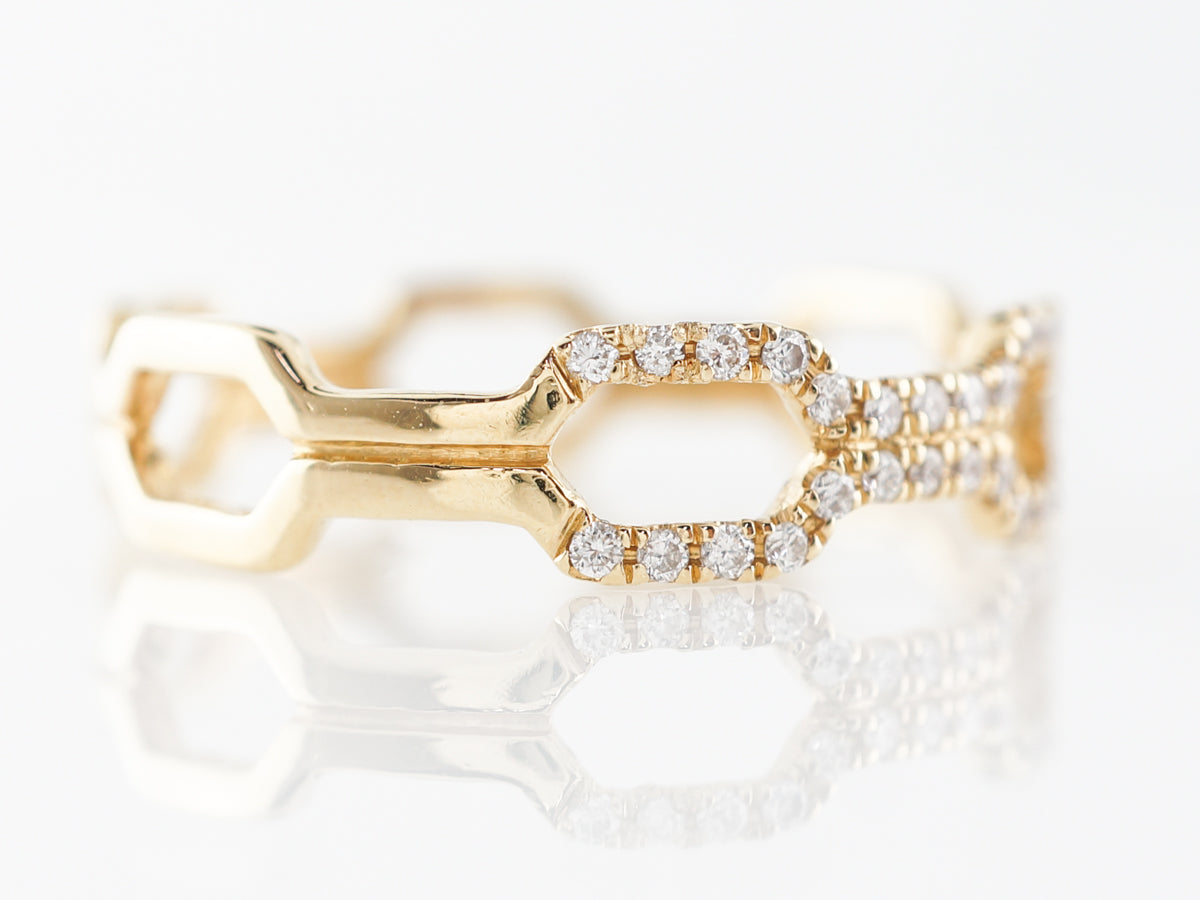 Pave Chain Link Diamond Ring in 18k Yellow Gold. This ring has two mirrored rows of sparkling diamonds set in 18 karat yellow gold. The round brilliant cut diamonds weigh .19 carat total weight. The rows of diamonds create a chain pattern that contains many open spaces, which would make it a perfect band for the right hand.