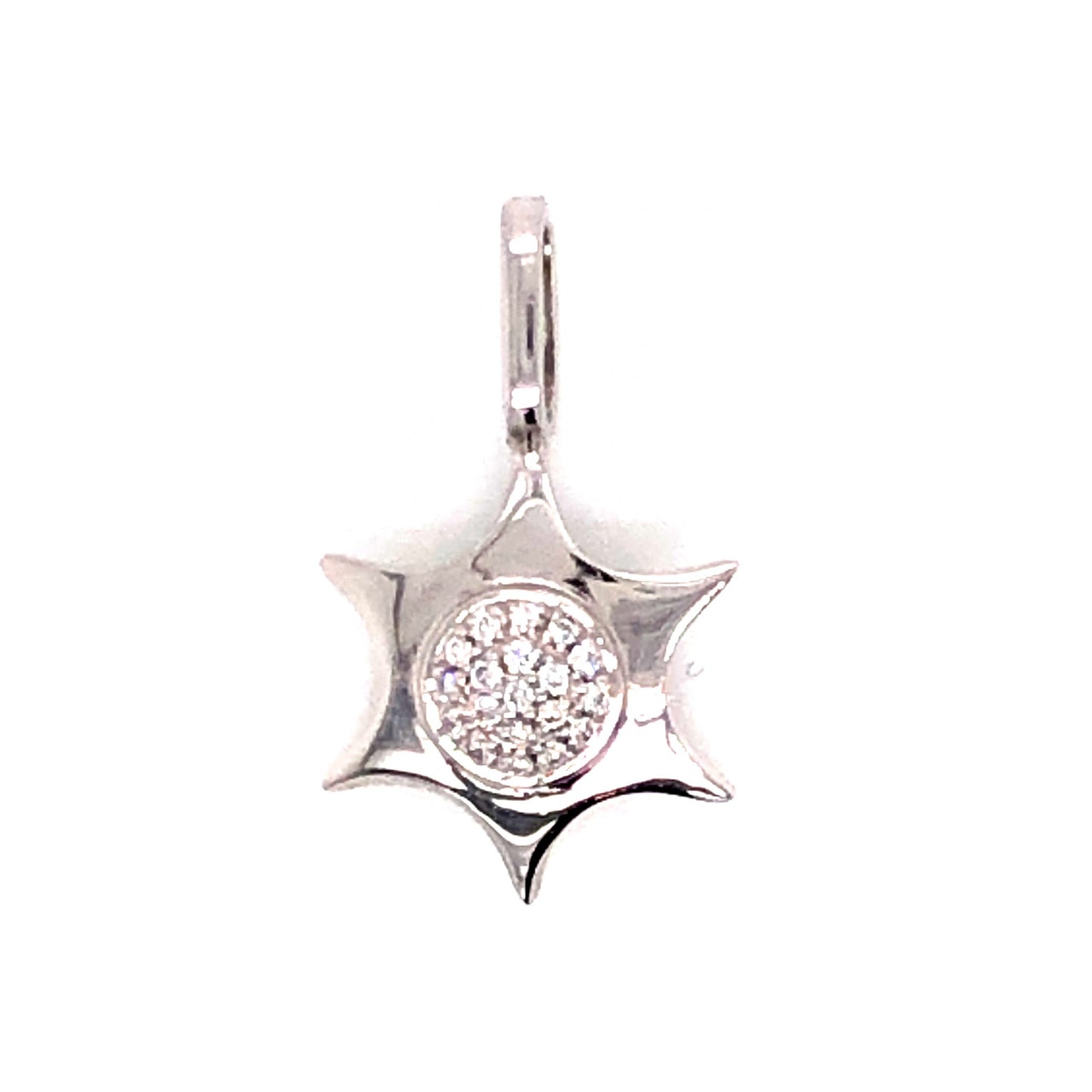 Pave Diamond Sun Pendant in 18k White Gold. This pave diamond sun pendant features .05 carats of diamonds finished in shimmering 18 karat white gold. Each of the nineteen (19) .0026 carat diamonds are near colorless and mounted in true pave form at the center of the sun. As a collection, these brilliant diamonds sparkle with elegance from the center of the high polished 18k white gold star.