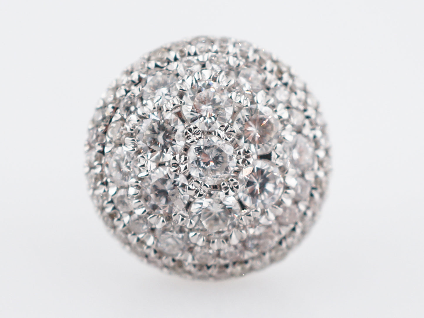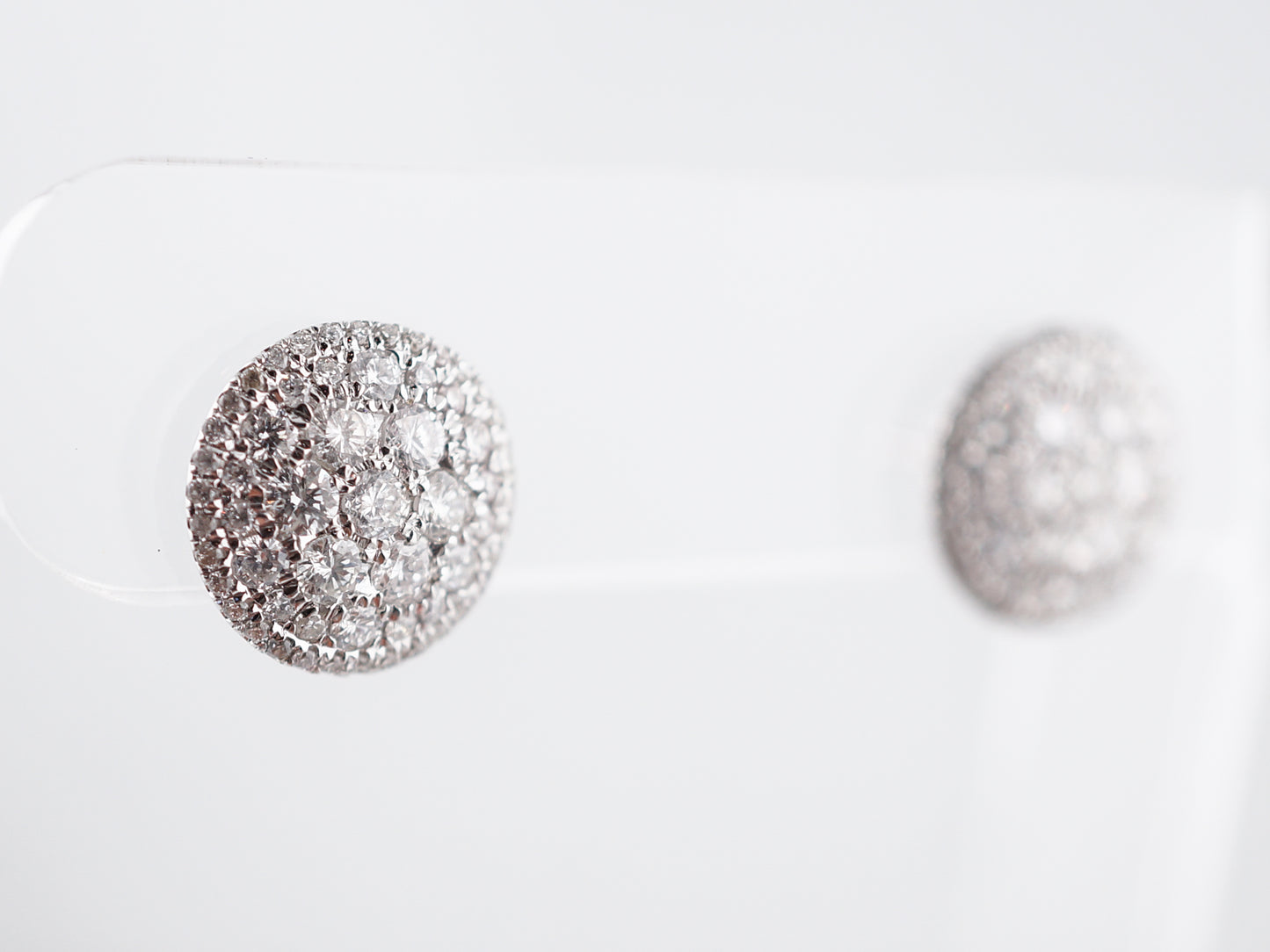 These beautiful pave set diamond earrings have a total carat weight of 1.55 carats and a varying stone size of 0.8-2.2mm. The smallest diamonds outline each earring increasing in size with largest diamond in the center of each earring. The disks that make up the structure of the earrings has a slight curve giving it a subtle dome like shape that adds dimension to the design. These earrings sparkle beautifully and are easy to wear.