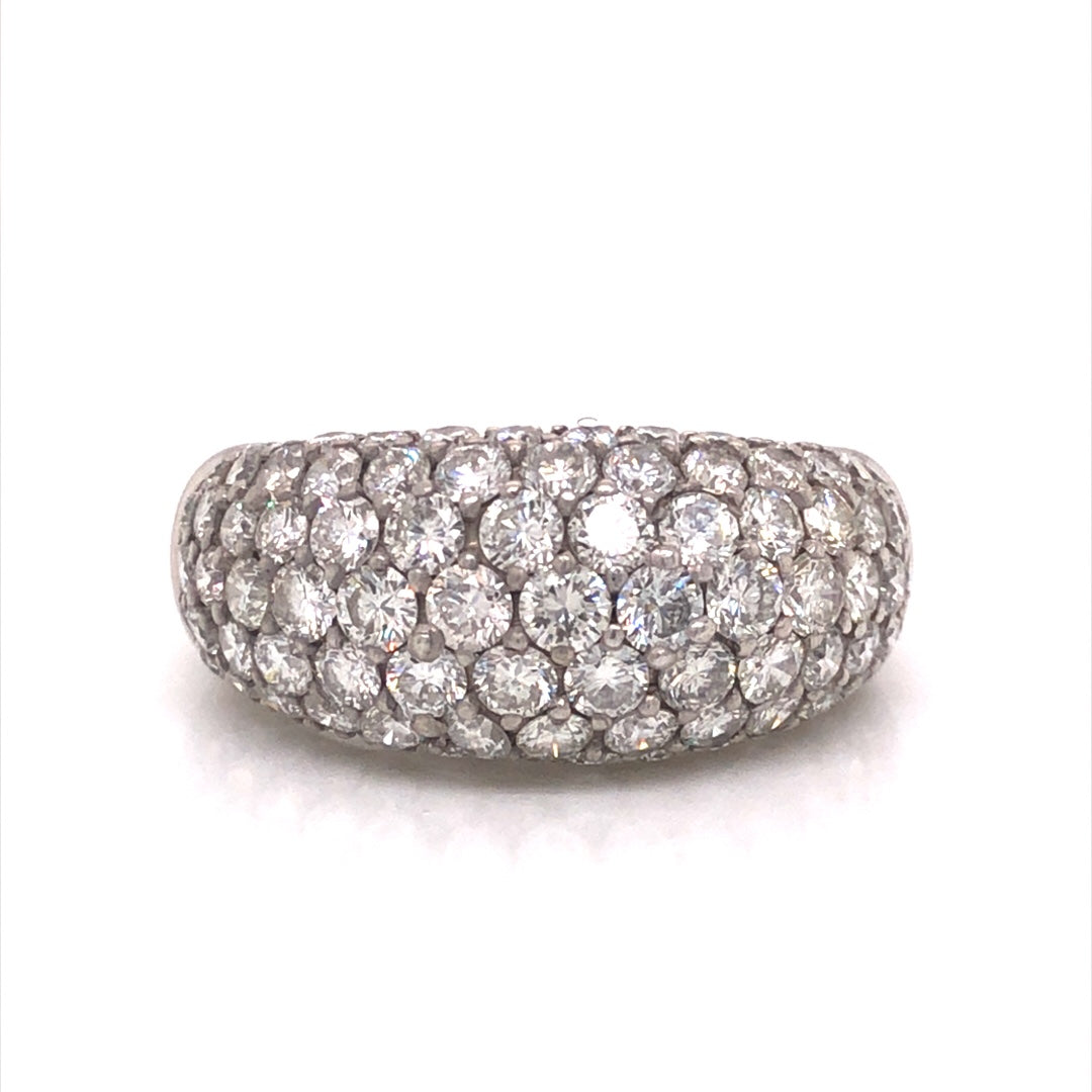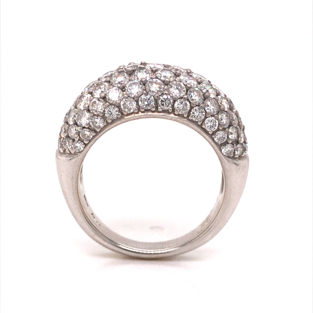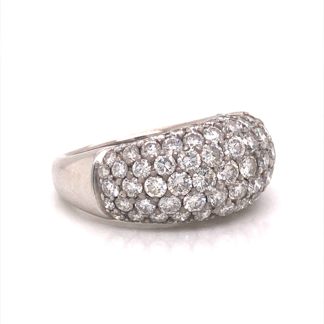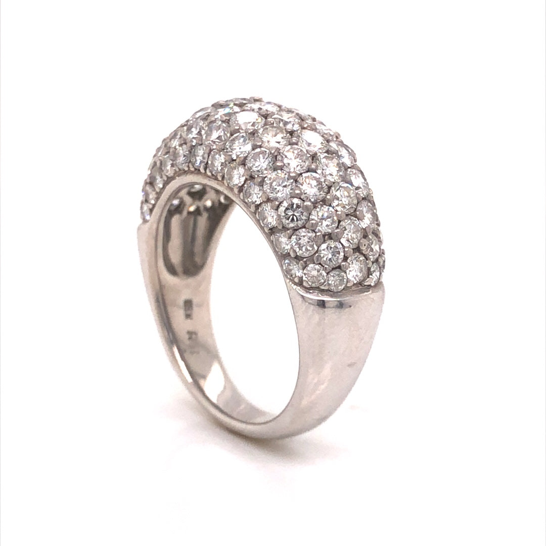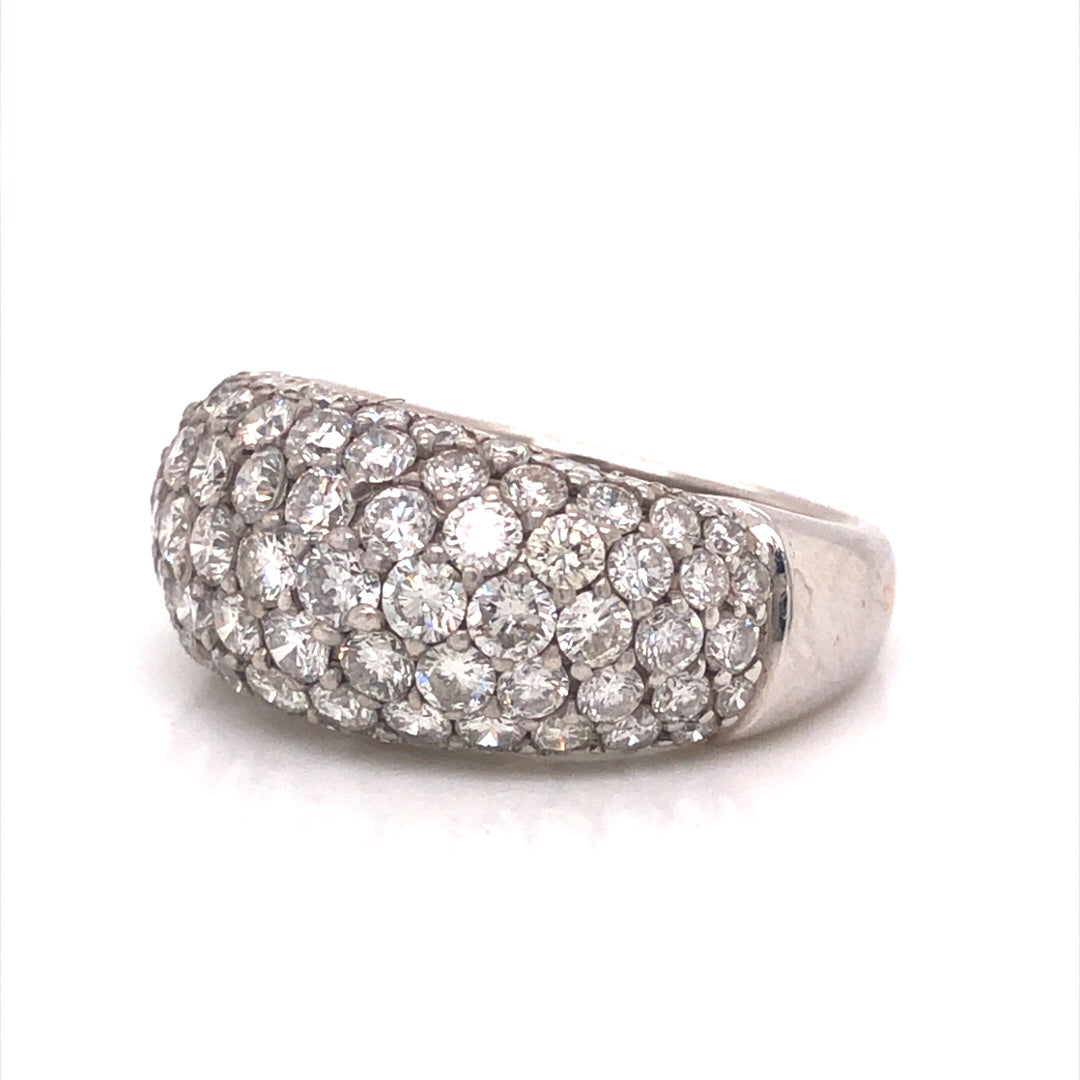 Dazzling in diamonds – this modern diamond cocktail ring features a pave of ninety-one (91) Round Brilliant cut diamonds in 18 karat white gold. The diamonds have an impressive colorless color grading (F) and are cut for maximum brilliance and fire. The band measures 10.41mm wide and is smoothly tapered. Comfortable to wear and sparkling from every angle. This ring would make a fabulous gift for a birthday or anniversary. A staple diamond ring that looks lovely on everyone!