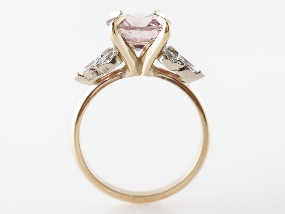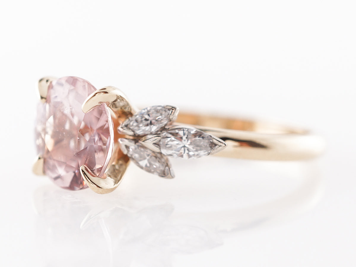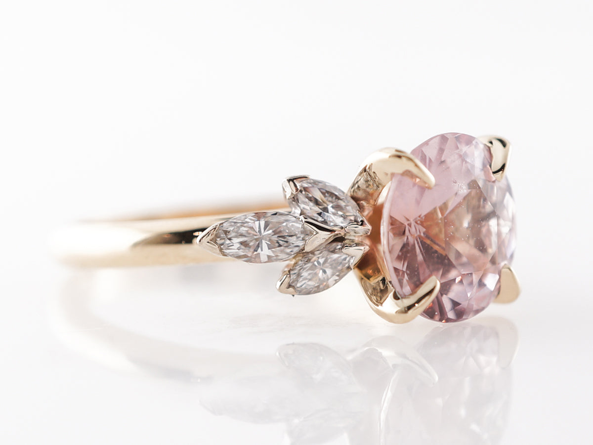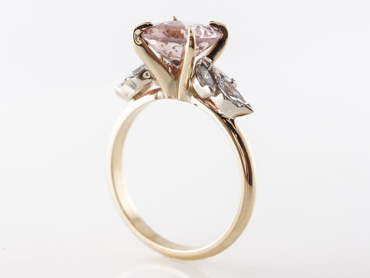 Peach Sapphire Engagement Ring w/ Diamonds in White Gold. Such a lovely 2.67 carat peach colored sapphire that is round cut and finished in 14 karat white gold and 14 karat yellow gold. This dazzling engagement ring features clusters of marquise shaped diamond arranged in the shape of flower petals set in 14 karat white gold. The simple polished yellow gold band and prong setting for the center stone work well to display the natural beauty of the gemstone.
