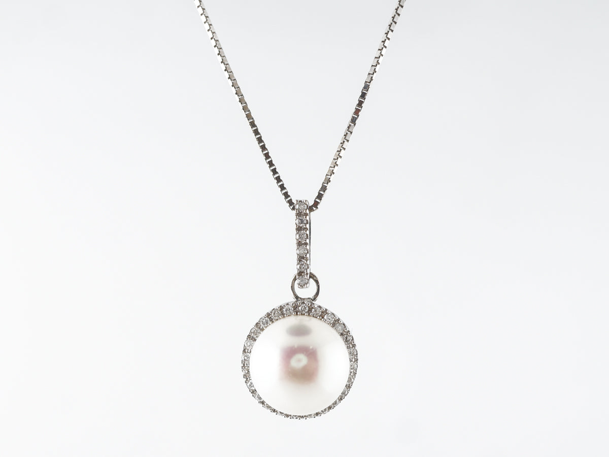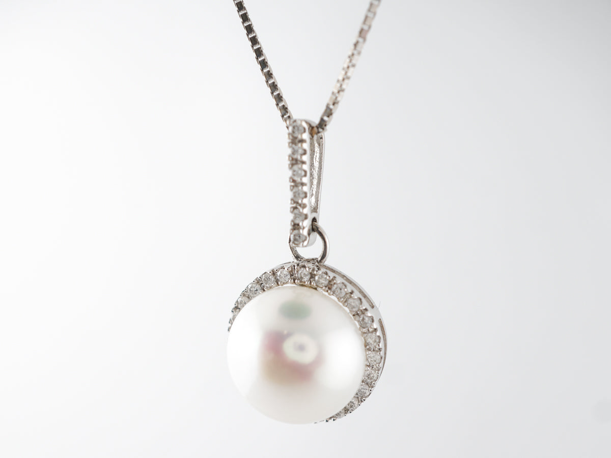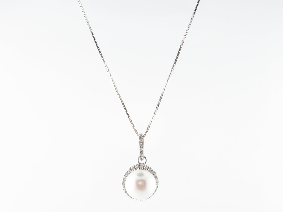 This classic pearl and diamond pendant features 12 mm cultured pearl in 14 karat white gold. The pearl has a wonderful high pink luster. The pearl is accented with round brilliant diamonds prong set creating a diamond halo. The bail of the pendant is also set with round brilliant diamonds. The total diamond weight is .15 carats. The pendant freely slides on the petite box chain.