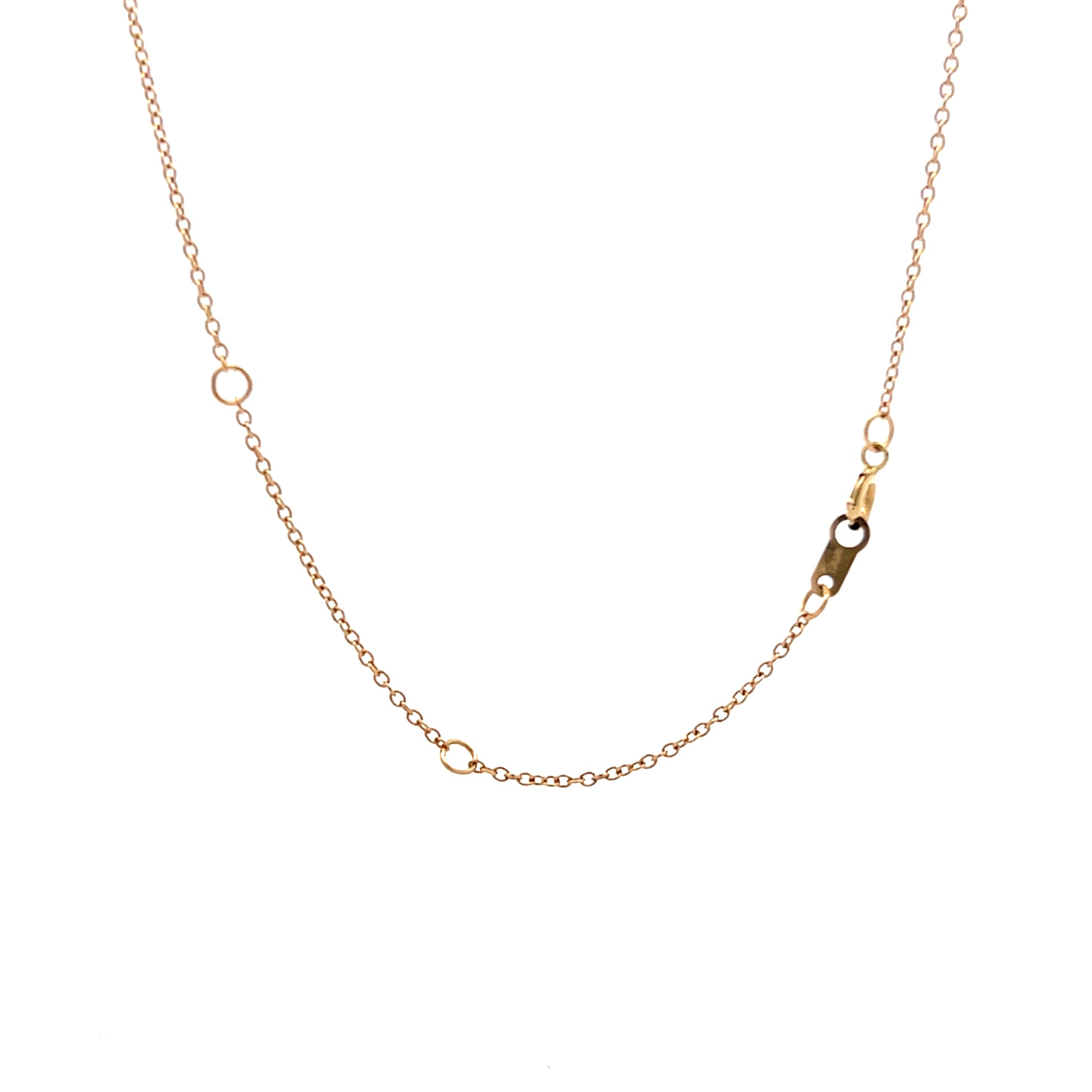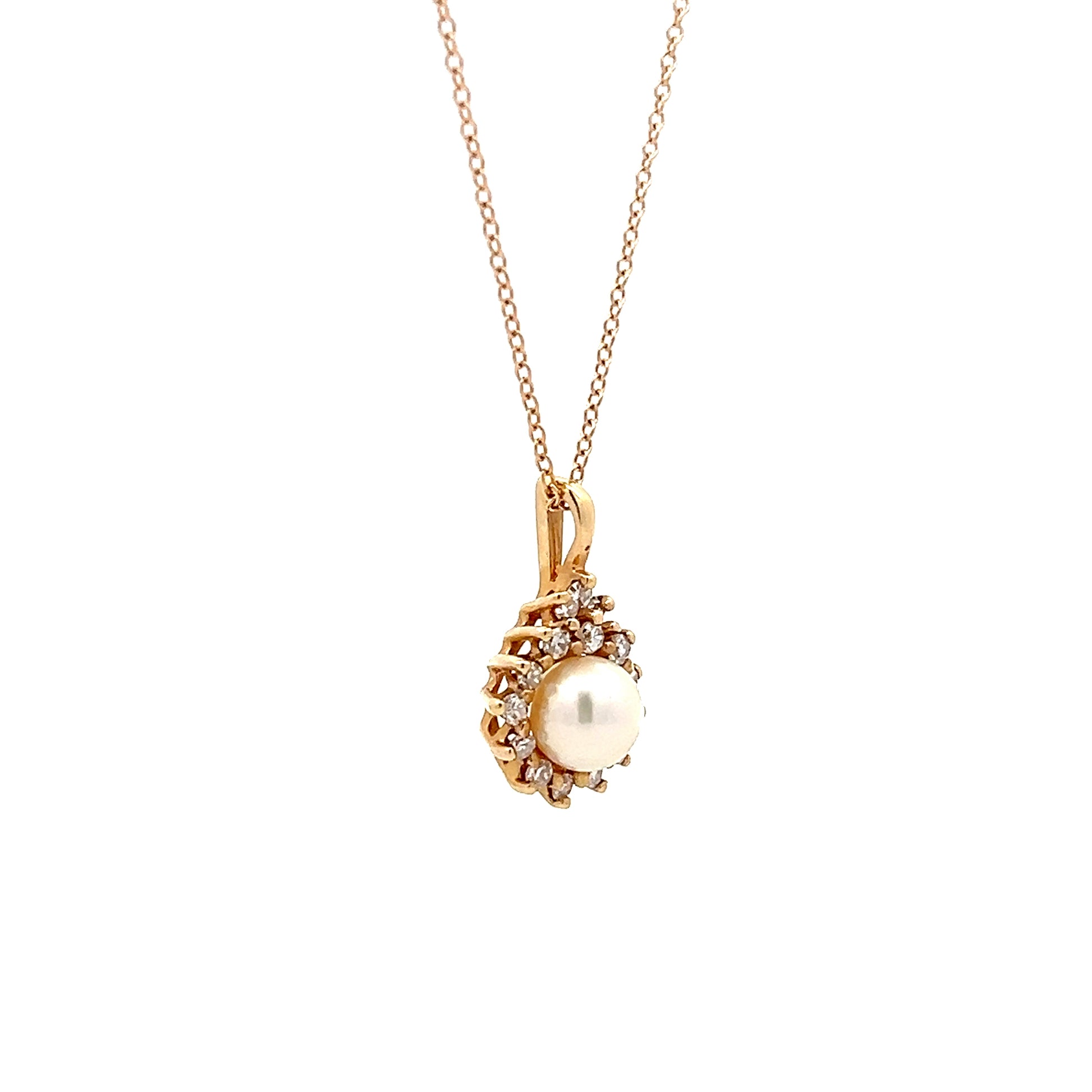 This 14 karat rose gold pendant necklace features a 5.75mm pearl at the center, surrounded by a halo of 15 round brilliant cut diamonds. The diamonds, each measuring 1.5mm and totaling .22 carats, are prong set to maximize their sparkle. The combination of pearl and diamonds creates a striking contrast, blending soft luster with radiant shine.