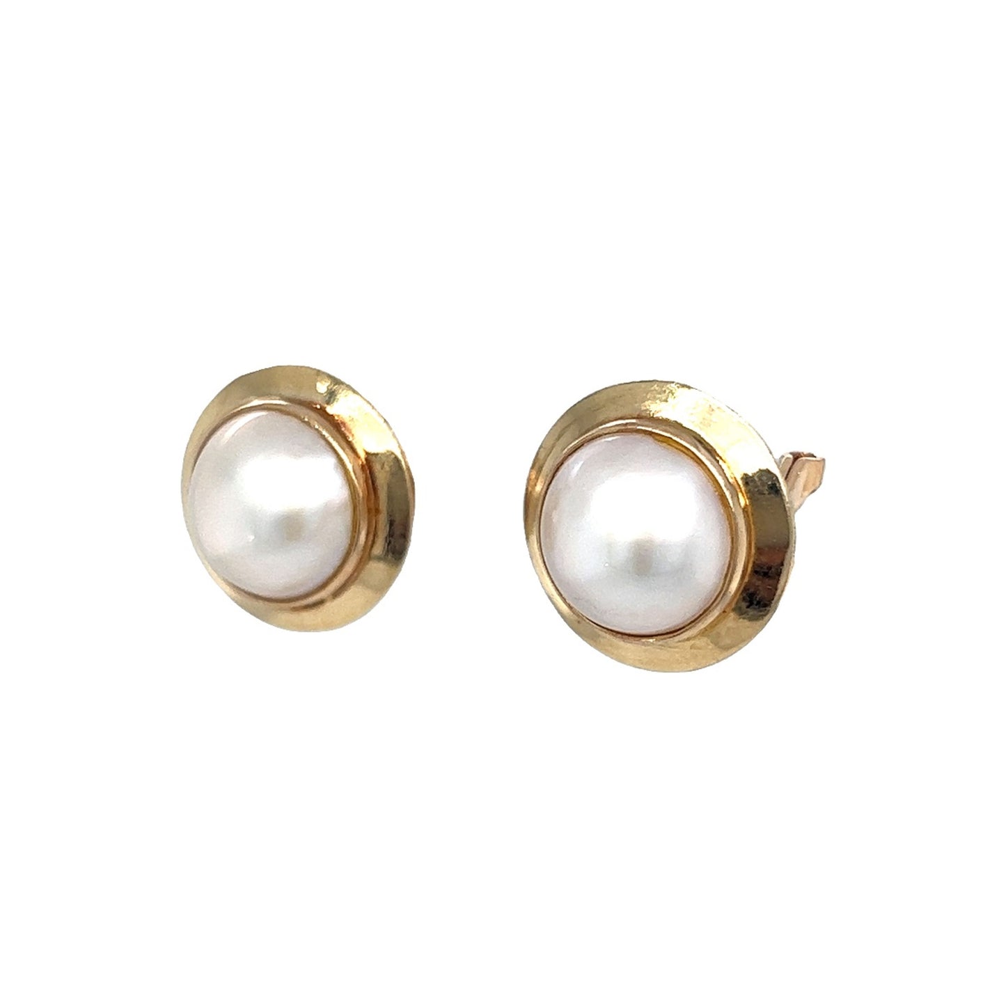 These modern pearl earrings feature two cultured pearls in 14 karat yellow gold. The pearls, each measuring 8mm in diameter, reflect an iridescent ivory hue. The pearls are expertly set in a simple, yet stylish, stud earring design. Finished on a secure post and butterfly backing, these earrings are lightweight and comfortable and great for everyday wear.