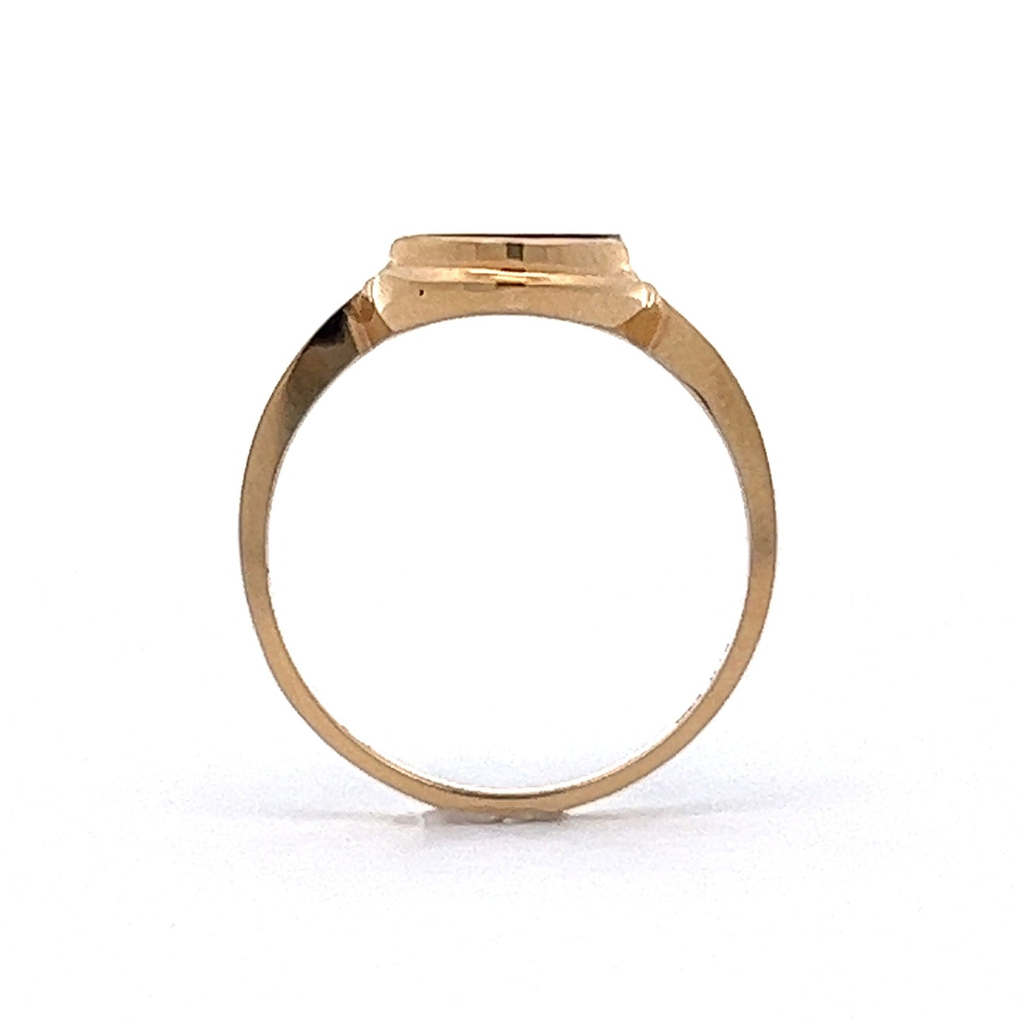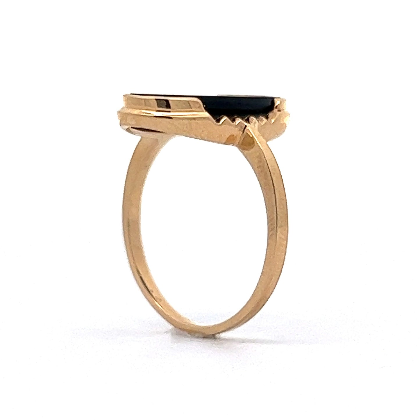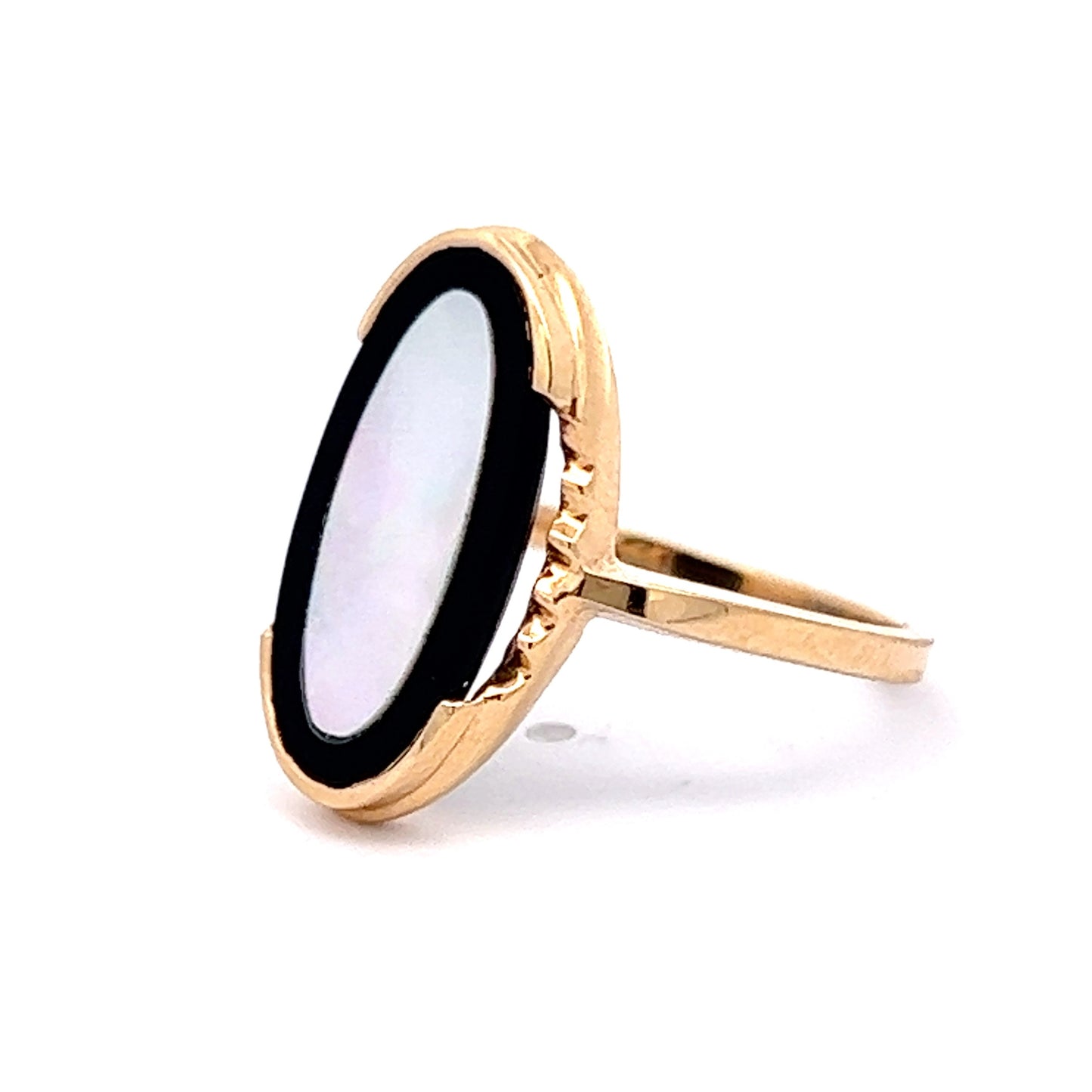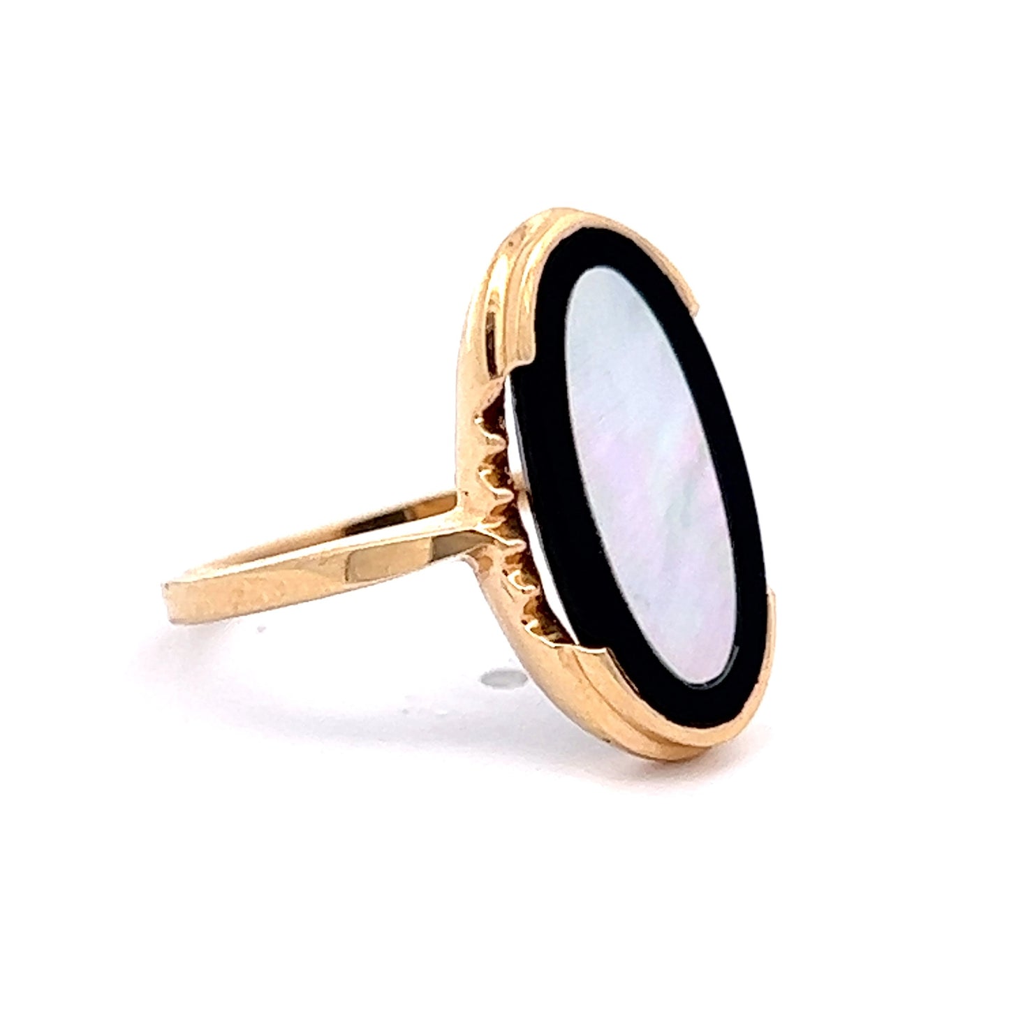 This Mid-Century Mother Of Pearl And Black Onyx Cocktail Ring in Yellow Gold is truly an elevated ring that is sure to make a statement. Crafted in warm 14 karat yellow gold, this oval shaped ring features a mother of pearl inlay and stunning black onyx trim. Two toned, mixed gemstones for a light and dark color complement. The precious gems are set in an engraved bezel with a soft geometric touch. Sleek, geometric, and classy, finished in warm 14 karat yellow gold.