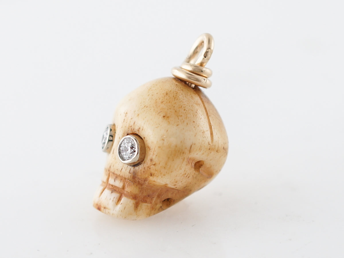 Skulls can symbolize many different things from mortality to eternity. This skull charm is made with bone and has round brilliant cut diamonds for eyes. The diamonds total .16 carat. This meaningful charm can serve as a talisman to celebrate life or to memorialize someone who has passed.