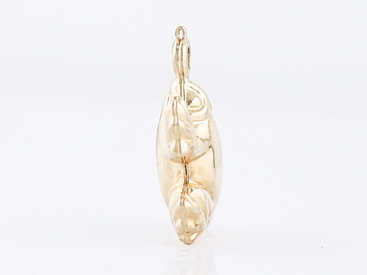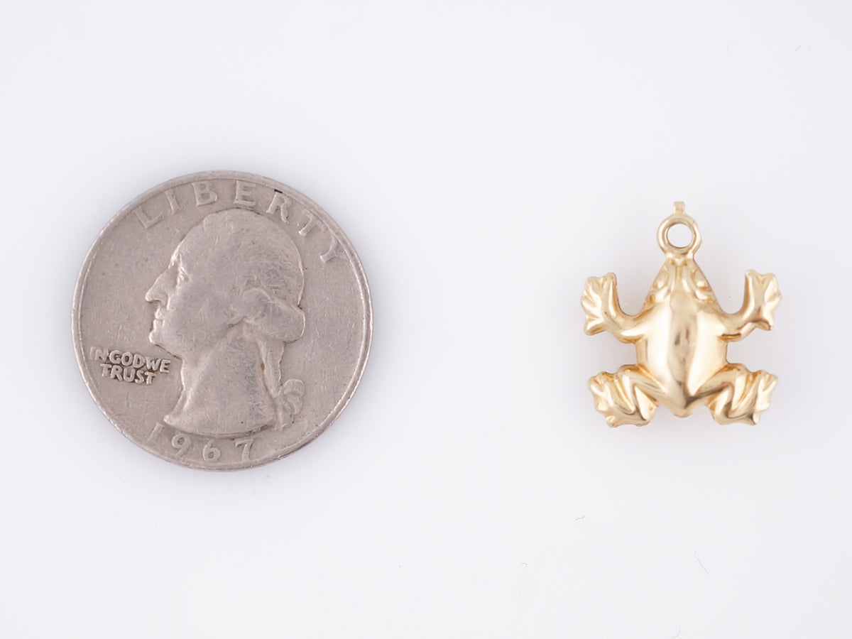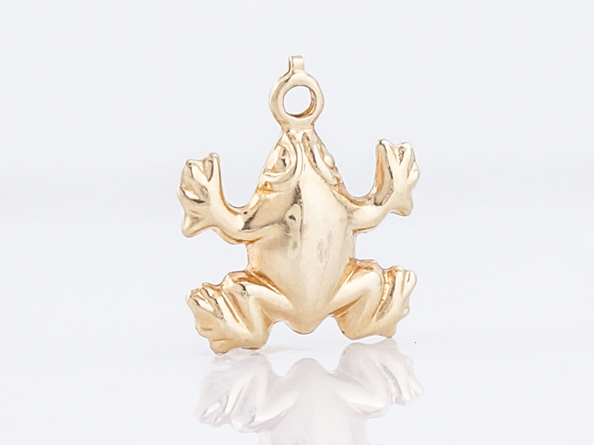 Another sweet creature pendant Charm. This frog charm is from the Modern era and is crafted of 14k yellow gold. Throughout time the frog has been an endearing symbol in folk tales and stories. With or without associated meaning this frog pendant charm is darling and unique.