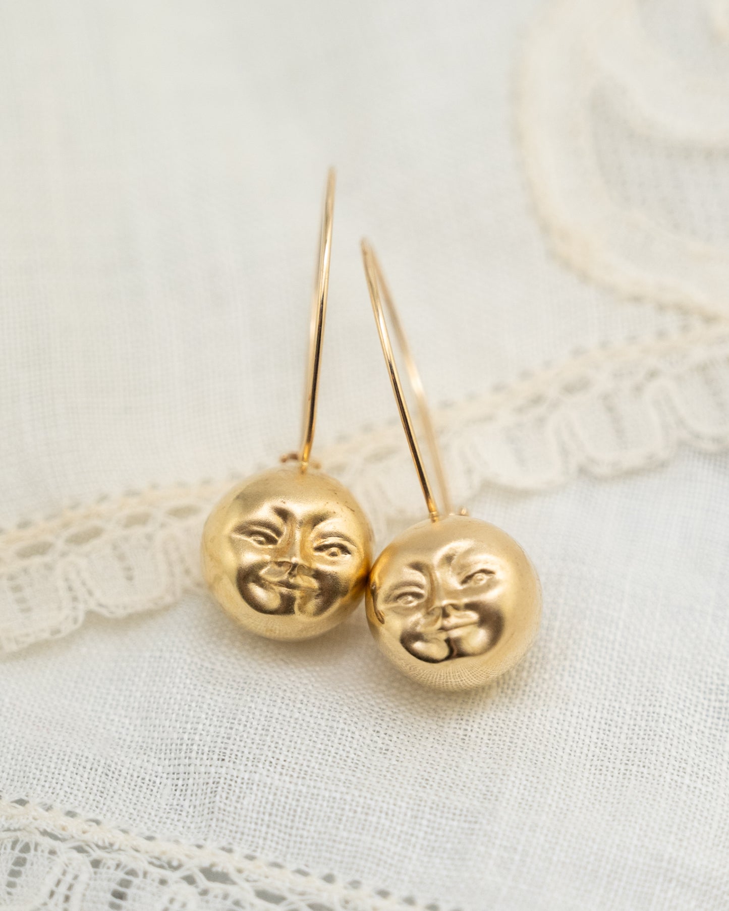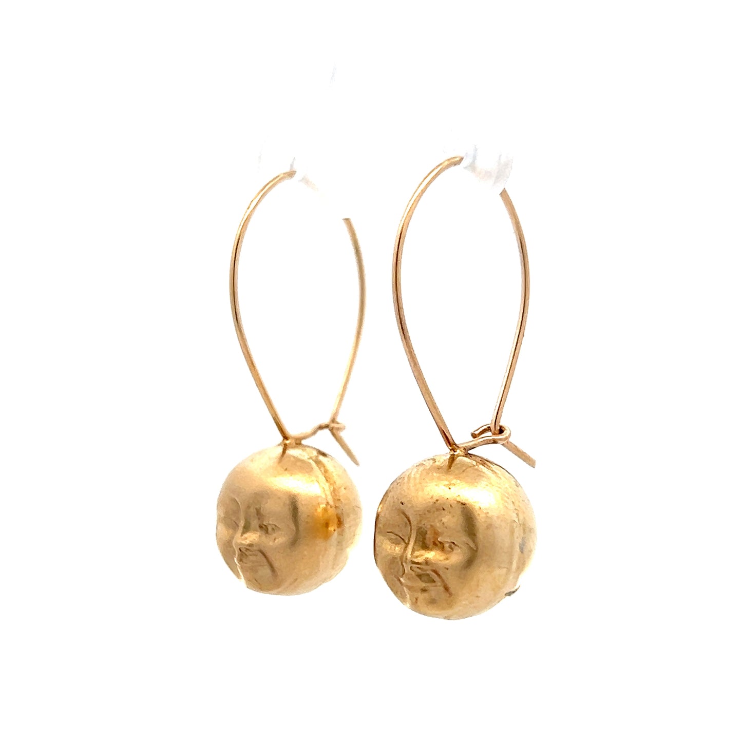These Peter Brams designed drop earrings feature a moon face shape made from 14 karat yellow gold. The hollow design keeps these earrings lightweight for comfort. Measuring 1.25 inches long, they hang from ear wire attachments that allow them to move freely.