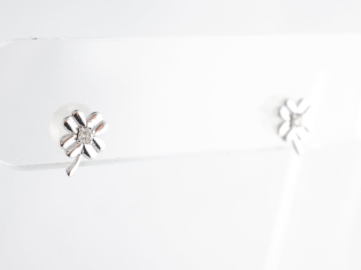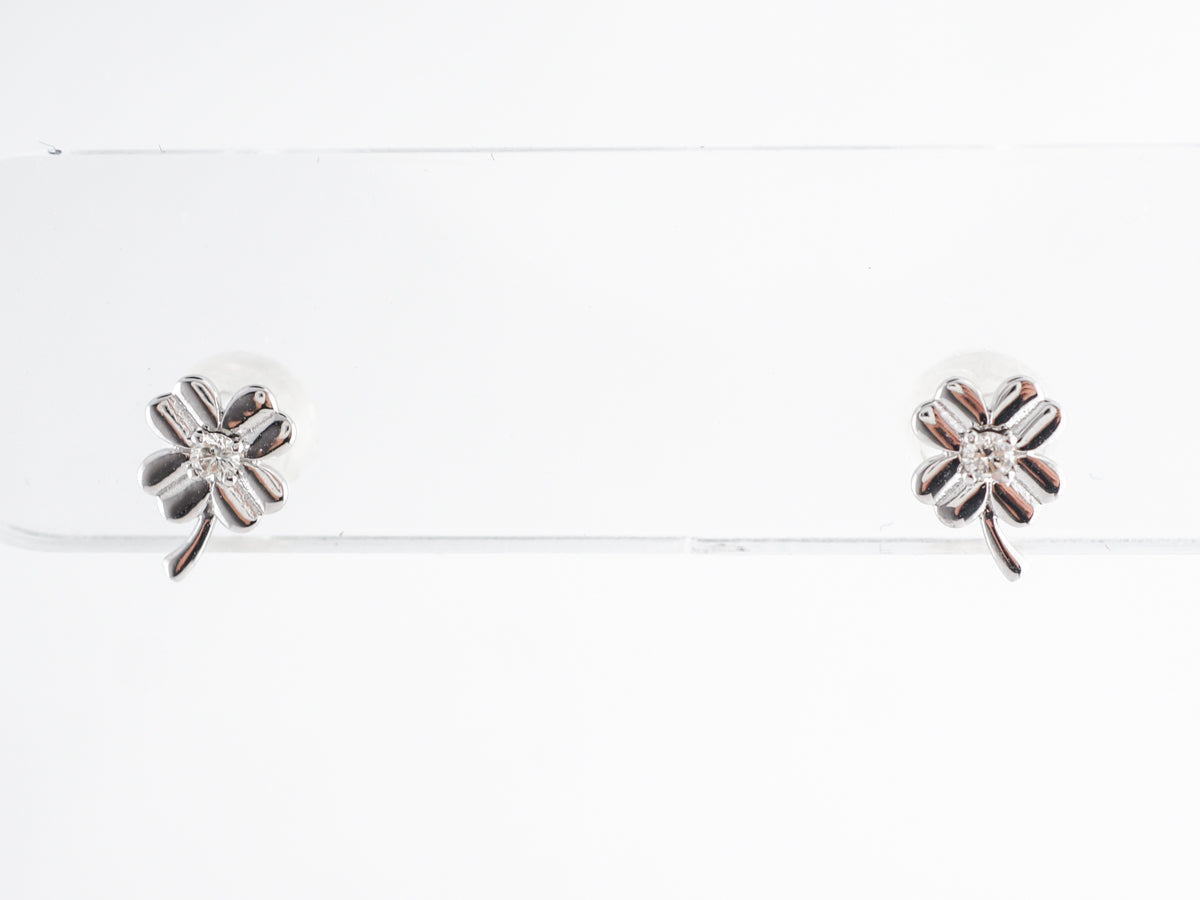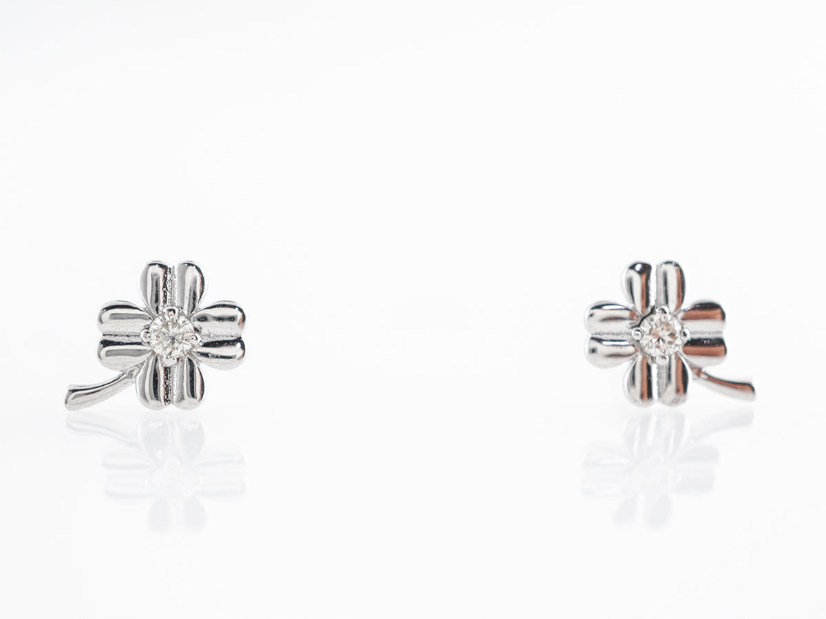 Petite Diamond Stud Earrings in 14k White Gold. These lovely little diamond stud earrings feature .05 carat brilliant cut diamonds set in 14 karat white gold. The design resembles bright little clovers and would be a great addition to any jewelry collection! A versatile size that is able to be worn actively or dressed up for a special occasion.