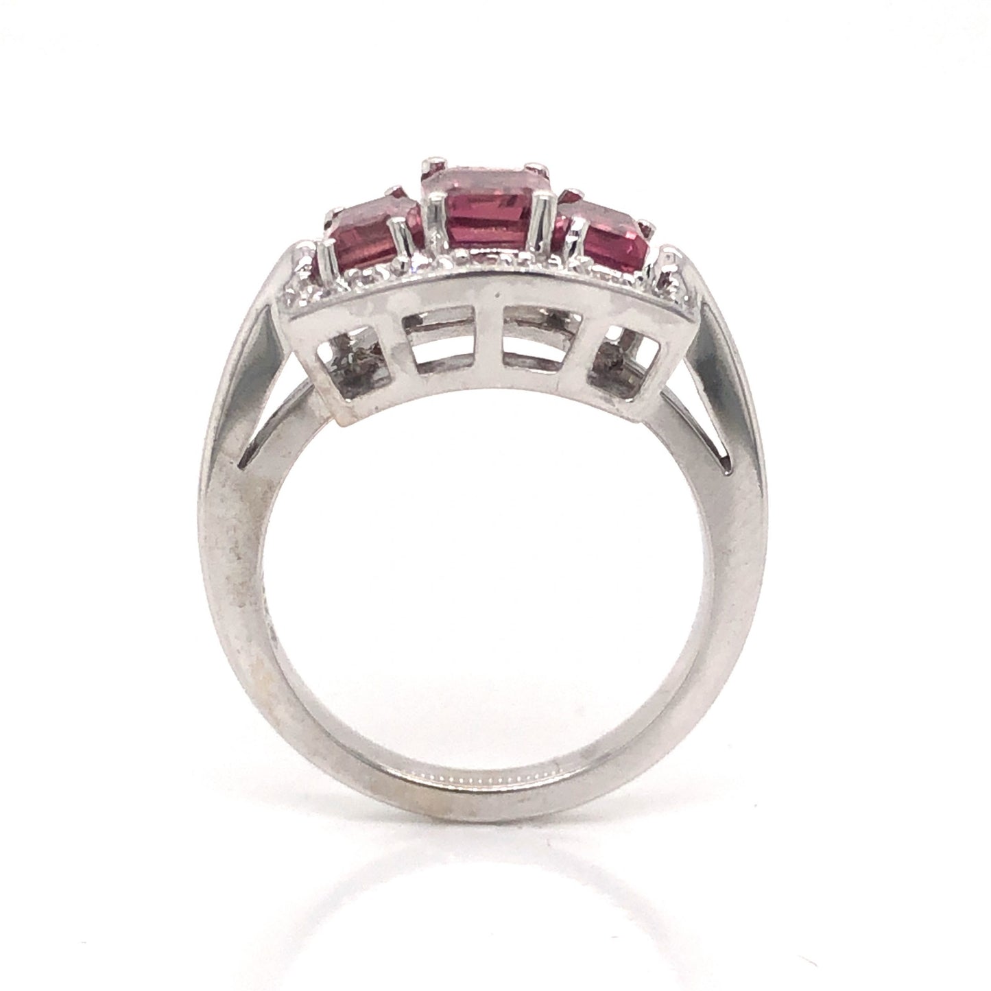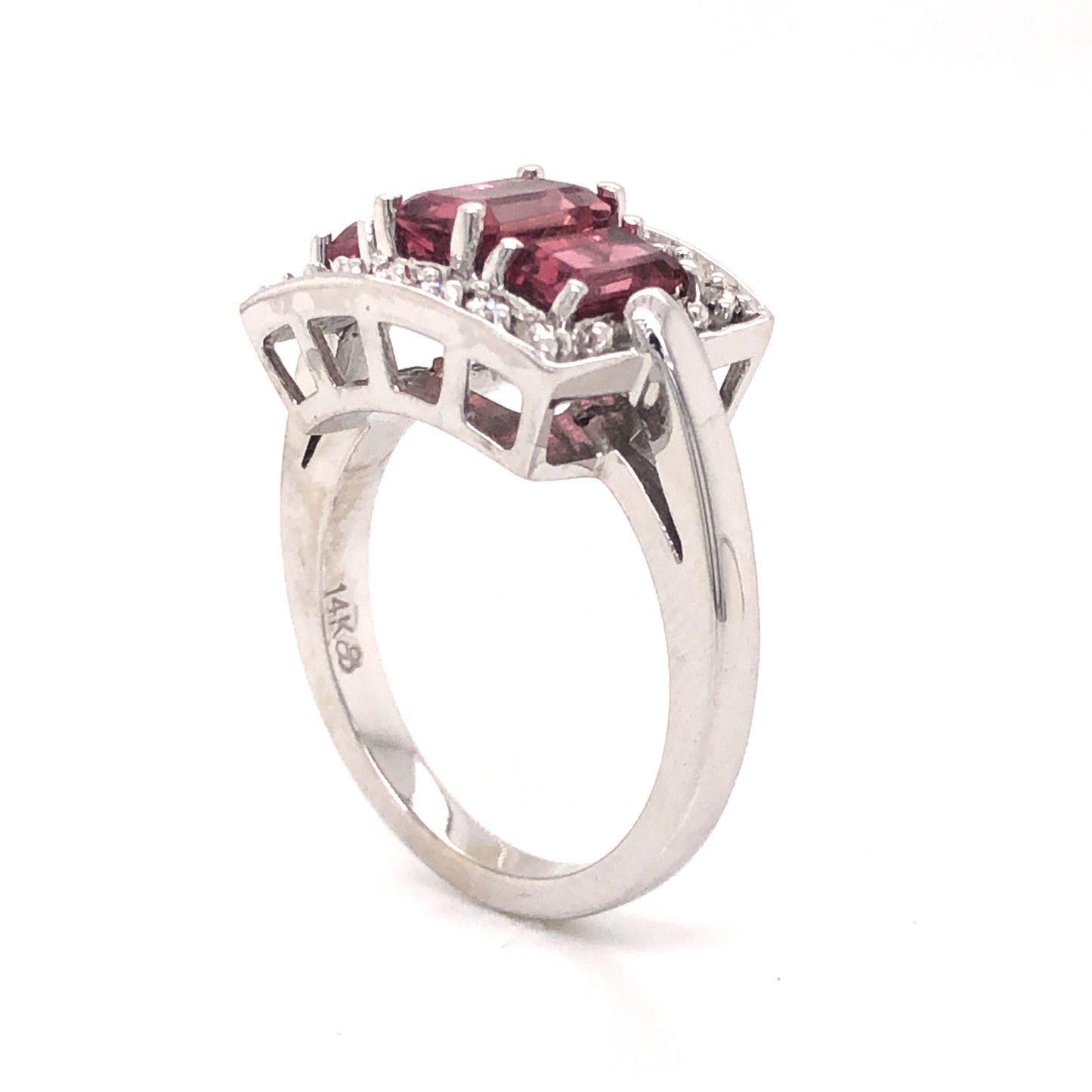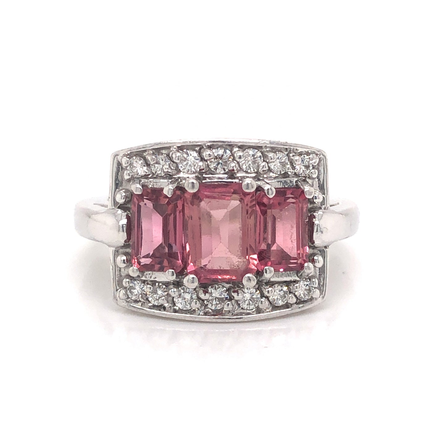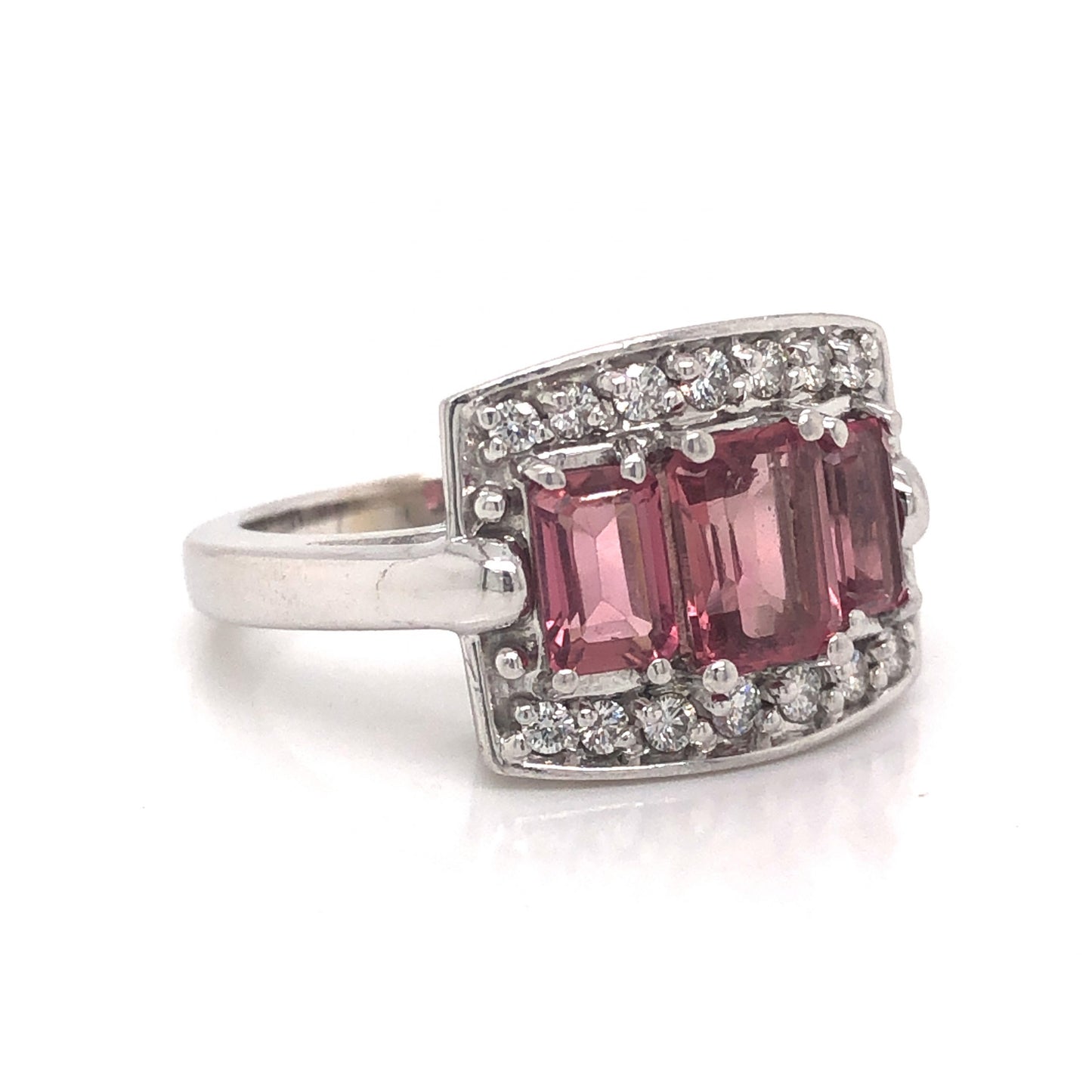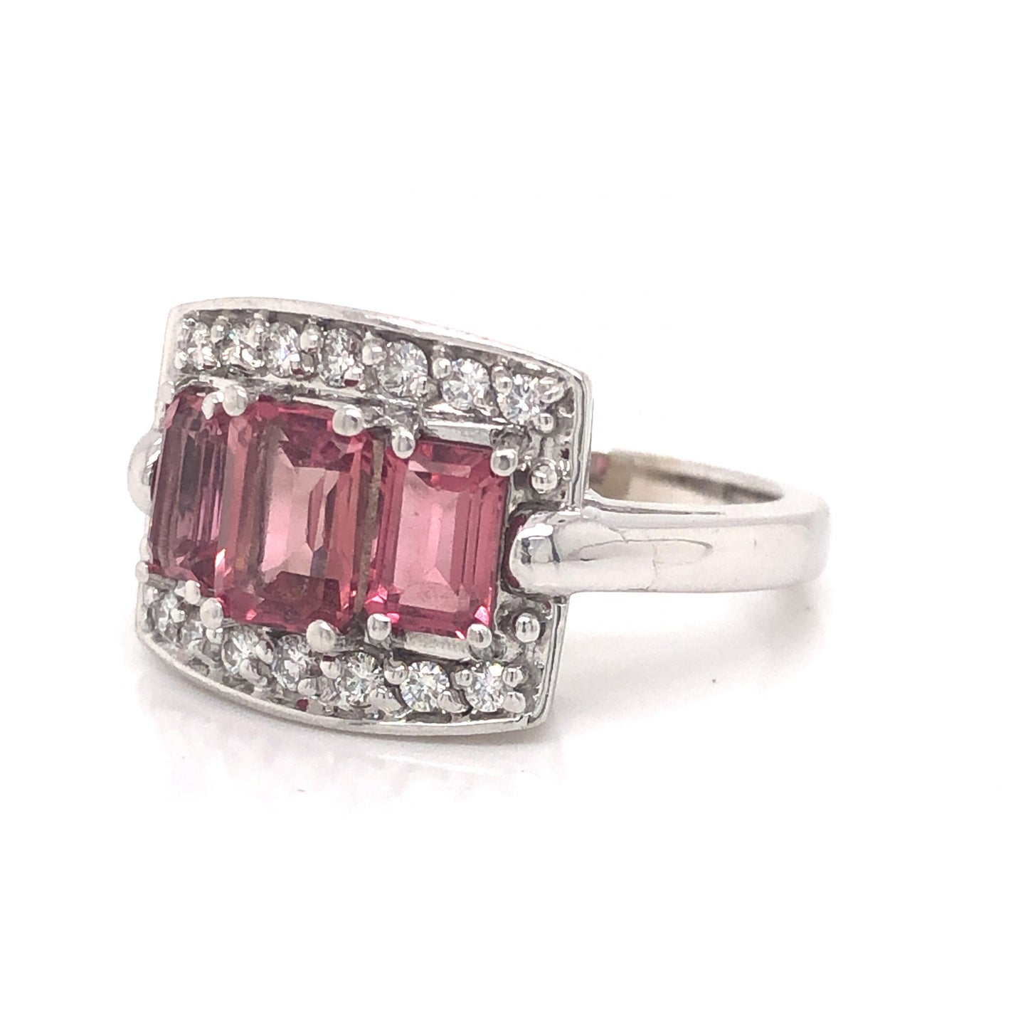Pink Tourmaline Diamond Cocktail Ring in 14k White Gold. This chic cocktail ring features 2.03 carats of pink tourmalines and accent diamonds finished in 14 karat white gold. Three (3) emerald cut tourmalines, with a medium-dark rosy hue, are set in prongs in the center of a boxy white gold mounting. Fourteen (14) Round Brilliant cut near colorless diamonds are bead set around the tourmalines, giving the ring a collective brilliance against the deep pink center stones.