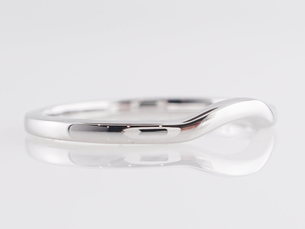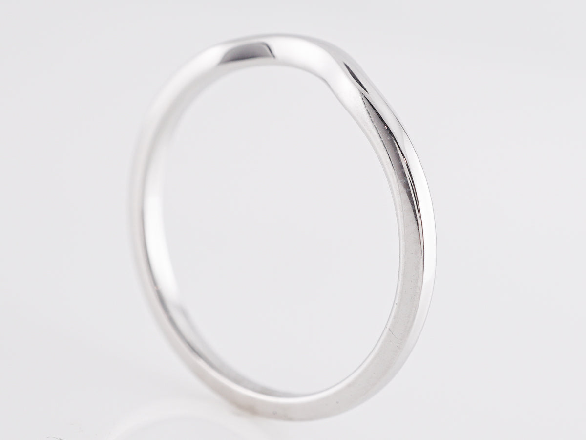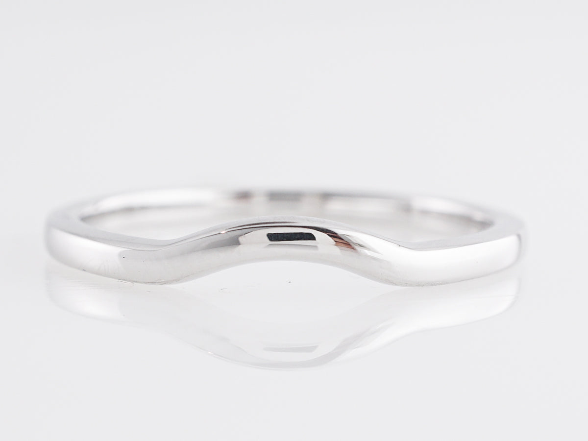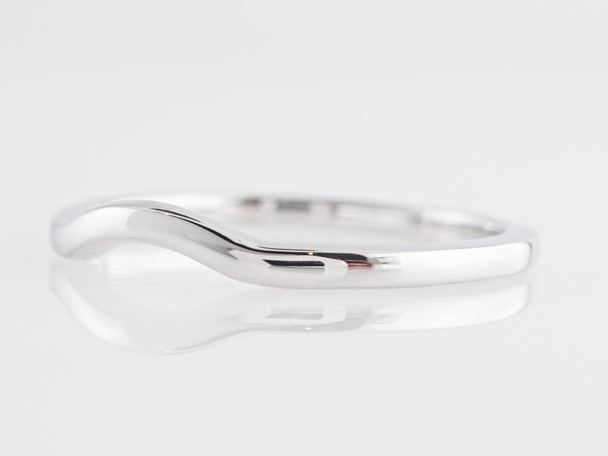 Plain Curved Wedding Band in 14K White Gold. This simple curved wedding band will fit comfortably next to the center stone of your engagement ring. This modern, white gold ring is polished to perfection and has a soft, rounded notch in the center of the band. This monochrome ring represents the beauty of efficiency and elegance. Shop our catalogue of wedding bands here!