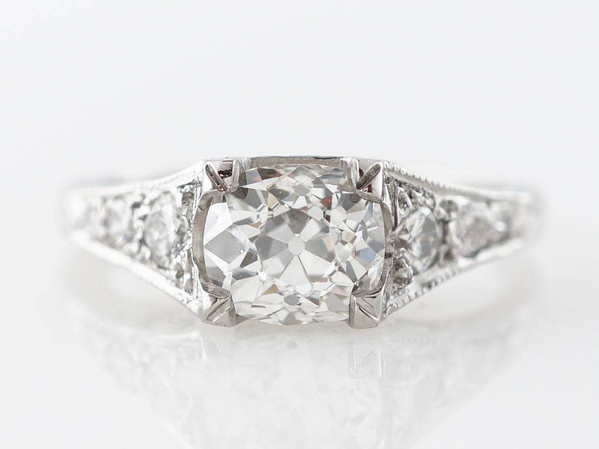 Platinum Art Deco Engagement Ring w/ Cushion Cut Diamond. This vintage Art Deco ring features a beautiful 1.12 carat cushion cut diamond and is set in platinum. The center stone is set with split prongs and completes an attractive gentle profile. There is nice open work on the sides below the basket and the shoulders which allows plenty of light into the 1 carat diamond. Such a lovely ring that will be cherished for a lifetime!