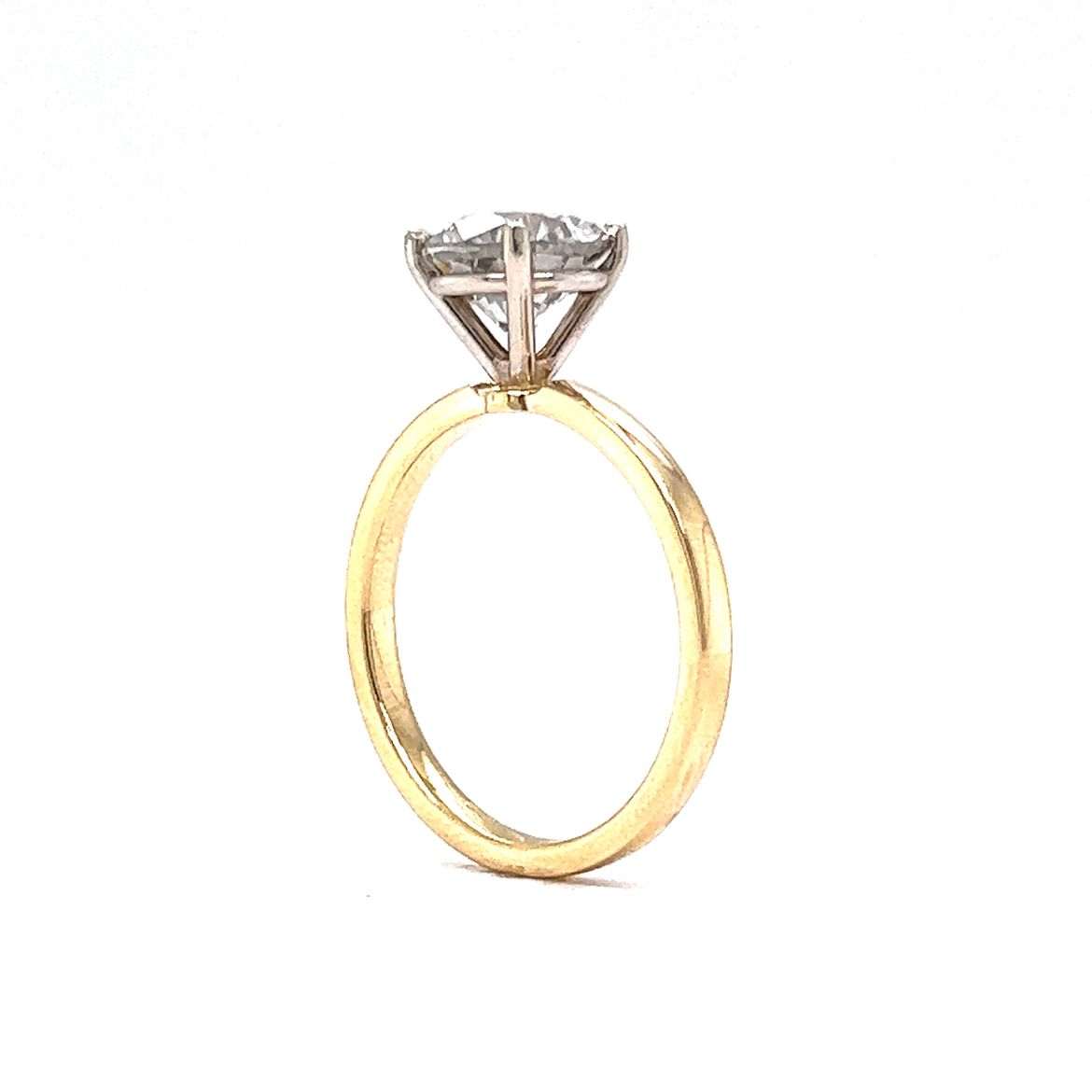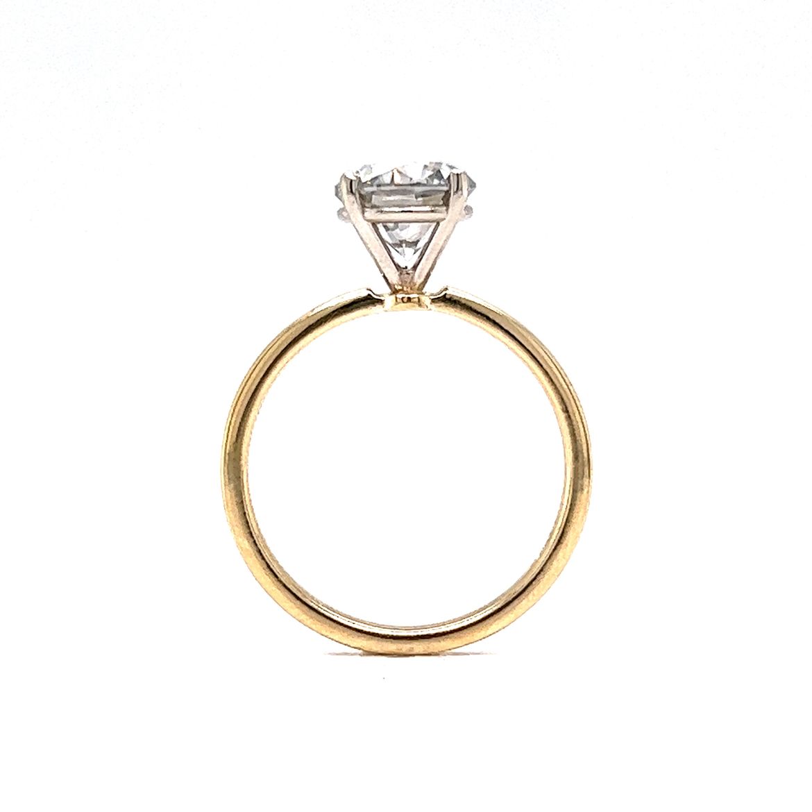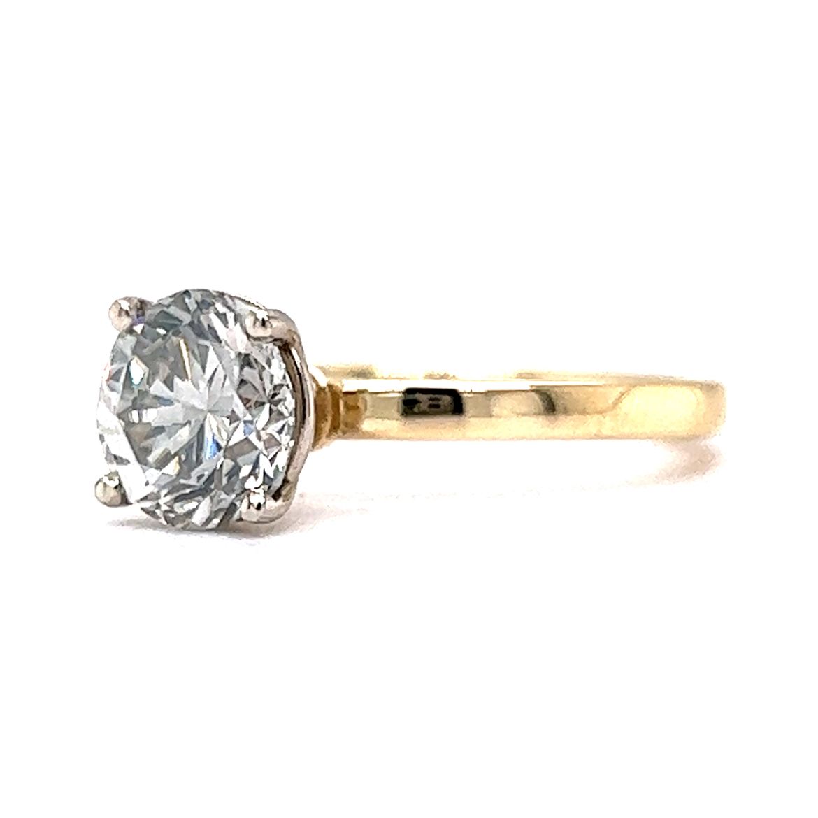 This 1.94 carat solitaire diamond engagement ring is from our "By Filigree" line and is finished in 14k yellow and white gold. This ring features a round natural diamond as the primary stone, weighing in at 1.94 carats. The solitaire style of the ring is perfect for those who want their diamond to take center stage as it showcases the brilliance of the stone from every angle.