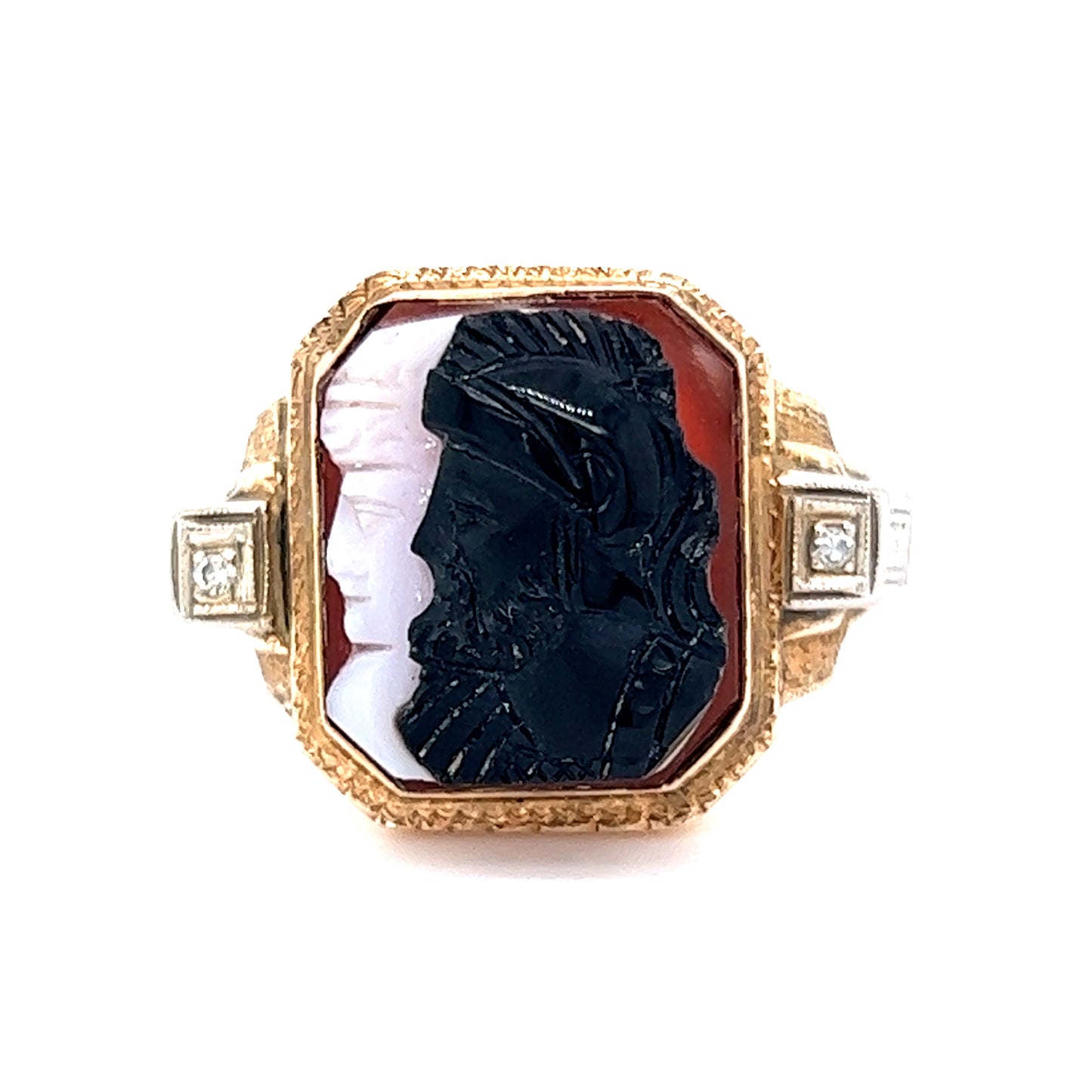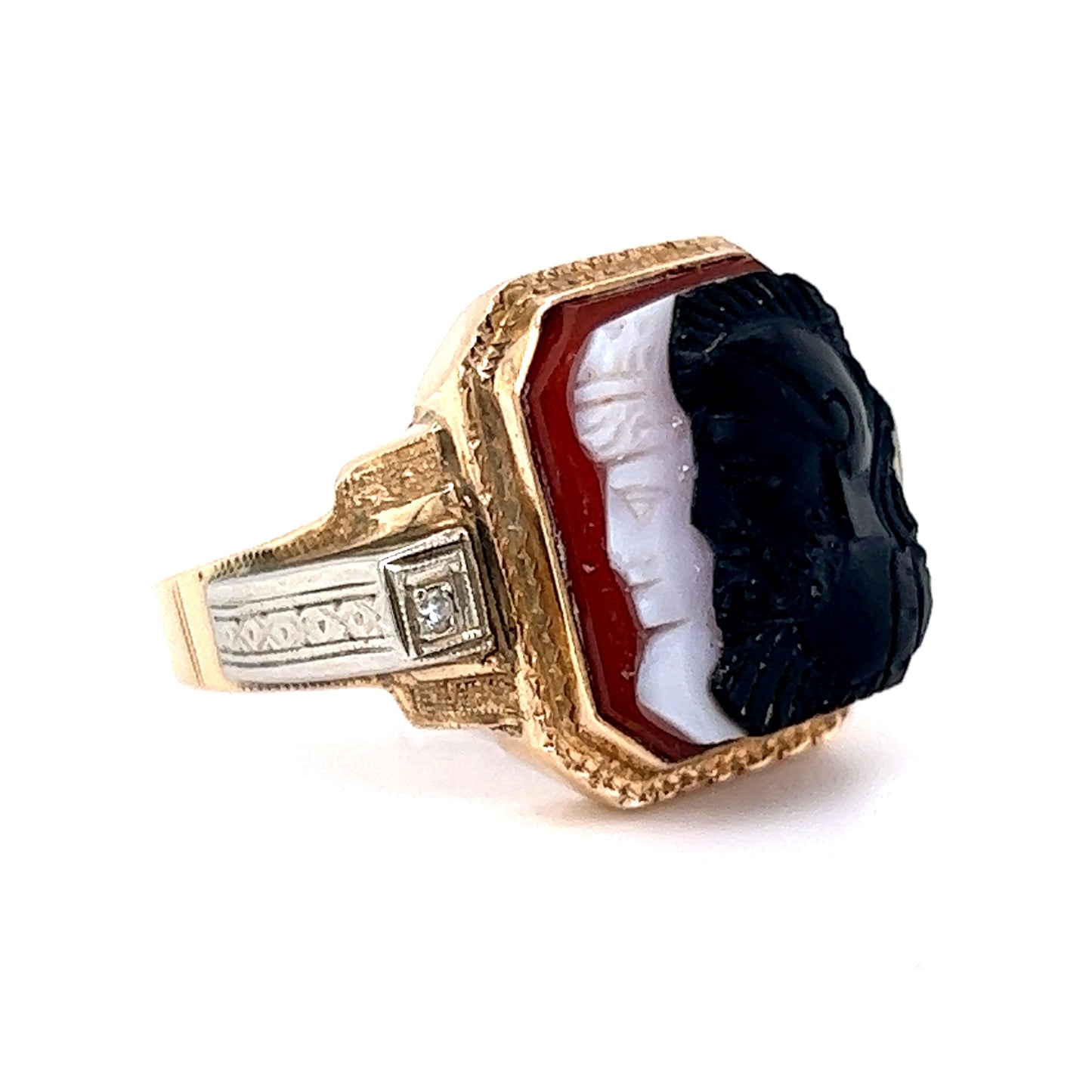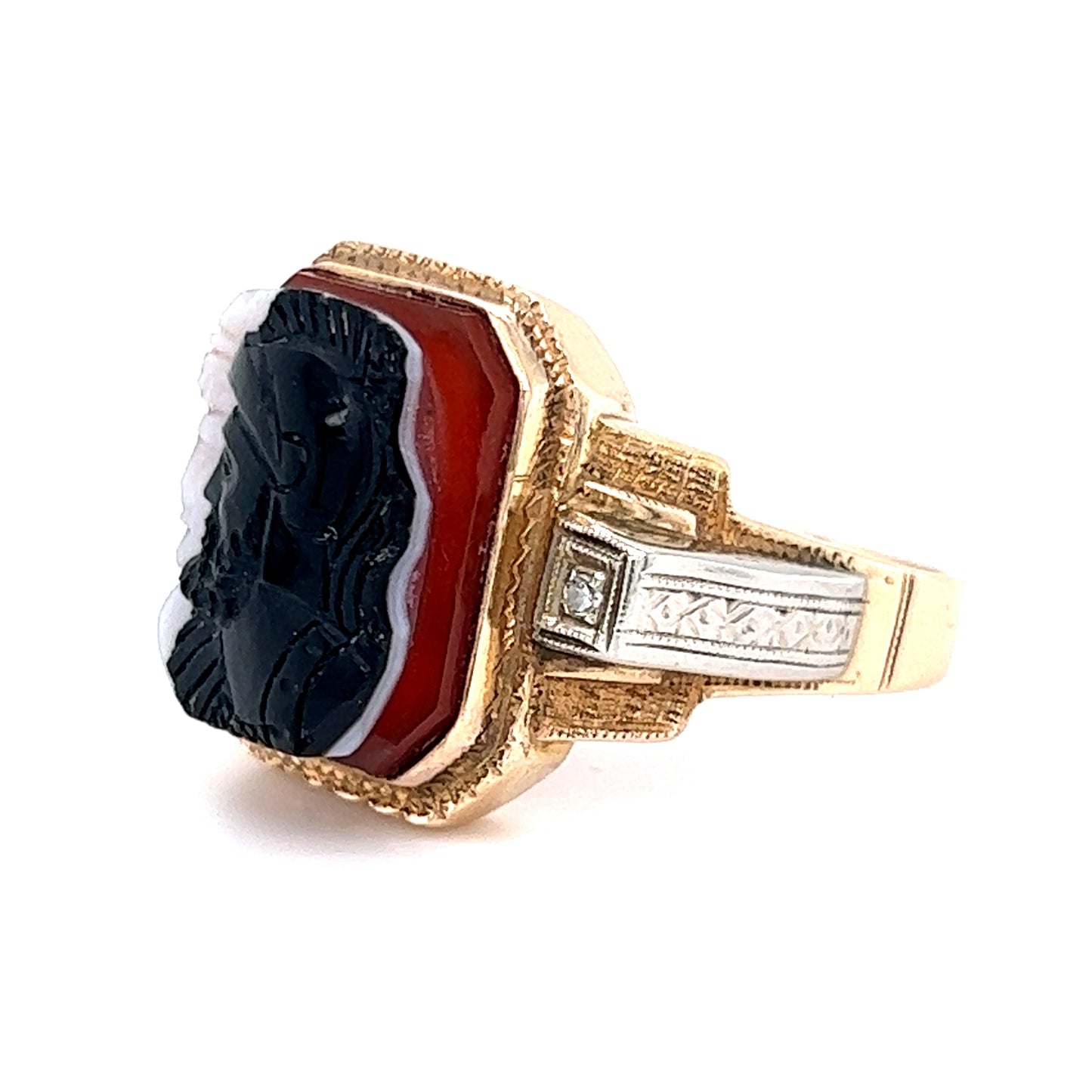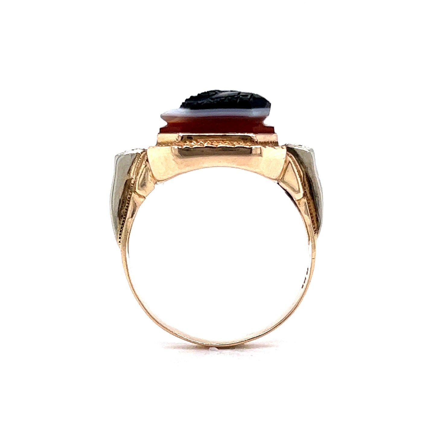 This beautiful mid-century 10 karat yellow gold ring is sure to turn heads. It features a gorgeous carved cameo of agate, a striking stone that will add a classic and sophisticated touch to any outfit. The ring wraps around the entire finger, which gives it a substantial look and presence. The agate can be seen clearly, with its wonderful swirls and intricate carvings, truly making this ring a showstopper. With its mid-century elegance, this ring is sure to be a treasured piece for years to come.