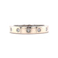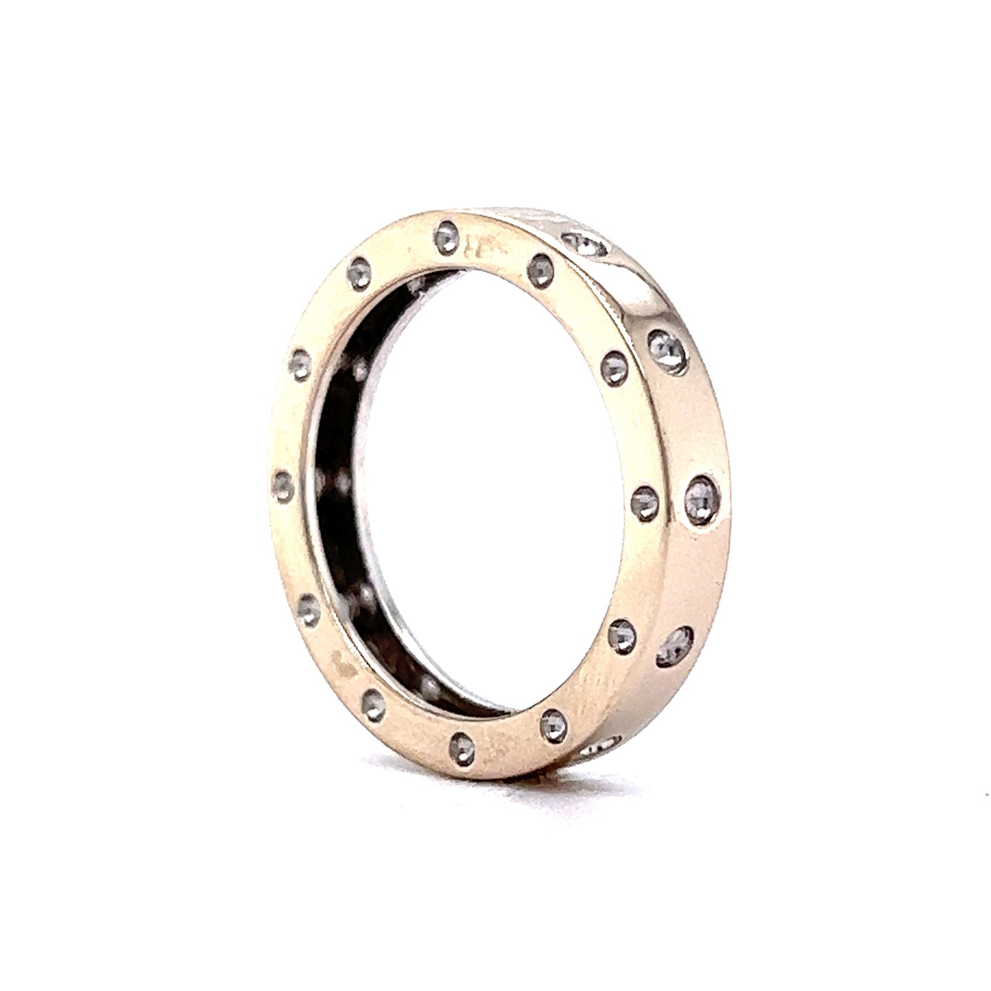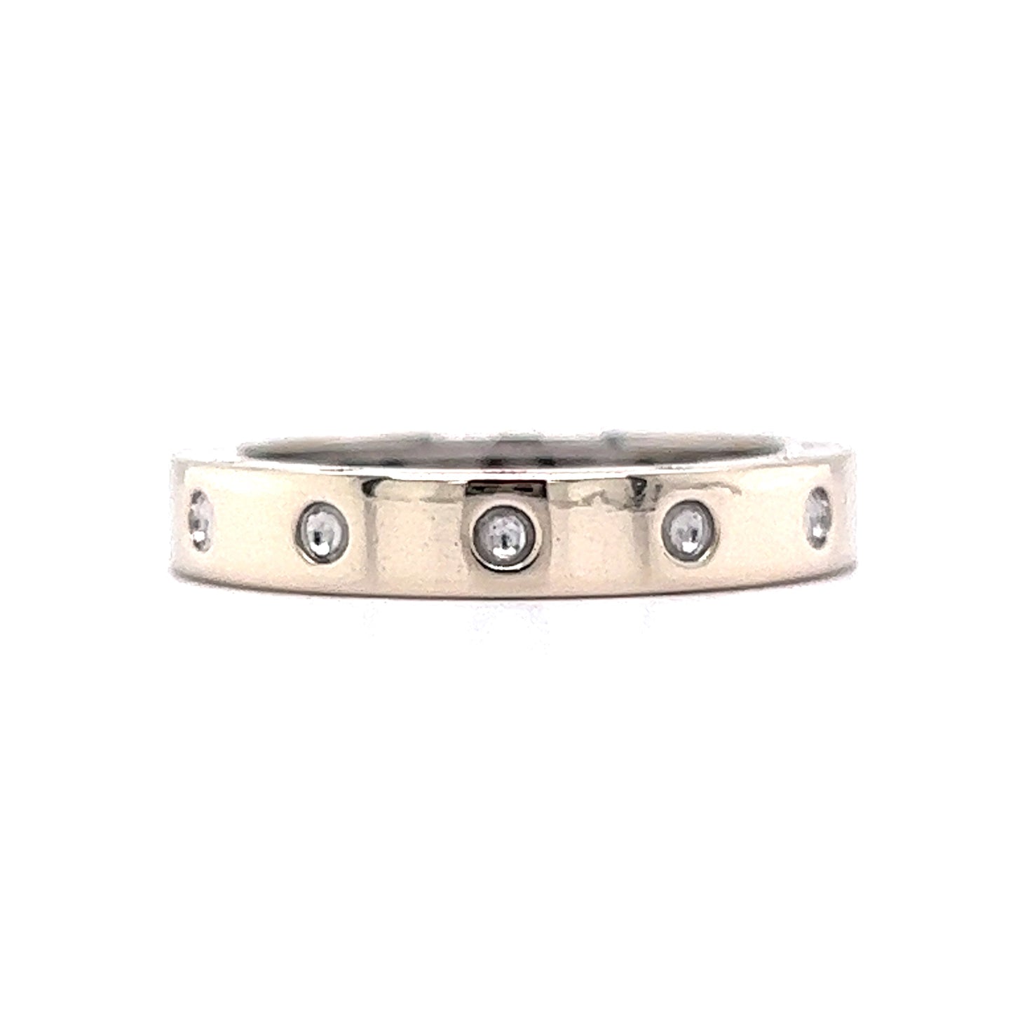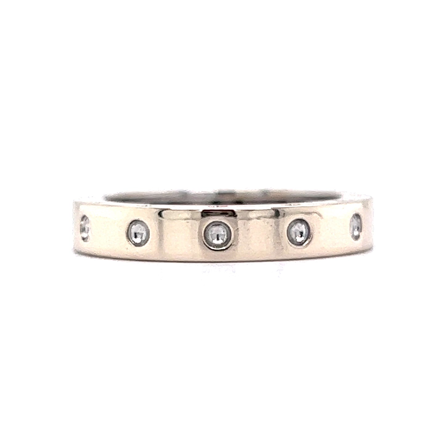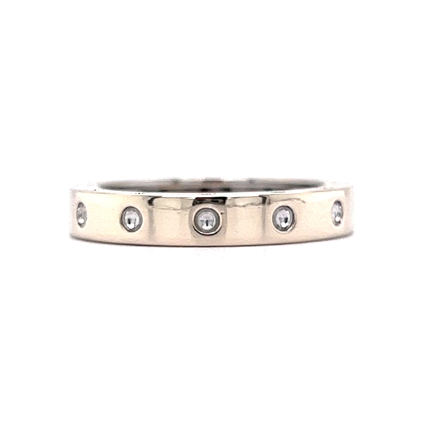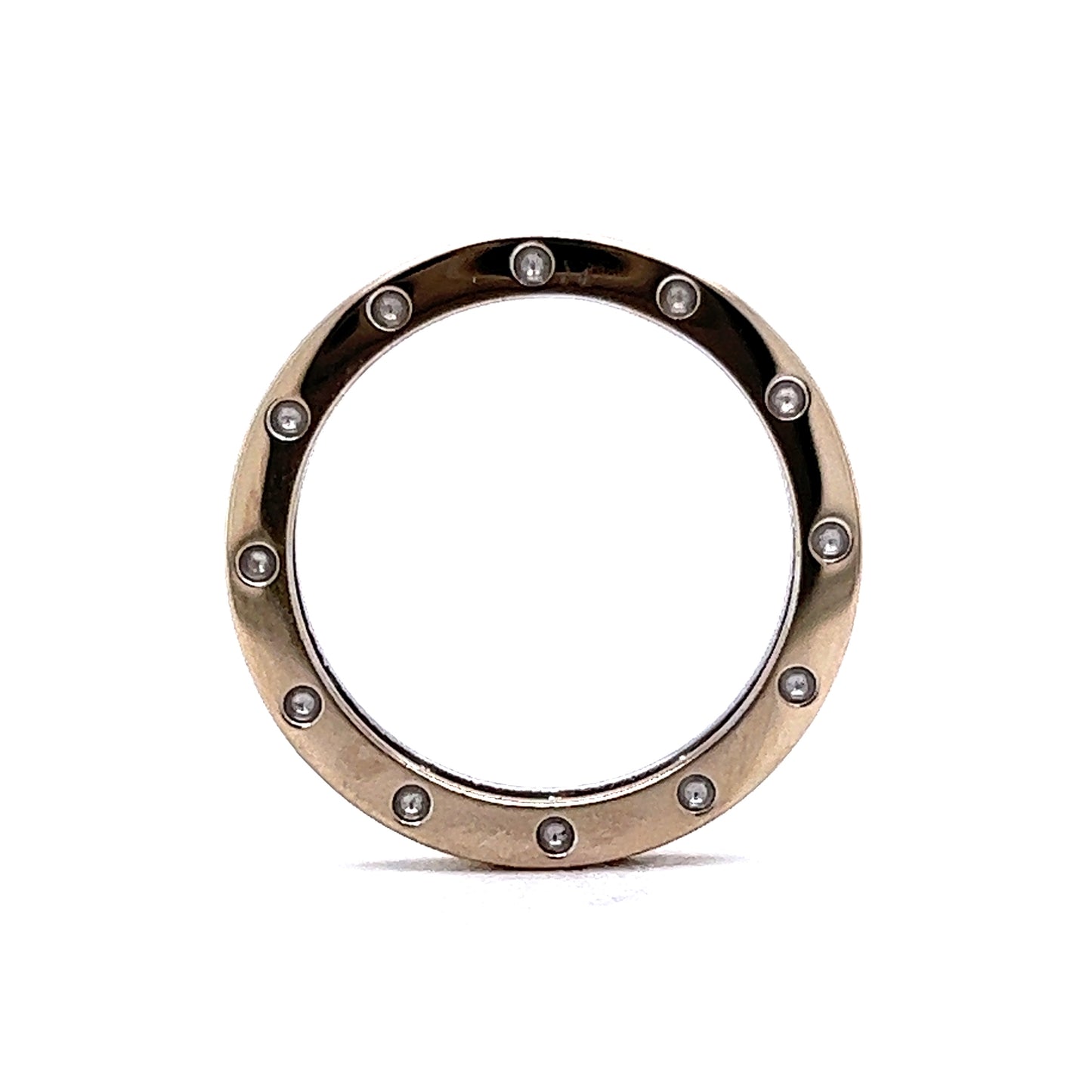 This elegant 18k white gold wedding band is a modern take on an eternity band. Incredibly modern and sophisticated with its captivating design, this band features circular stations on the top and sides of the band. This modern band would be a unique options as a wedding band or in a stack.
