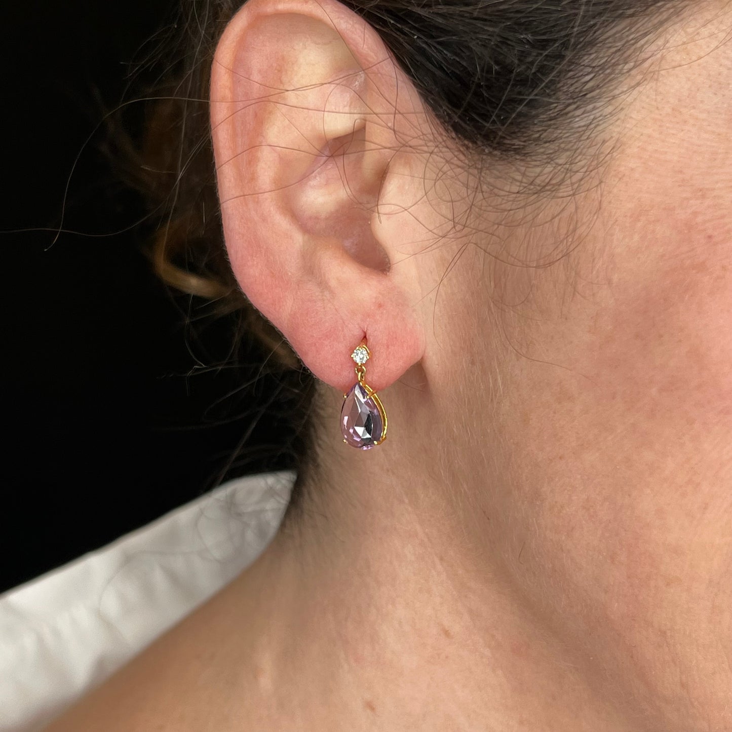 These romantic drop earrings feature pear cut amethyst gemstones in 14 karat yellow gold. At the studs, two (2) accent diamonds sparkle against the luscious purple amethysts. Set in four prongs, the amethysts are lightly saturated with a beautiful lavender hue. Elegant & expertly designed. Shop More Amethyst Jewelry.