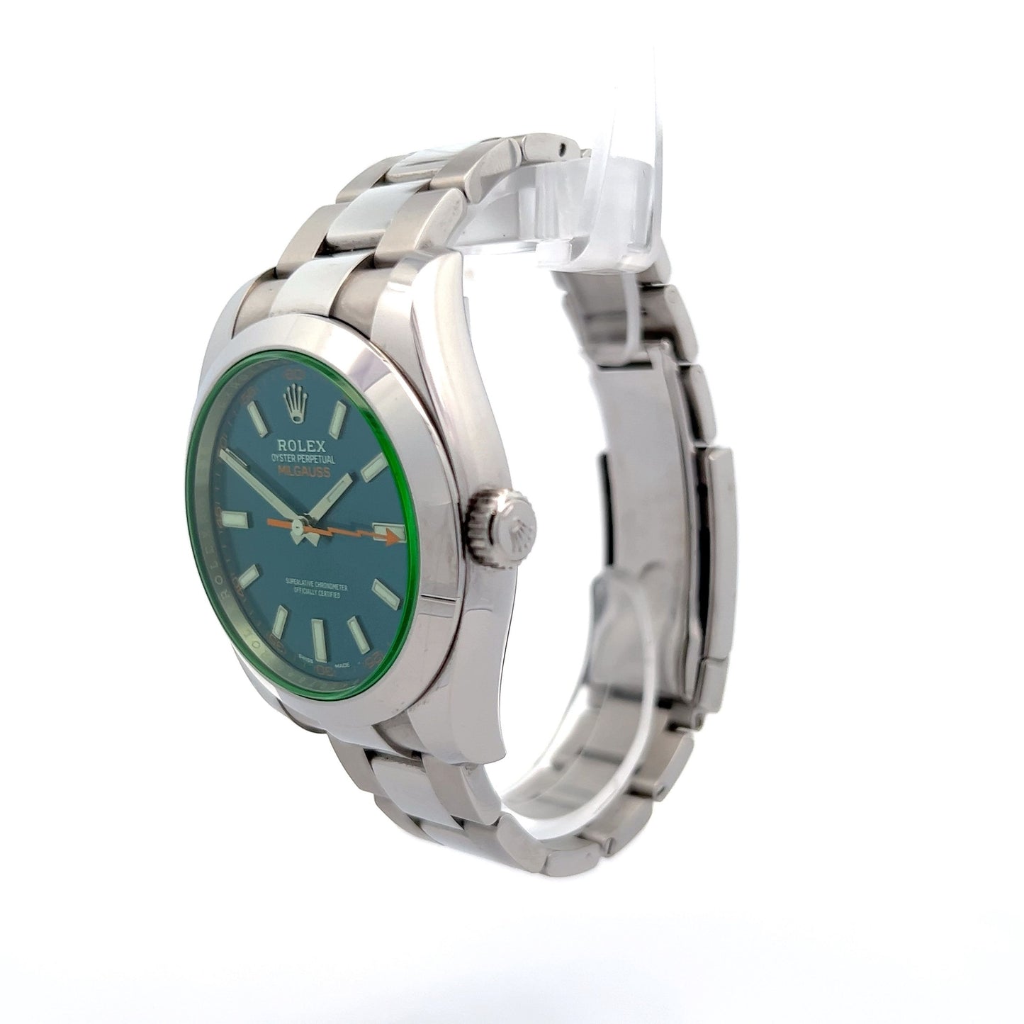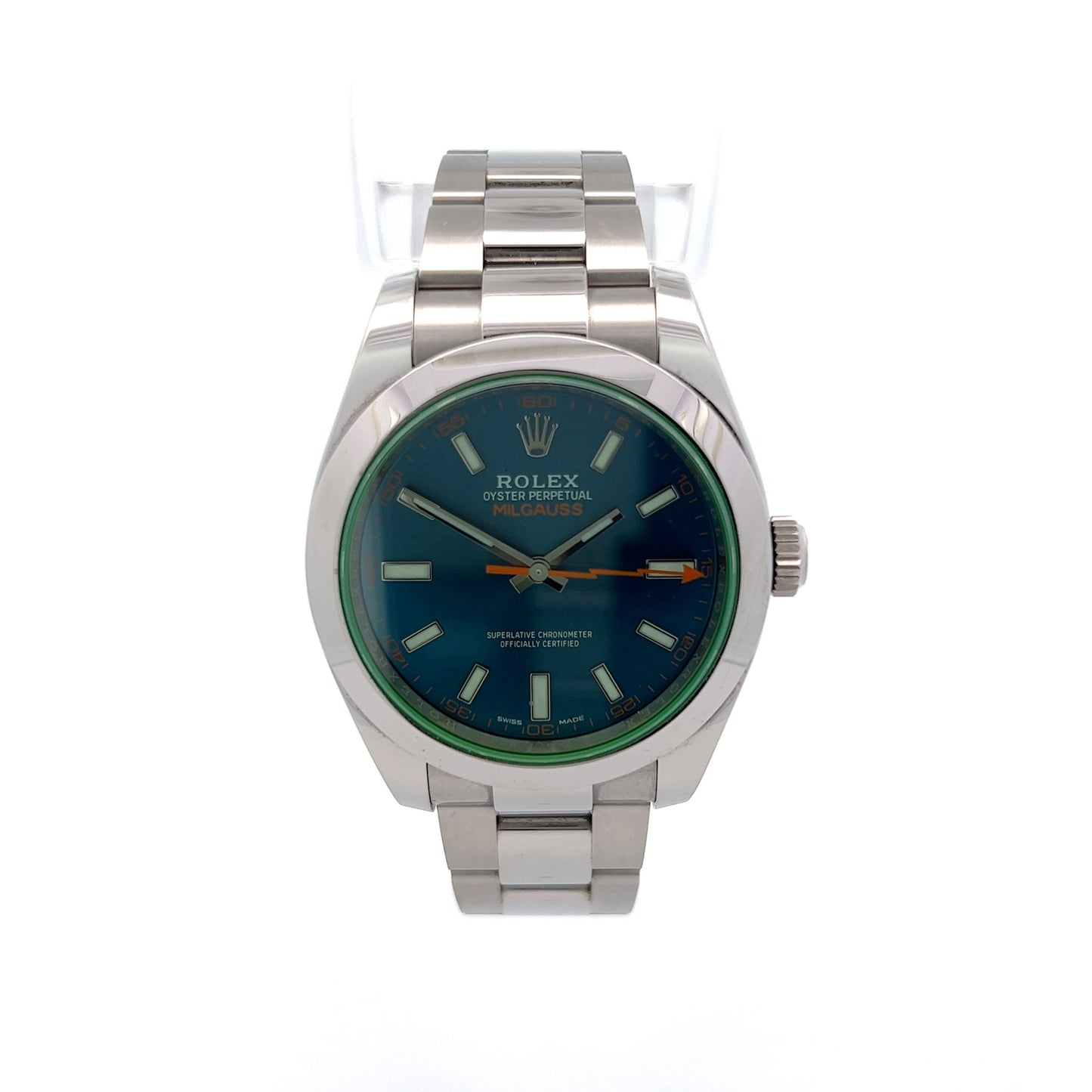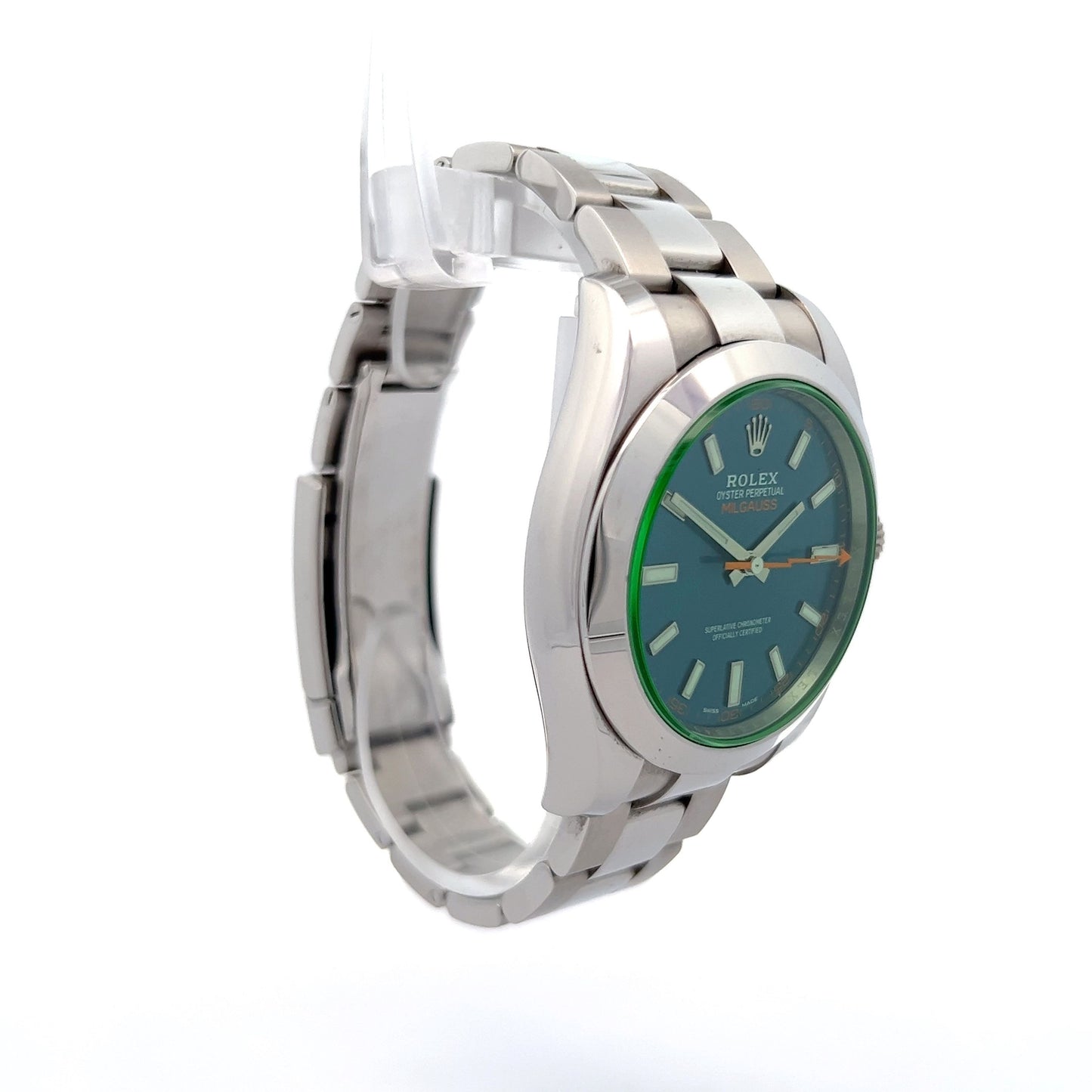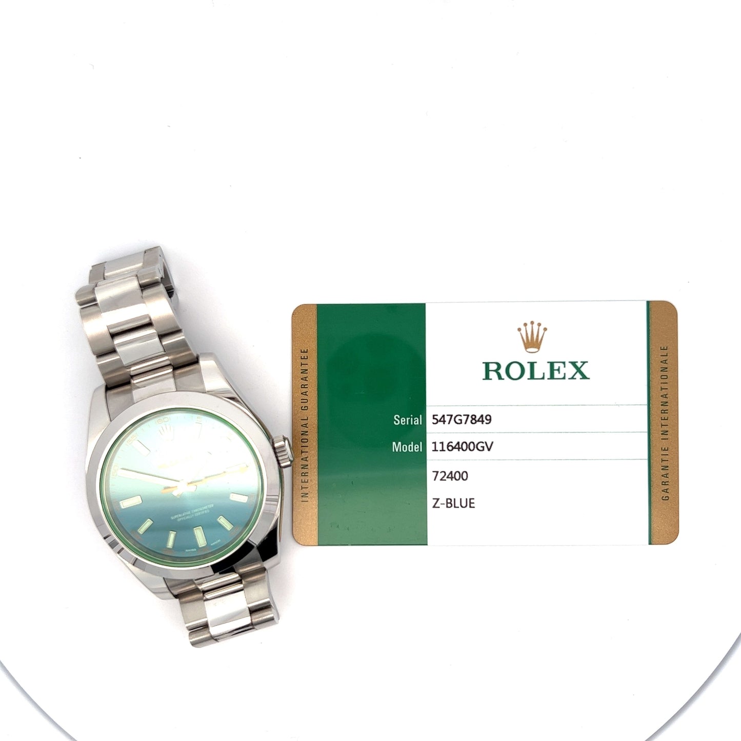 Rolex Milgauss Green Cystal Blue Dial Ref 116400GV in Stainless Steel