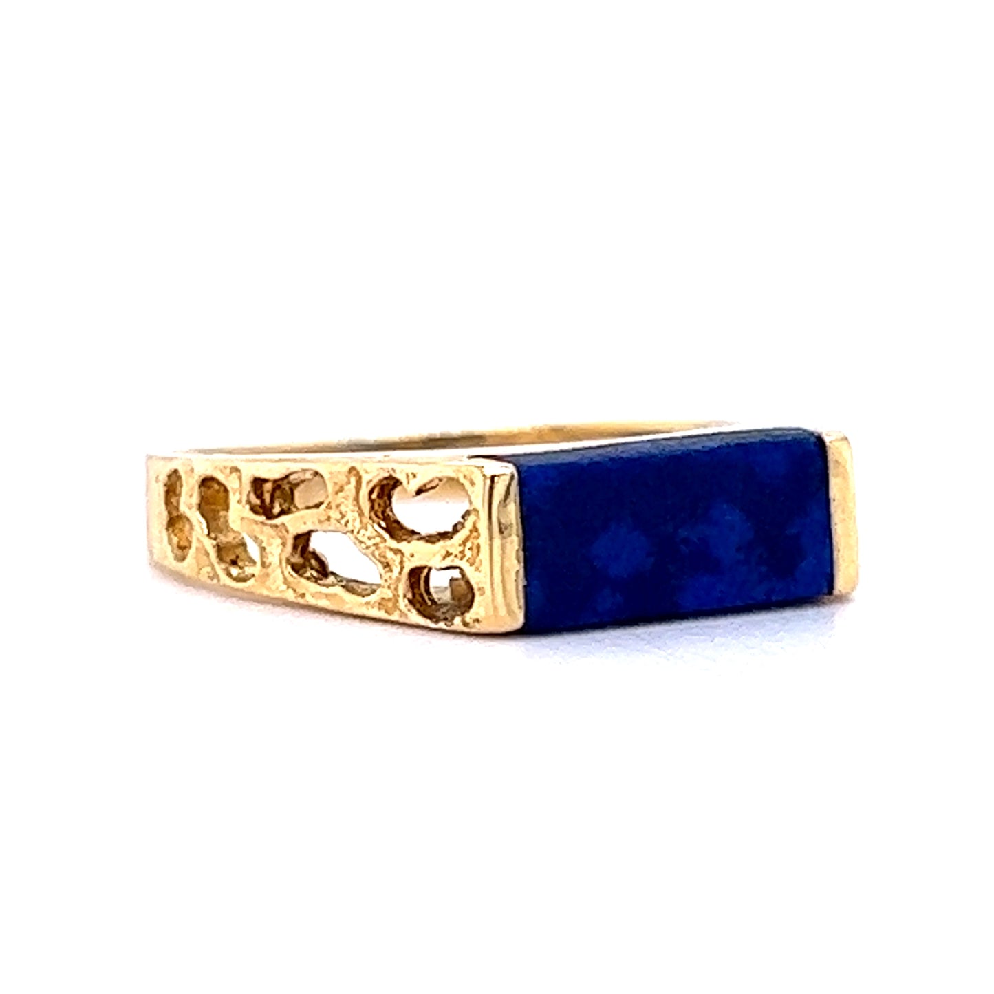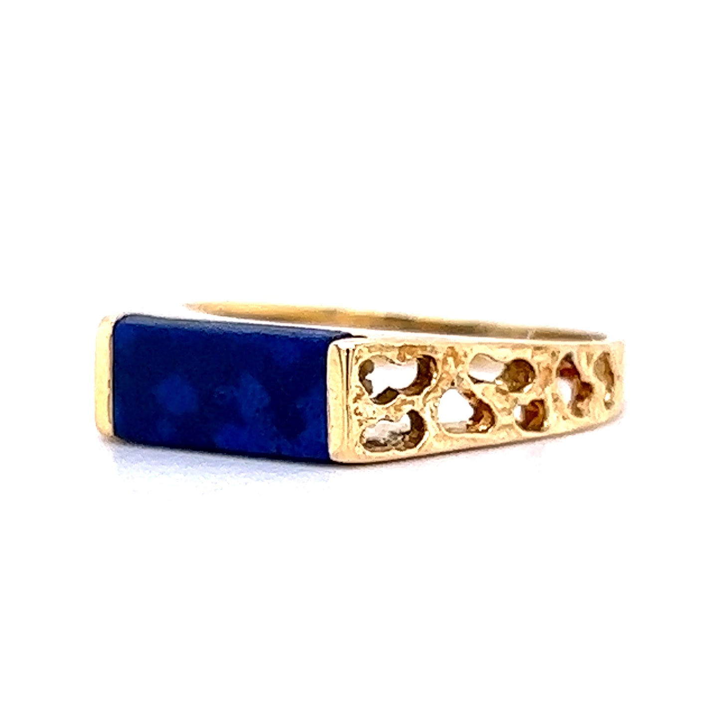 This radiant Mid-Century Lapis Ring features an organic textured design in 18k yellow gold. The vibrant blue lapis lazuli gem weighs 1.06 carats. The gemstone is smoothly cabochon cut into a rectangle. A great ring for signet ring lovers. The unique yellow gold band features an innovative, rustic texture with openwork designs. A vintage stacking band that makes a statement! Lapis lazuli symbolizes confidence and strength. A chic gift for you or your loved one!
