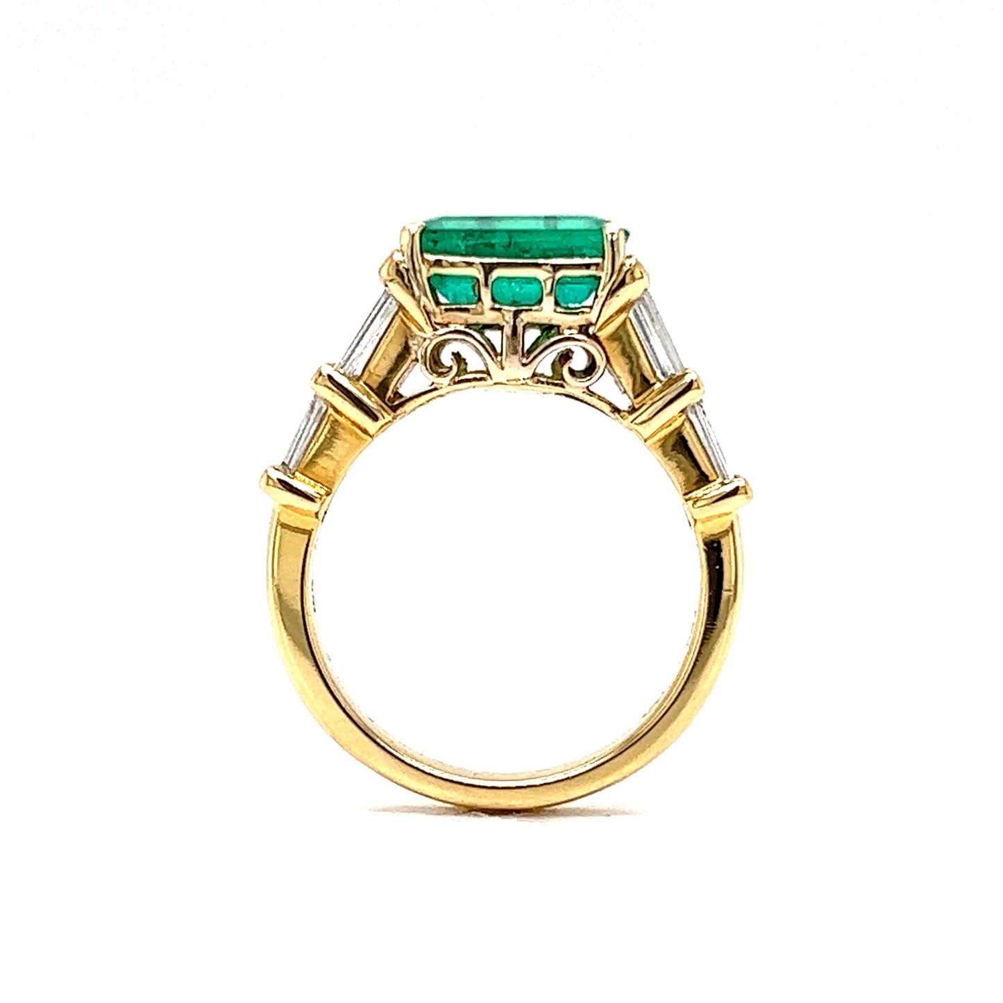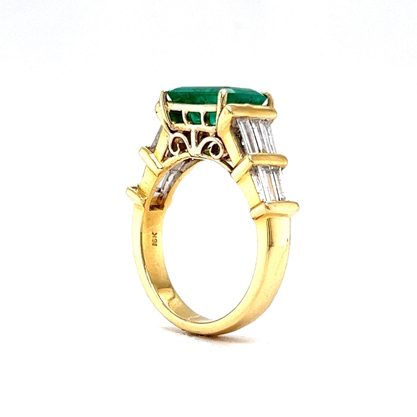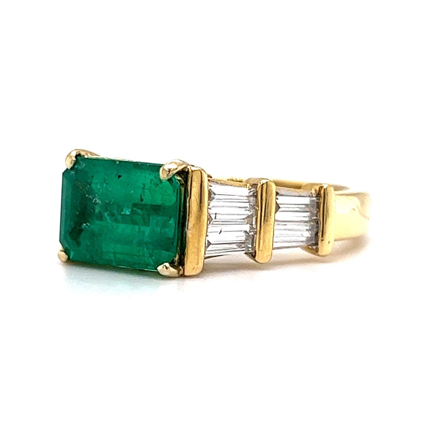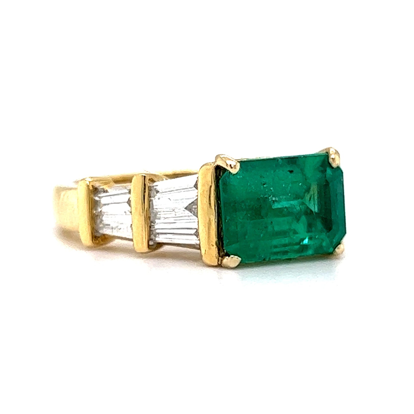 This modern cocktail ring features a stunning 2.00 carat emerald center stone with tapered baguette diamond side stones, adding a touch of elegance and luxury. The emerald is a natural stone with a rich green hue, and the diamond side stones have a color and clarity grade of I, VS2, and SI1, respectively. The ring is crafted from 18k yellow gold, marked with a 750 inscription, and has a total diamond weight of 1.20 carats. This piece is perfect for anyone who loves contemporary style jewelry and wants to make a statement!