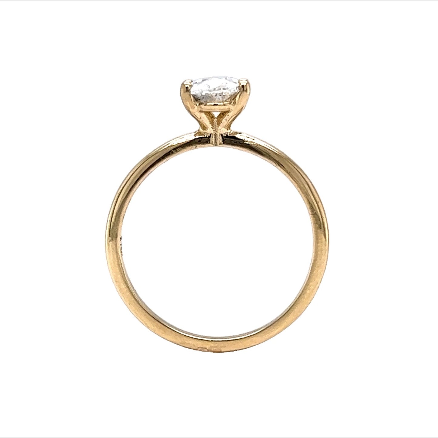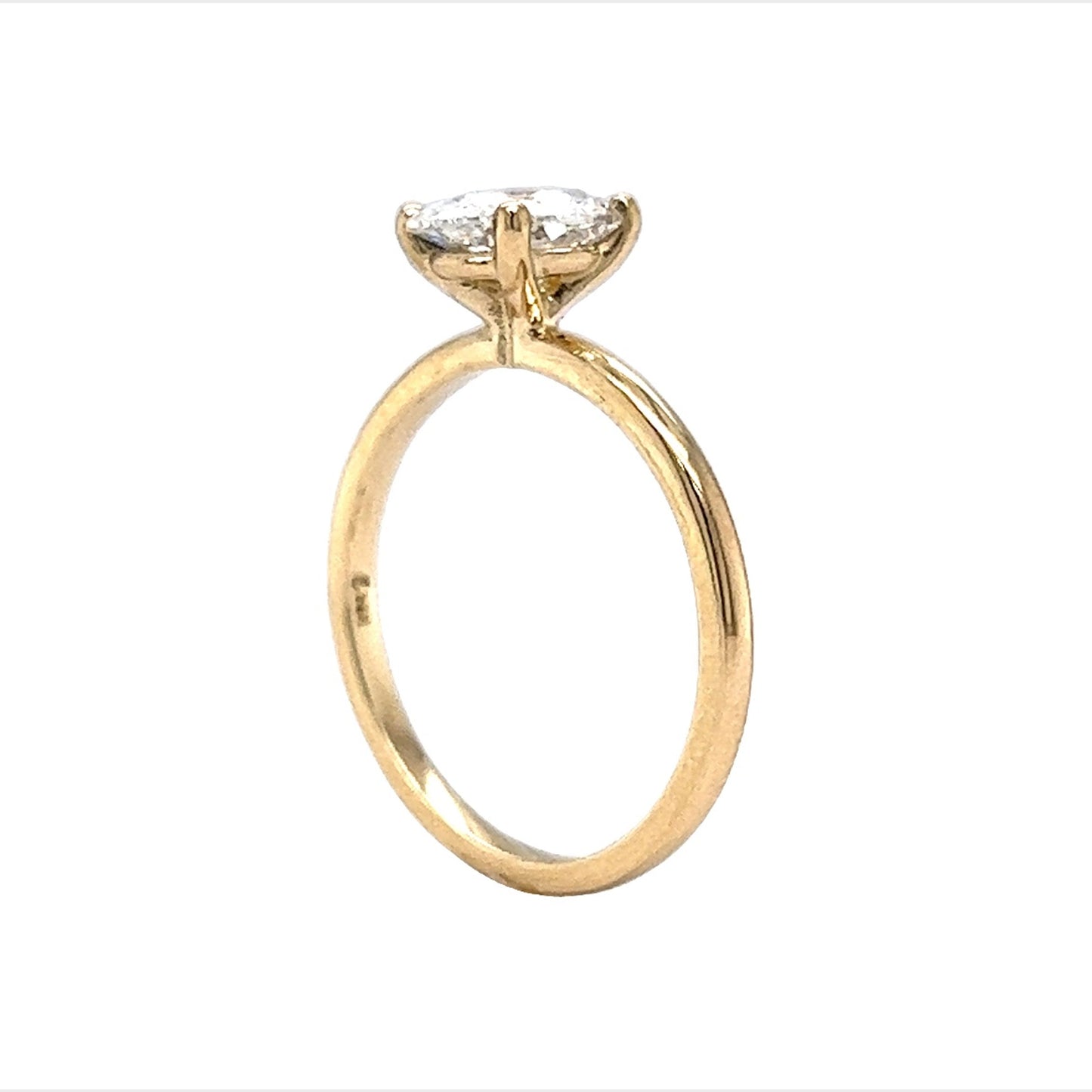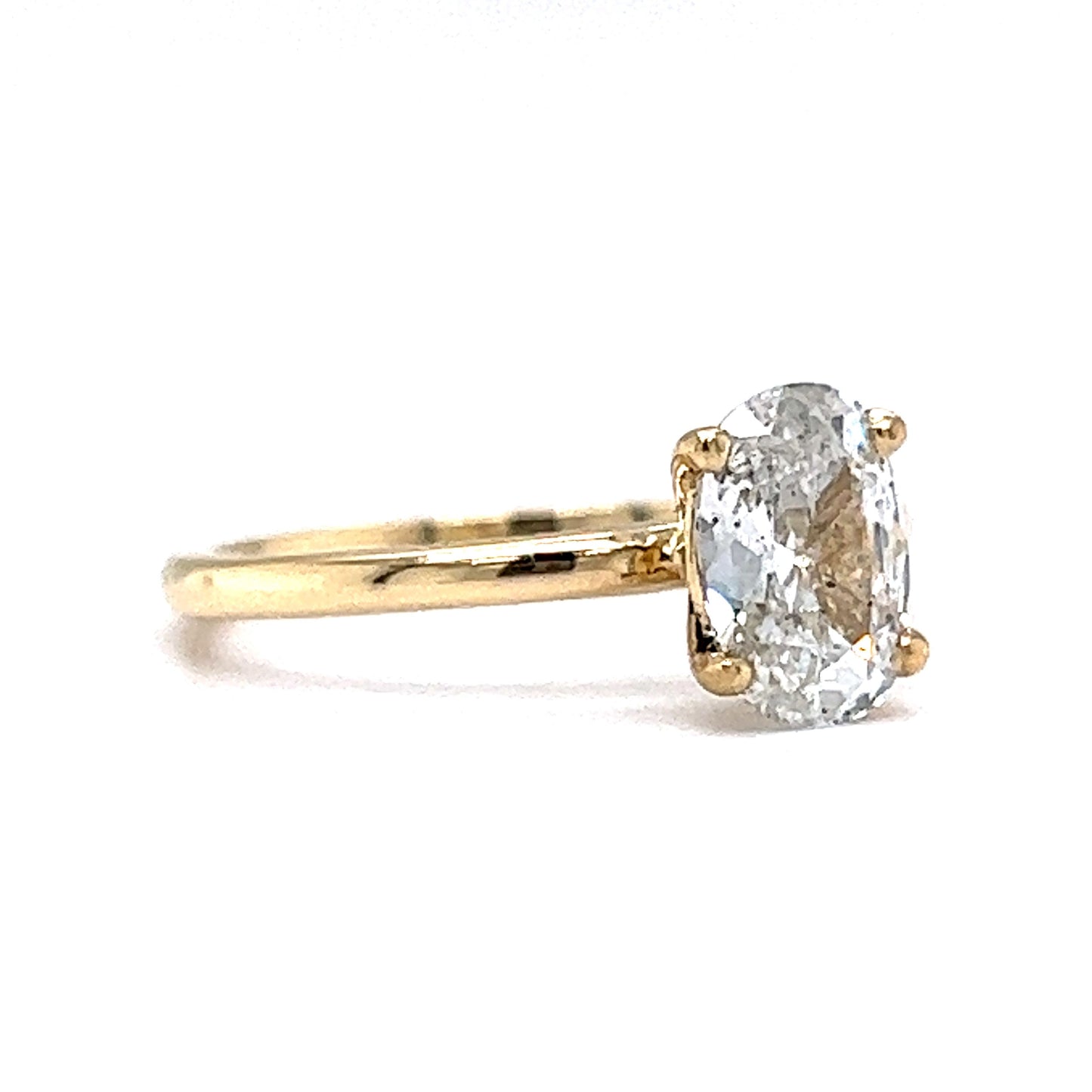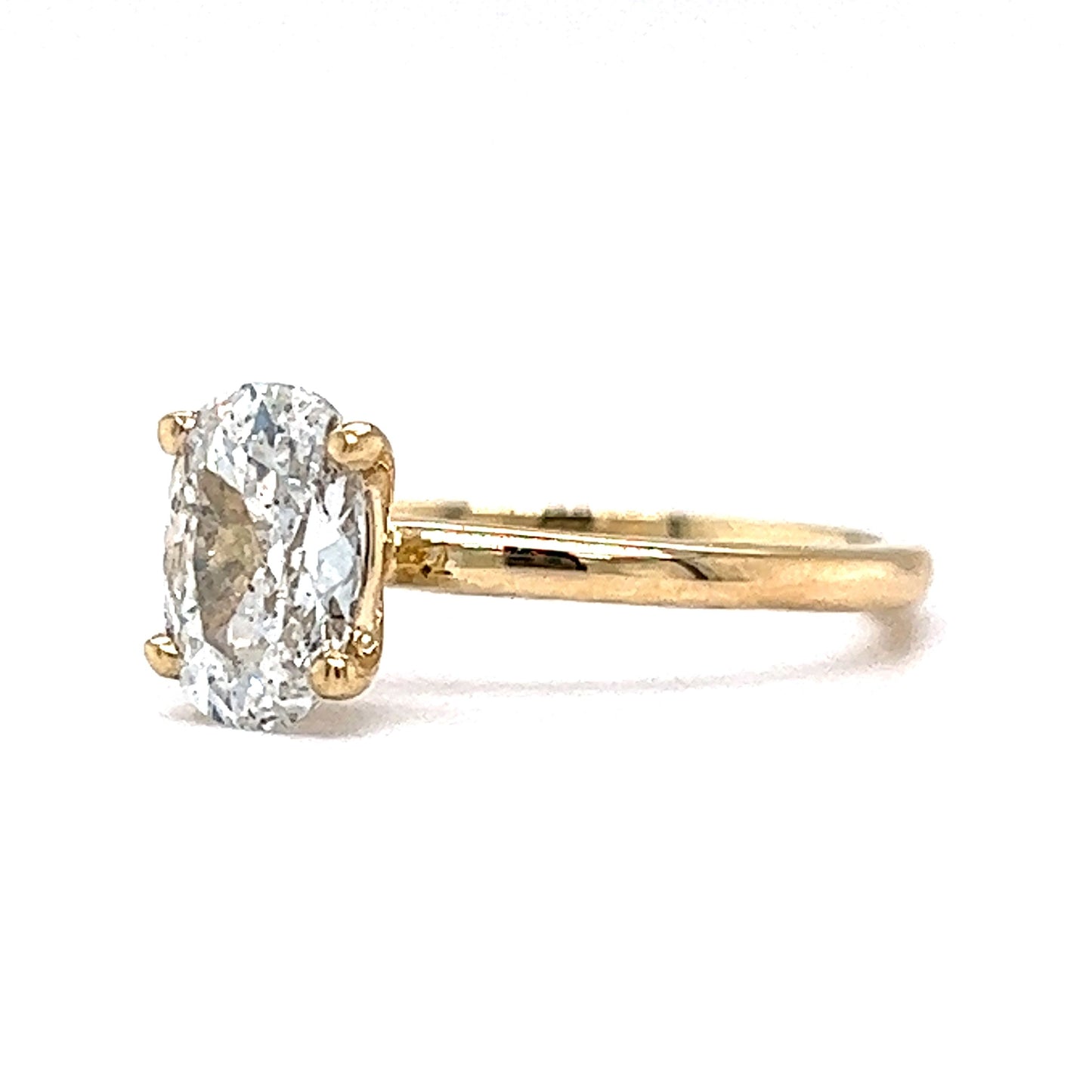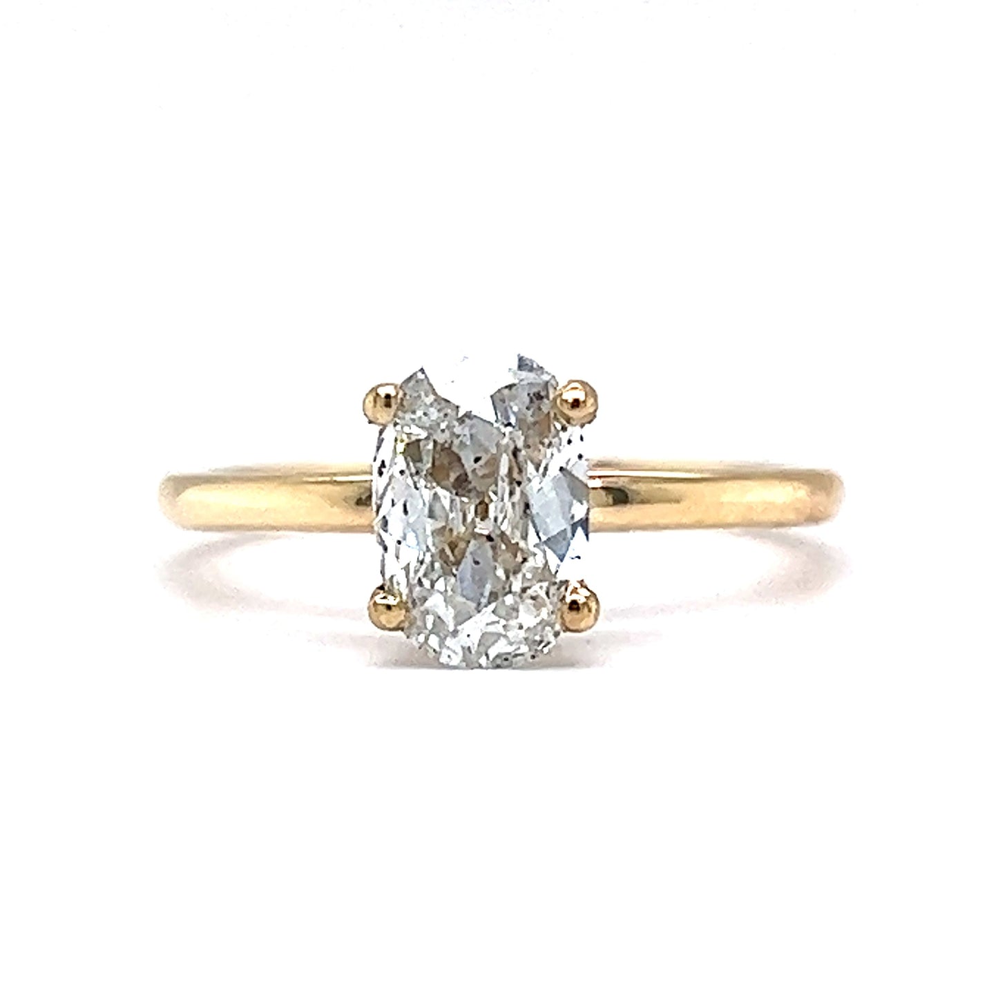 This modern engagement ring boasts a beautiful 1.05 carat oval cut diamond set in 14 karat yellow gold. The center stone is held in place by four prongs, allowing for maximum brilliance. The diamond's clarity is rated SI2 and its cushion cut showcases its E color beautifully. The minimalist solitaire style of this engagement ring makes it an elegant choice for any bride-to-be as it is perfect for everyday wear.
