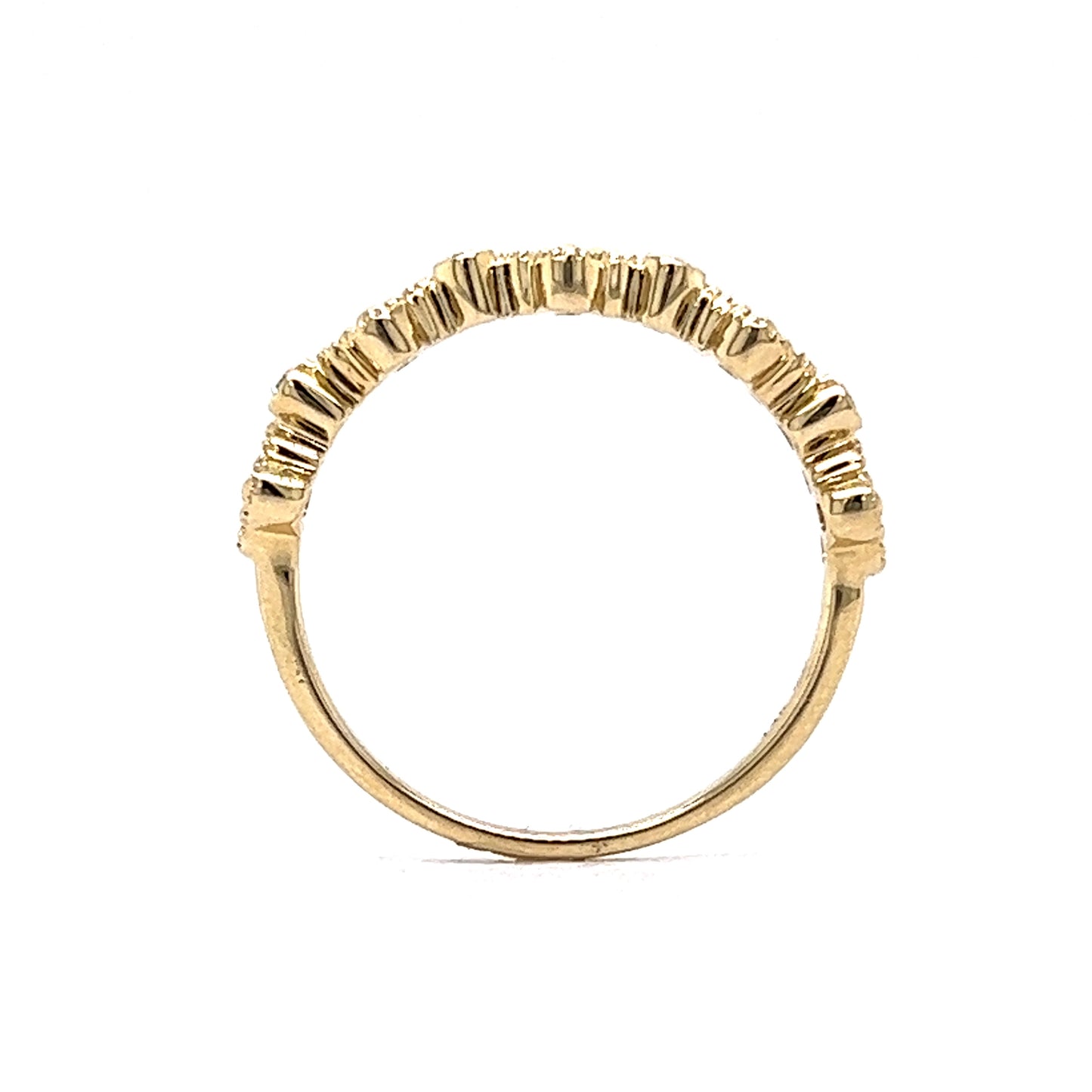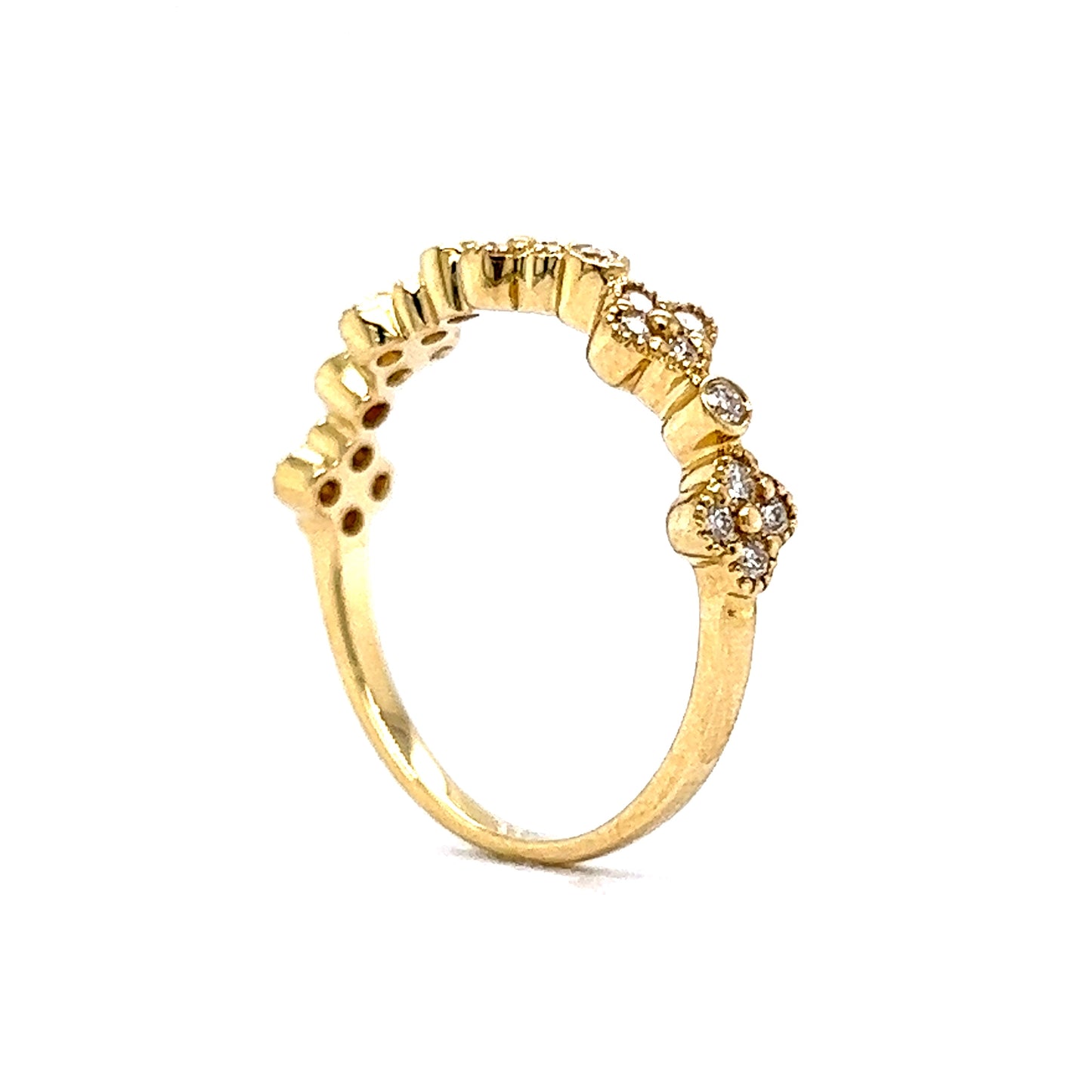 This exquisite Wedding Band is the perfect combination of modern elegance and classic style. Made from 14 Karat Yellow Gold, this ring boasts a stunning floral and geometric design that is sure to capture attention. The round cut diamonds are arranged in a stylish milgrain and bezel setting which beautifully frames the stones. This ring is perfect for stacking and is sure to enhance any outfit.