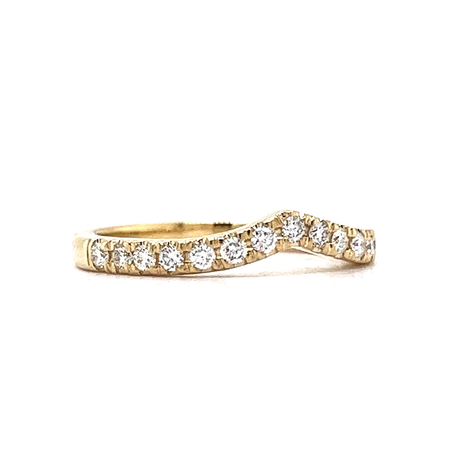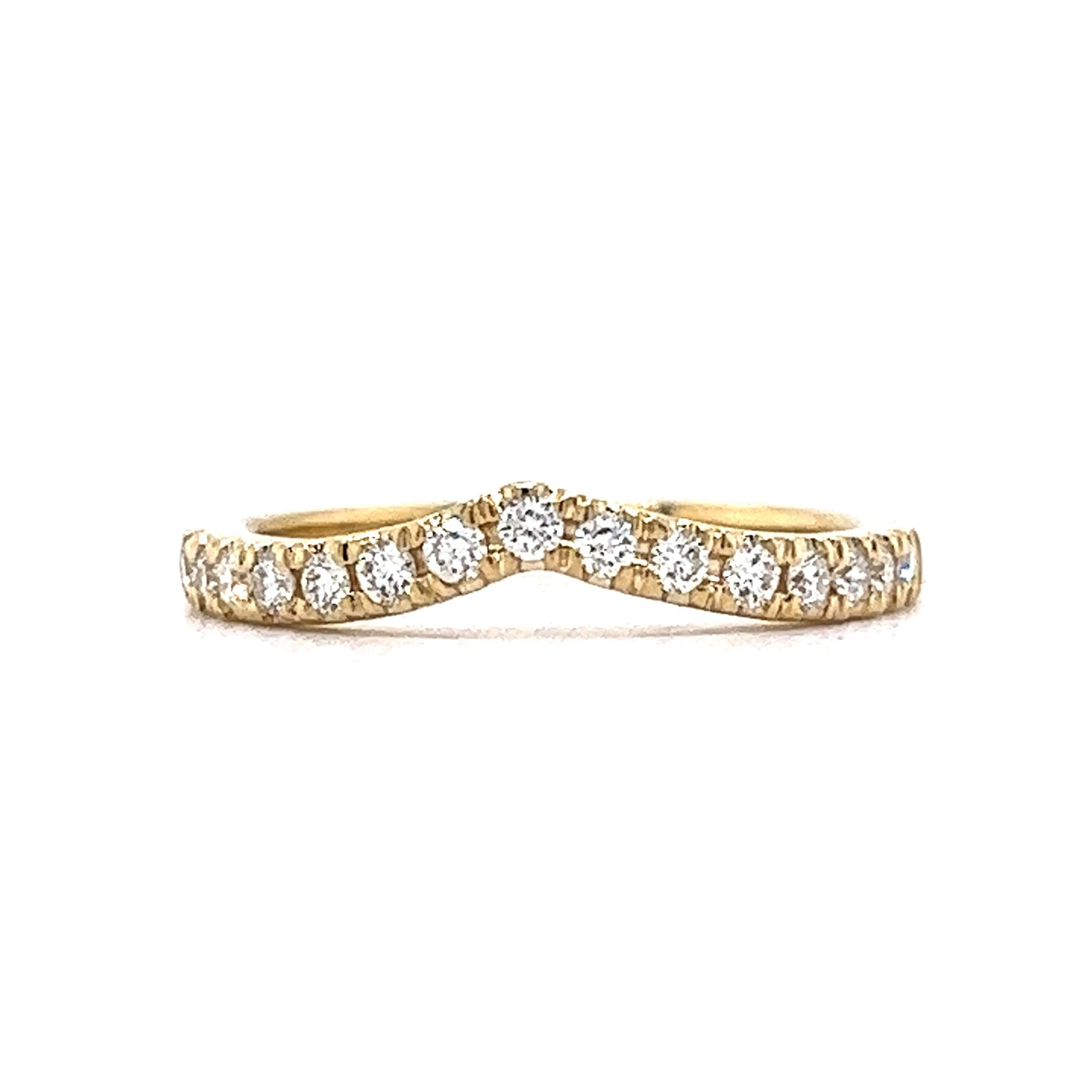 This wedding band features a V shaped design that adds a touch of elegance to a low profile engagement ring. Crafted from high-quality 14k yellow gold, it boasts a crispness and luster that are sure to catch the eye. The ring is adorned with natural diamonds that have a combined weight of .30 carats. The design is a perfect match for the modern era, and the contoured ring style ensures maximum comfort for the wearer.