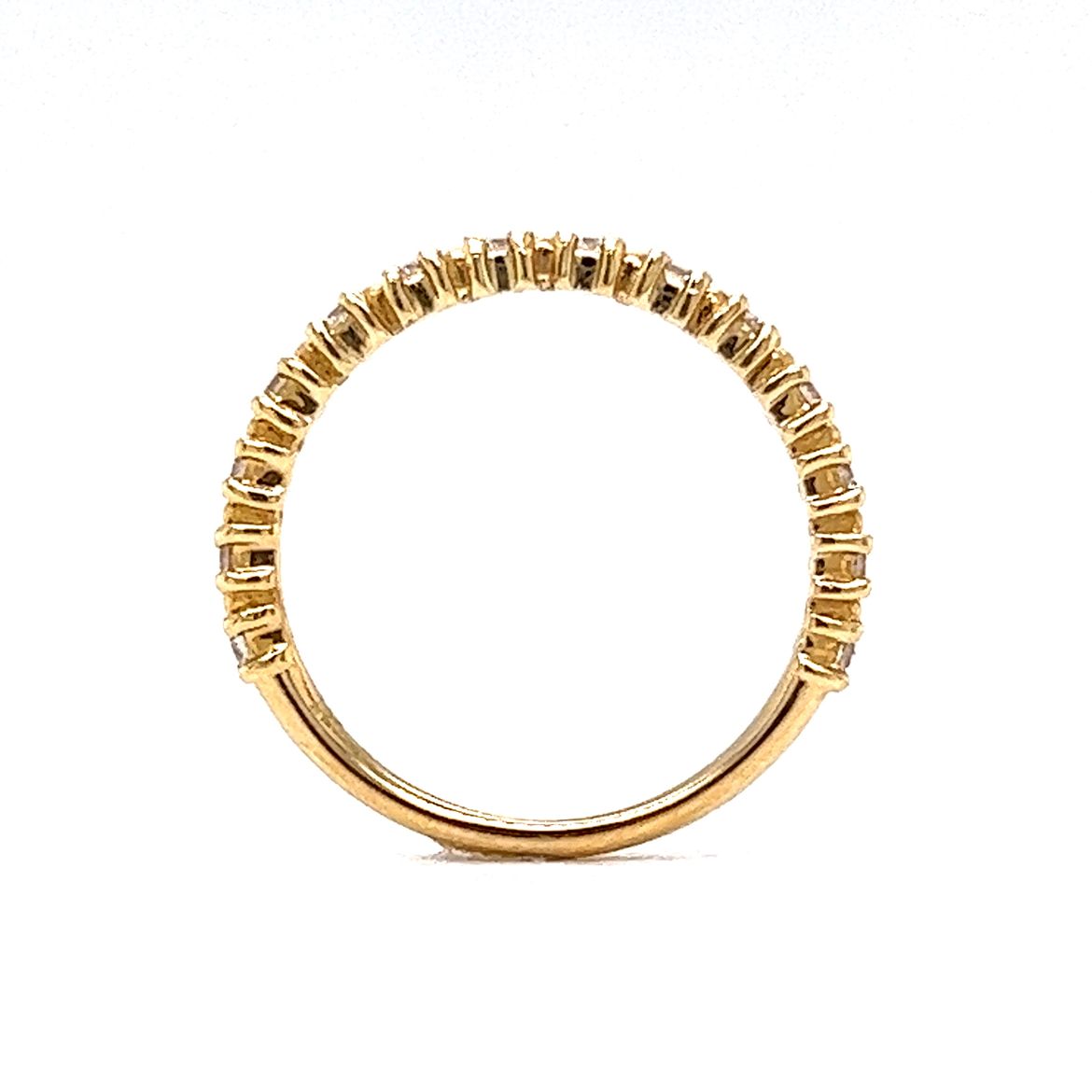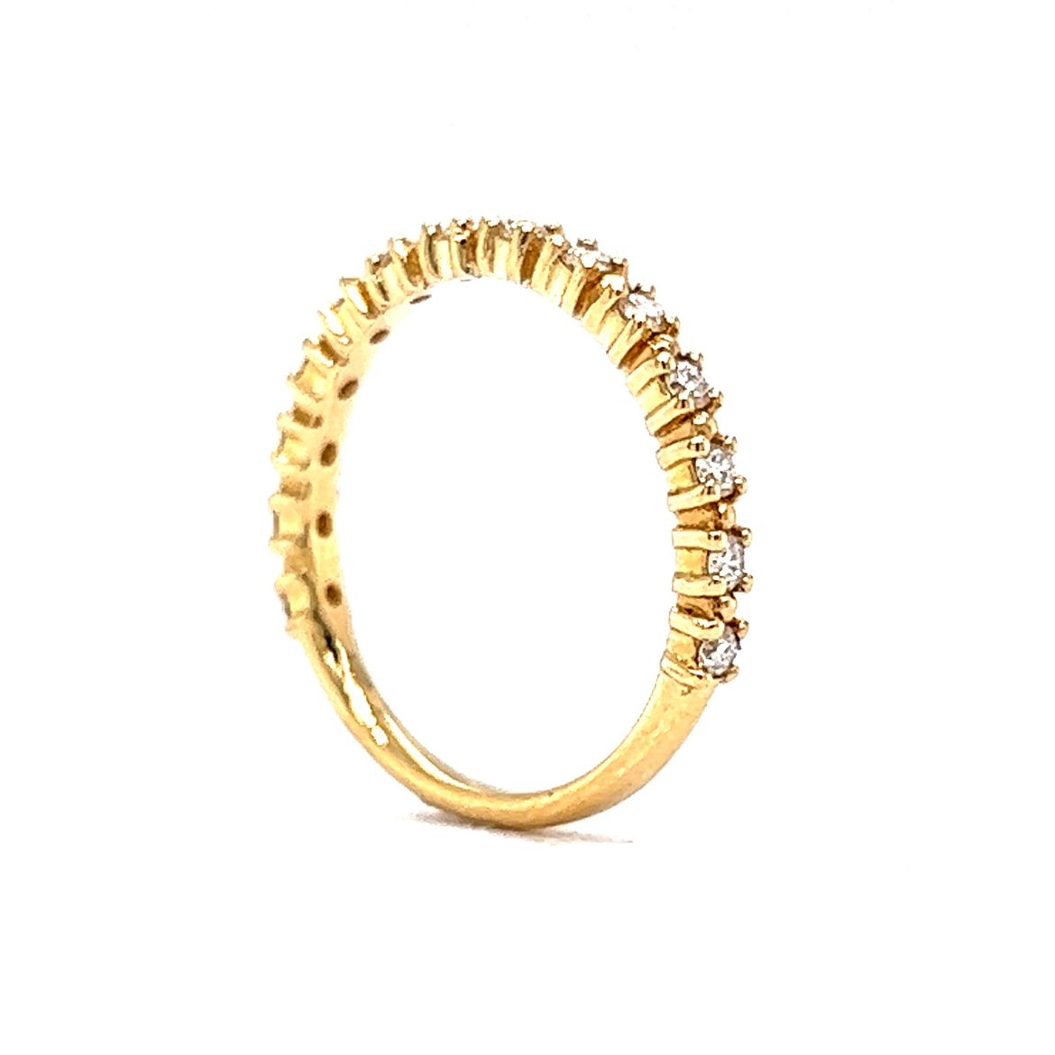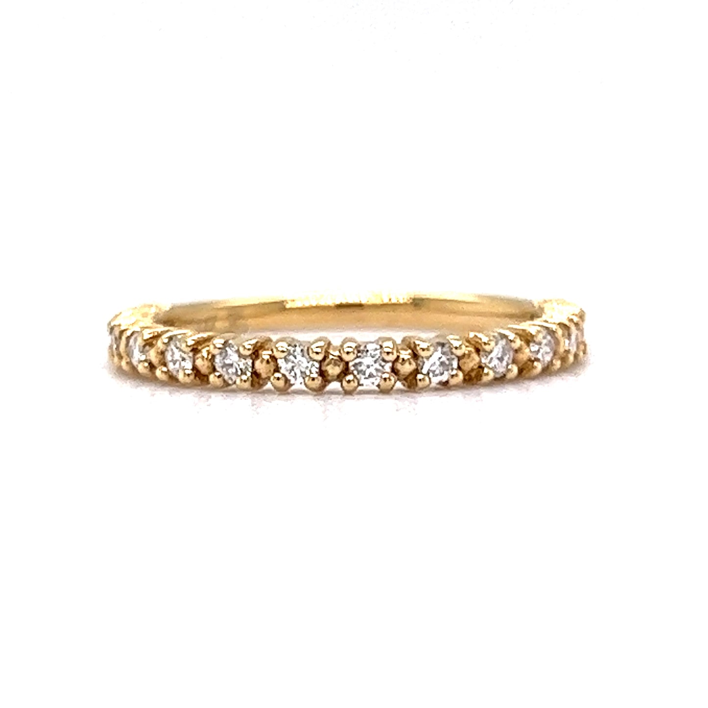 This classic wedding band features .20 carats of diamonds set in 14k yellow gold. The prong set diamonds add a bit of texture while also allowing full light penetration for maximum brilliance. This band will set comfortably next to an engagement ring or in a stack of bands.