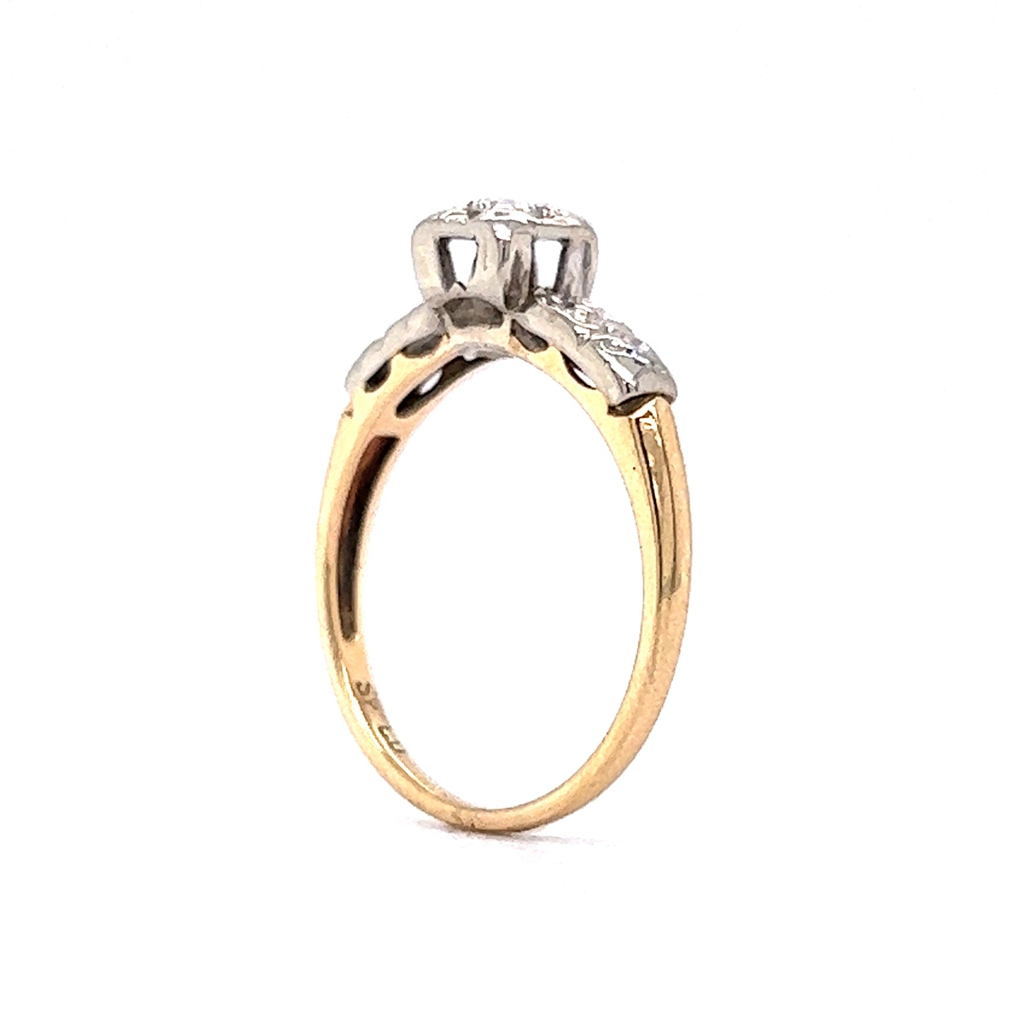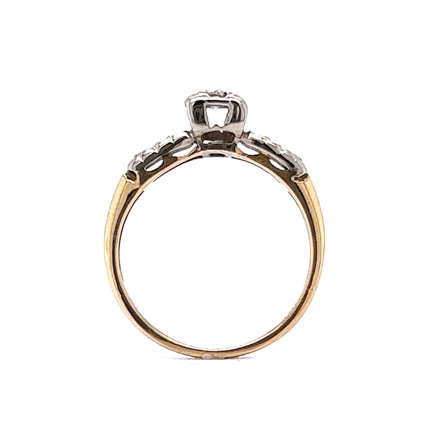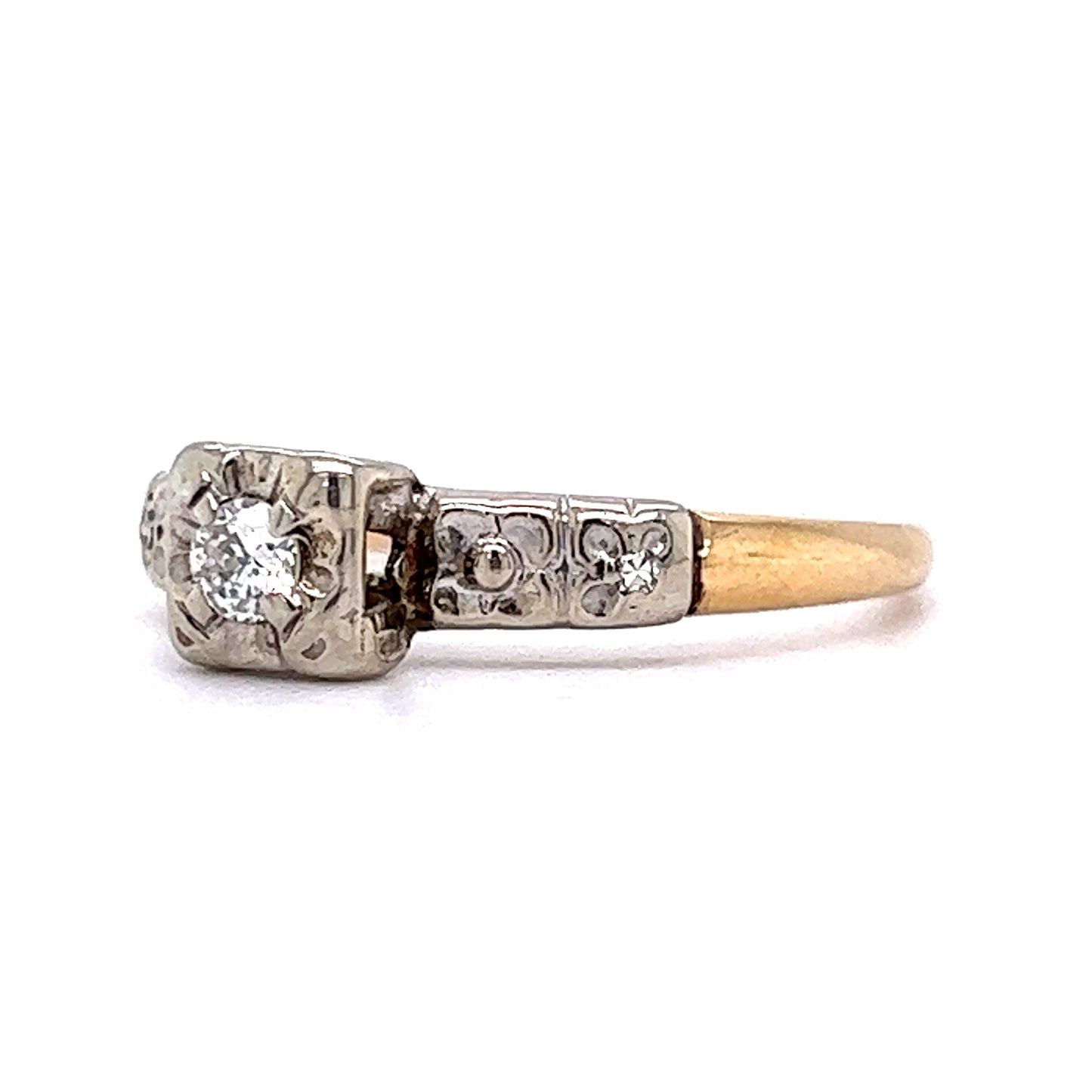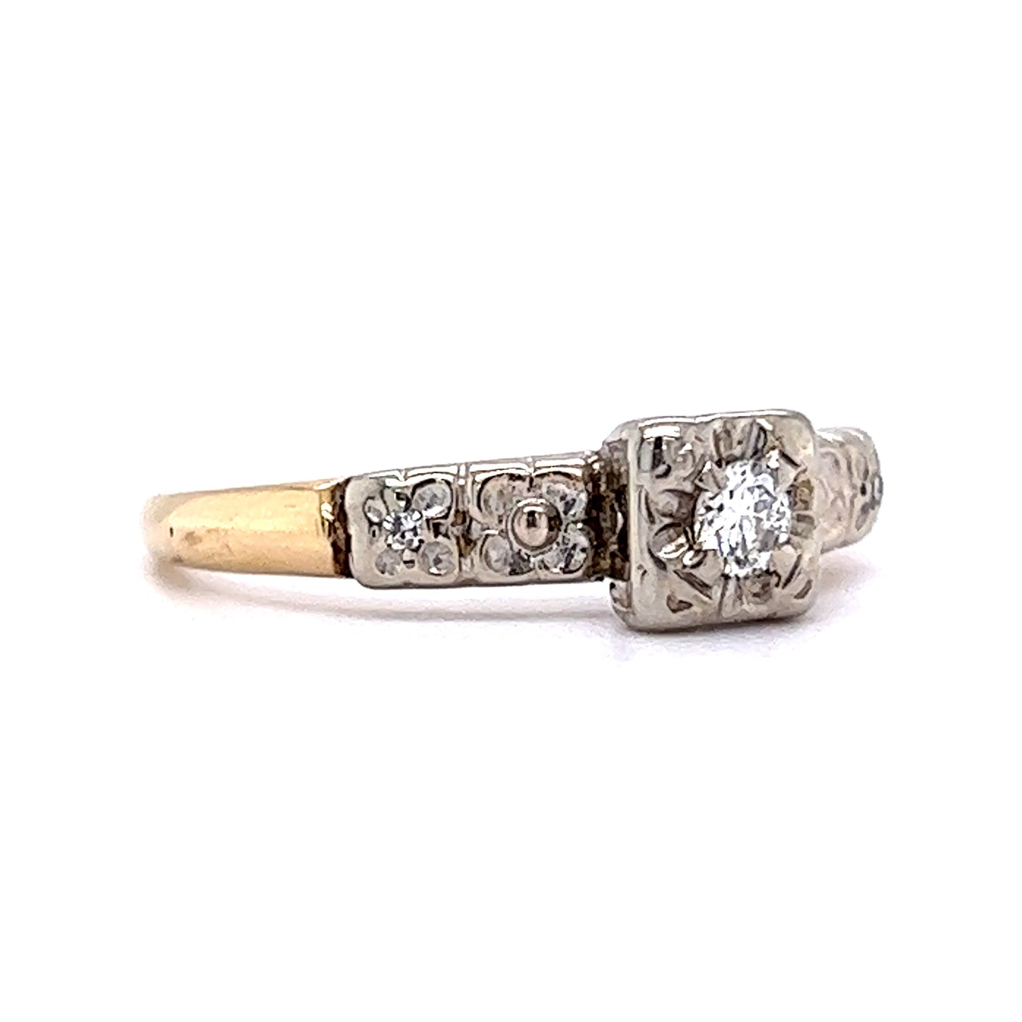 Retro Brilliant Cut Diamond Engagement Ring in 14k. This Retro engagement ring features .12 carats of round brilliant cut diamonds set in 14 karat white and yellow gold. The primary stone is prong set in a lovely square shaped mounting, with little grooves bursting out to enhance its sparkle. The shoulders have two (2) accent diamonds on each side, and below this the yellow gold shank completes the two-toned look.