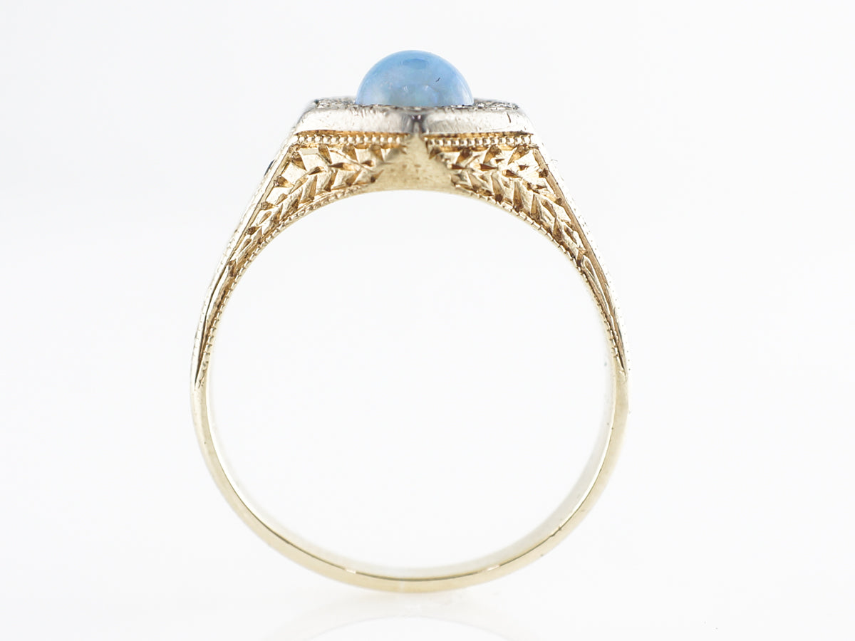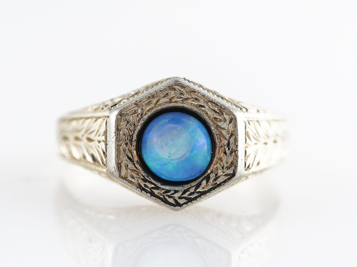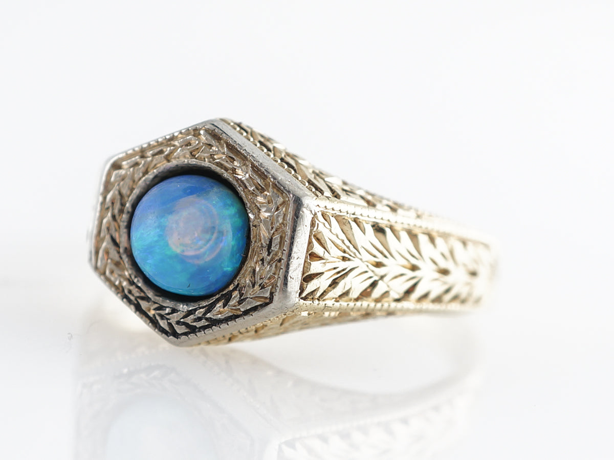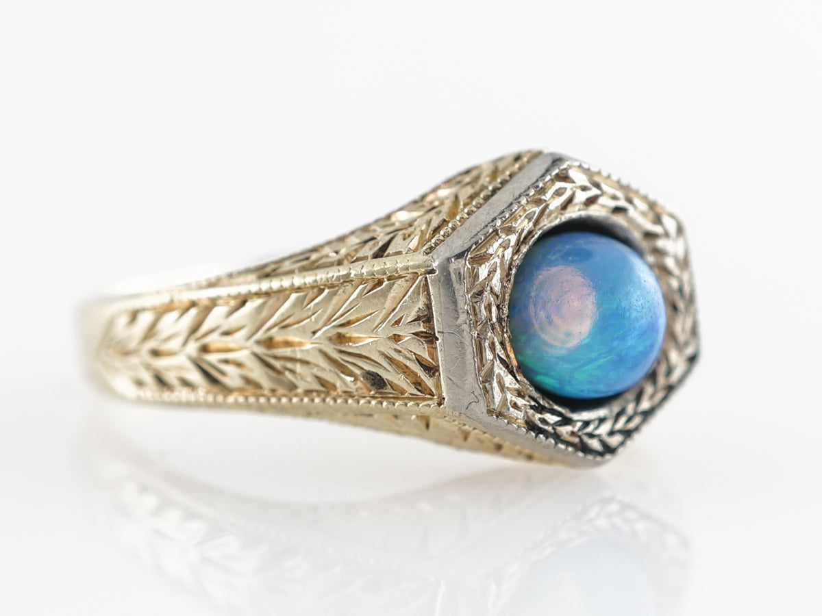 Retro Cabochon Opal Cocktail Ring in 14K. This enchanting cocktail ring comes to us from the Retro Era and features amazing engravings in 14 karat yellow gold and a .57 carat cabochon cut opal. The opal is rather tall, which enhances the depth of color, and is set in a gorgeously engraved hexagon section. The intricate engravings continue down each side of the shoulders and speak to the level of care and craftsmanship in many Victorian jewelry works.