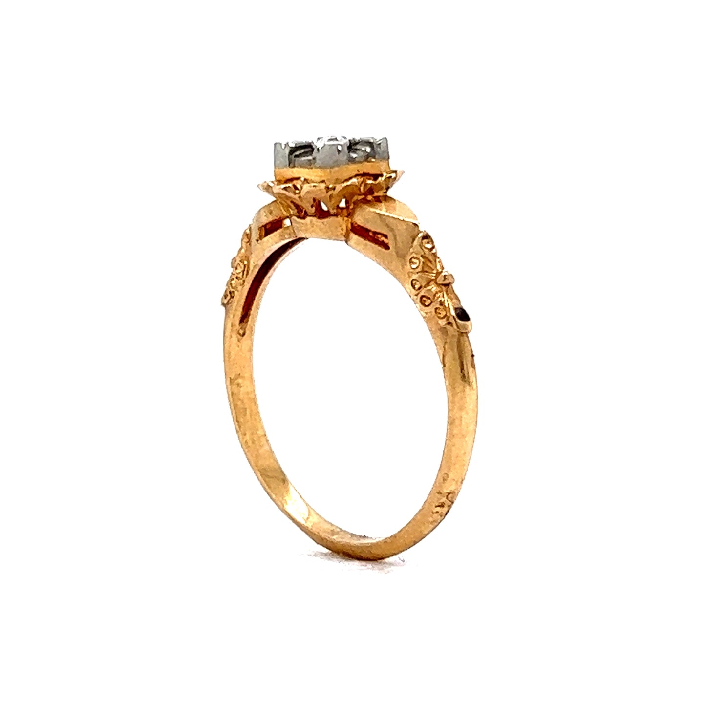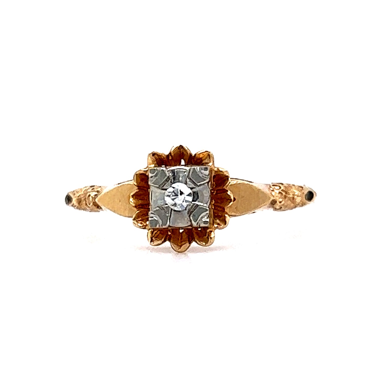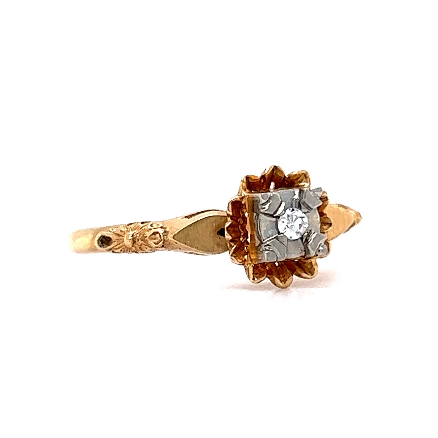 This lovely Retro engagement ring features a .04 carat single cut diamond in 14 karat yellow gold and 18 karat white gold. A structured white gold illusion mounting gives the ring a geometric and modern feel. A flower petal engraving in 14 karat yellow gold opens to reveal the face of the ring. From the profile, Retro floral motifs stretch over the shoulders of the band. Dainty and romantic.