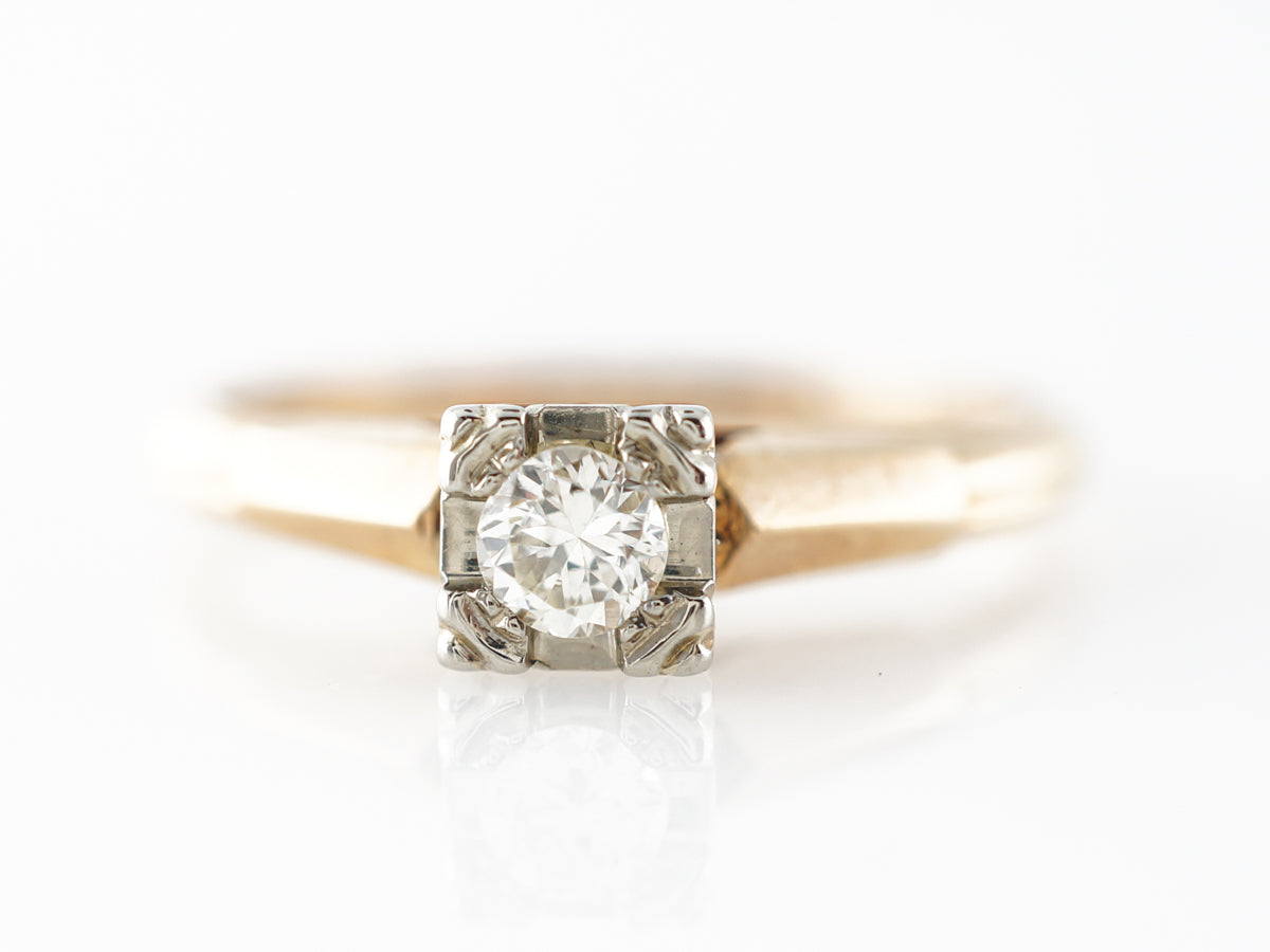 Retro Diamond Solitaire Engagement Ring in Yellow White Gold. This two-toned Retro engagement ring features a .15 carat round brilliant cut diamond set in 14 karat white gold with an 18 karat yellow gold band. The stone is set in a square section and is held by four prongs amid four equal channels forming a cross. The shoulders feature a raised section of yellow gold with a knife edge that turns smooth as it reaches the start of the band.