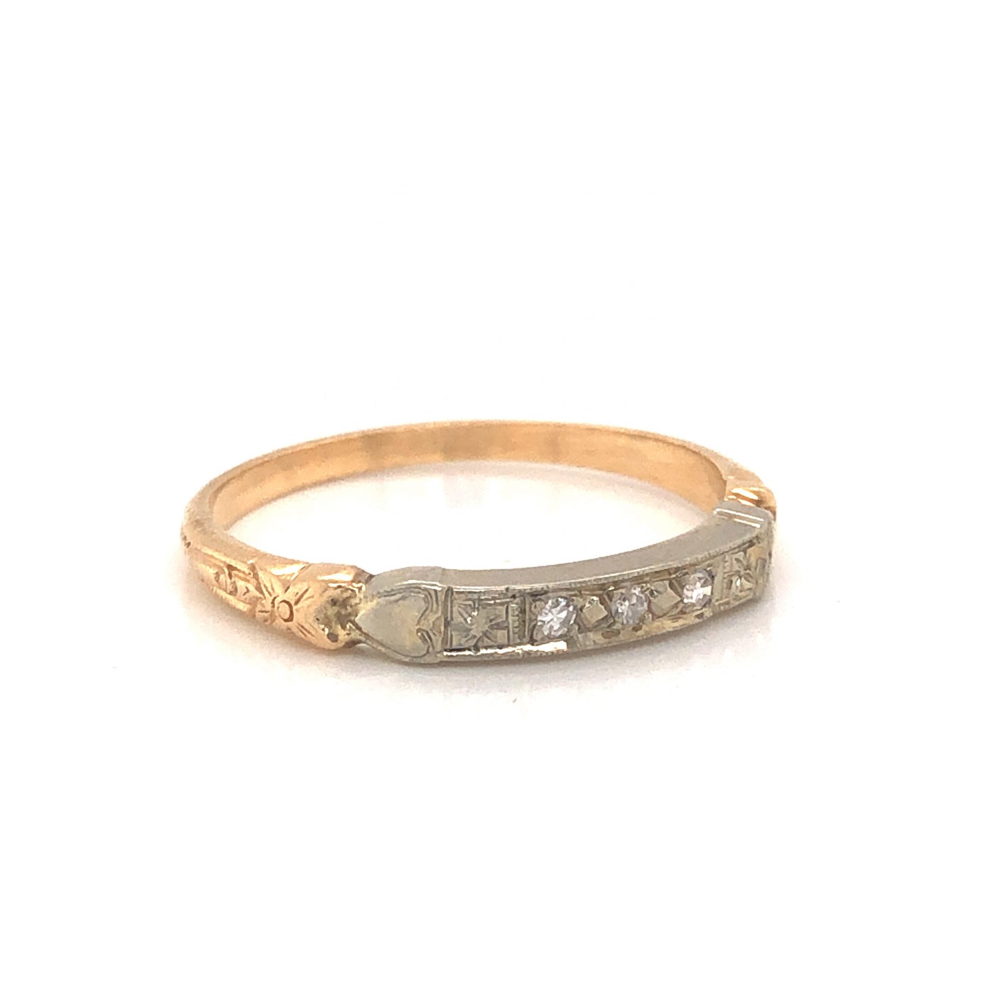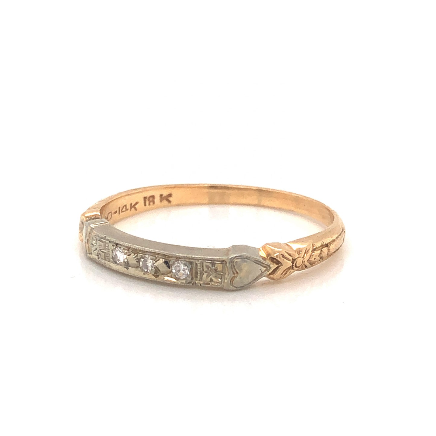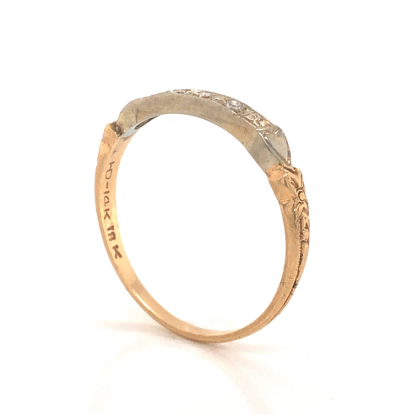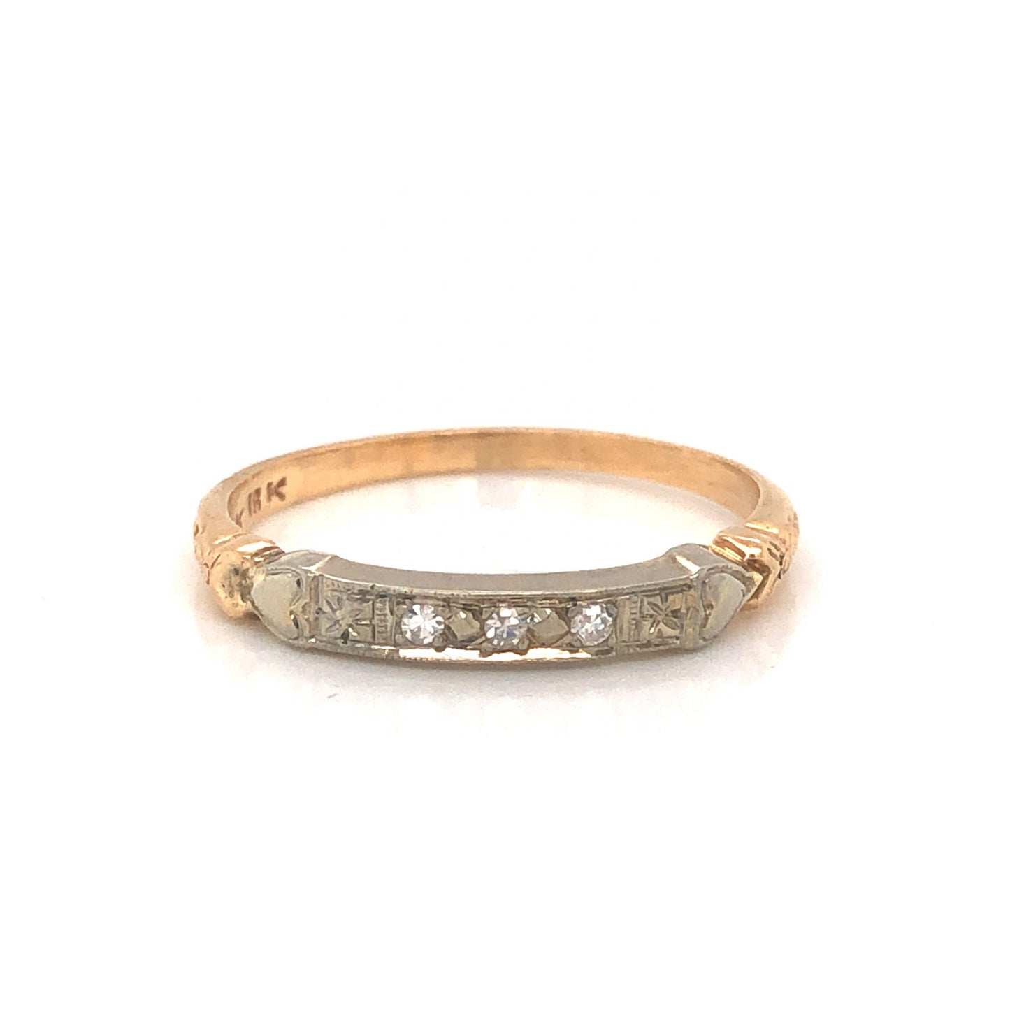 This one of a kind Retro wedding band features .045 carats of single cut diamonds in two-tone 14 karat white and 18 karat yellow gold. Three (3) sparkling white diamonds decorate the geometric mounting. The structured engravings in 14K white gold offer a duality of softness and strength in design. Retro engravings add a stylish flair to the shoulders of the ring. Two-tone great to stack! Wear this beautiful band as a stylish wedding ring or as an everyday right hand stacking band!