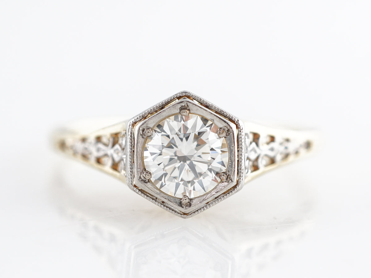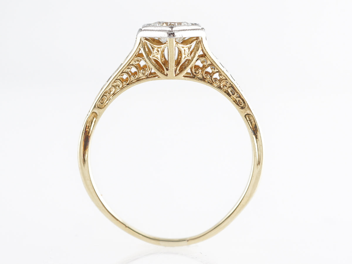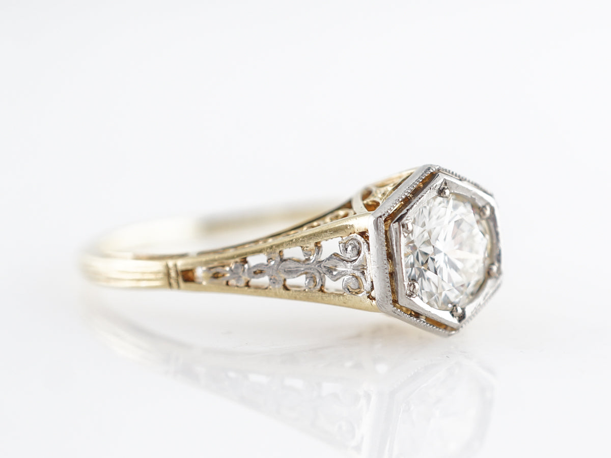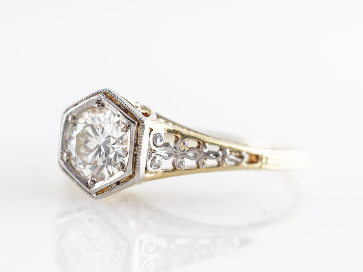 Retro Filigree Transitional Cut Diamond Engagement Ring in 14k. This amazing Retro filigree ring features a .56 carat transitional cut set in 14 karat white and yellow gold. The diamond is prong set in a hexagonal mounting of white gold, with more white gold running down the beautiful filigree work in the shoulders. The shank is yellow gold and splits to contain the delicate wire work enveloping the basket.
