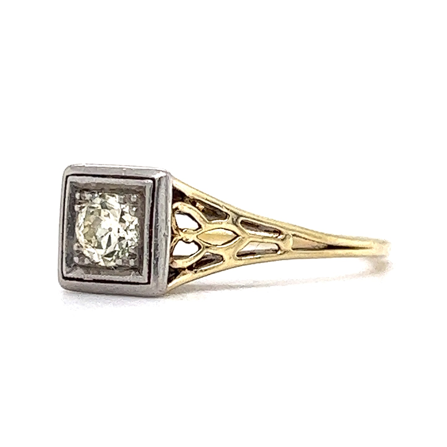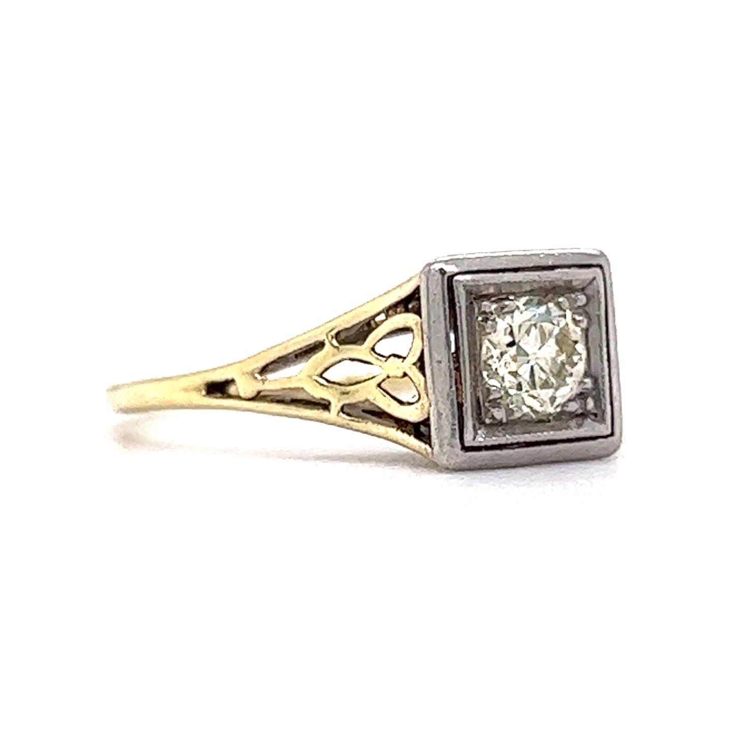 Retro Geometric Engagement Ring in 14K Yellow Gold and Platinum. This antique late Art Deco two tone engagement ring has great presence. The center old European cut .28 carat diamond is bead set in platinum with a decorative square bezel. The ret of the ring is constructed in 14 karat yellow gold with excellent condition filigree wire work with a notable leaf design visible from the gallery (side) view.