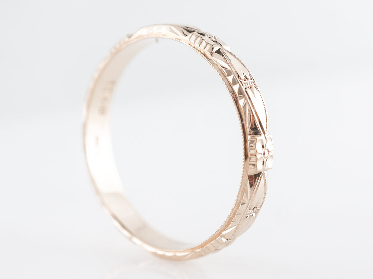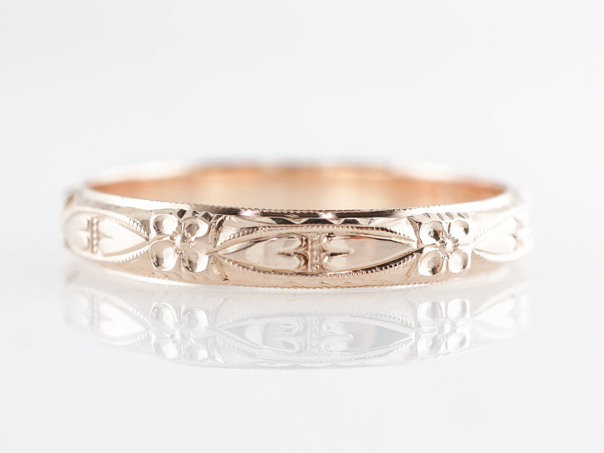 Retro Orange Blossom Hearts Wedding Band in Yellow Gold. This Retro wedding band is finished in 10 karat yellow gold. Flush with wonderful engravings of hearts and orange blossoms, this would pair beautifully with a vintage engagement ring.
