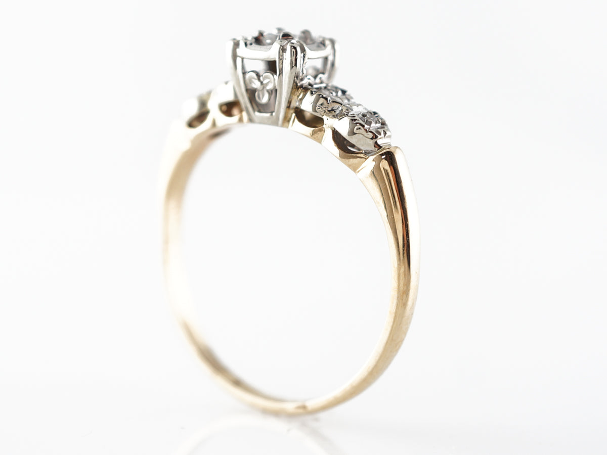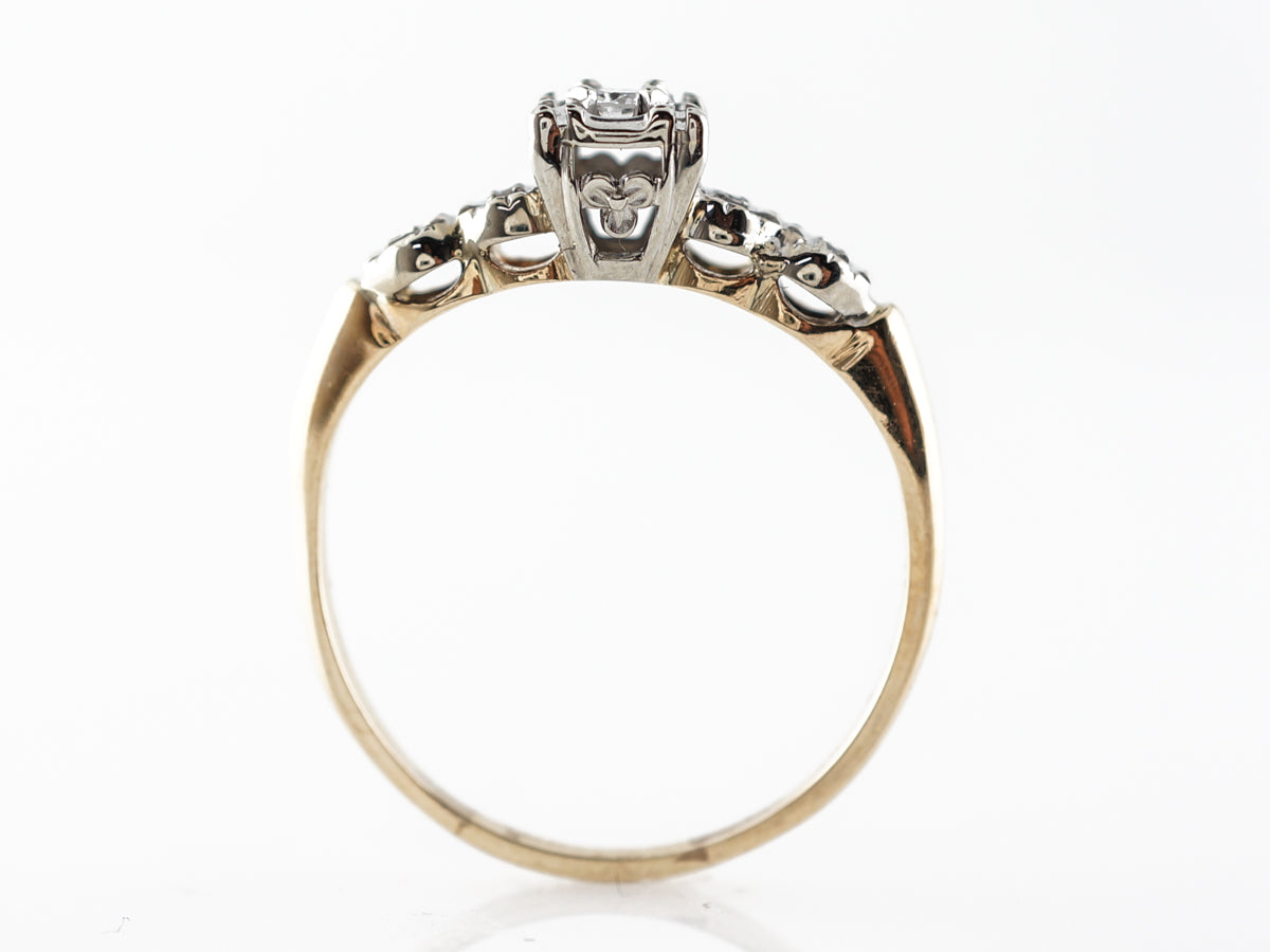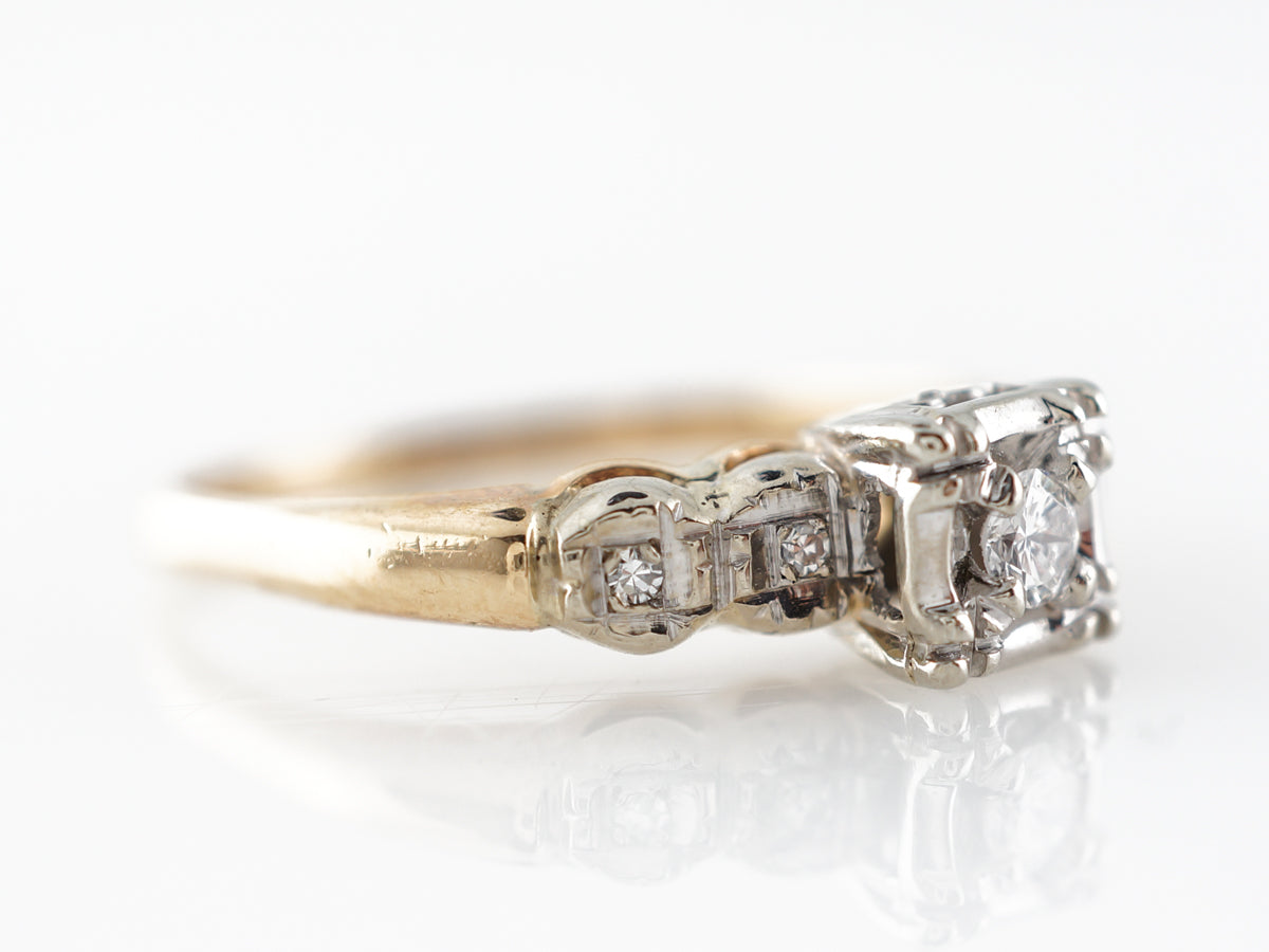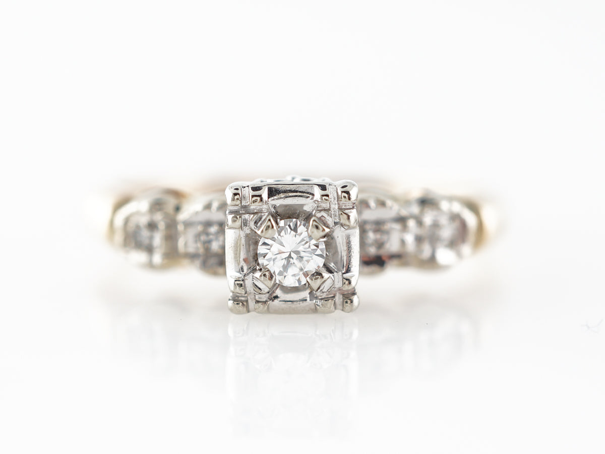 Retro Round Brilliant Single Cut Diamond Engagement Ring. This Retro engagement ring features .10 carats of diamonds set in 14 karat white and yellow gold. The primary stone is a .08 carat round brilliant that is set in a square mounting with fishtail prongs to really bring a burst of life into the design. Below, the shoulders are also set in white gold and hold single cut accent diamonds with little scooped out spaces to let enough light in for them to shine! The band is made of polished yellow gold and provides a nice contrast for this vintage two-toned look.