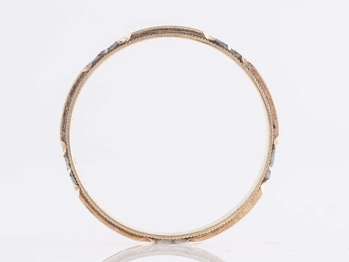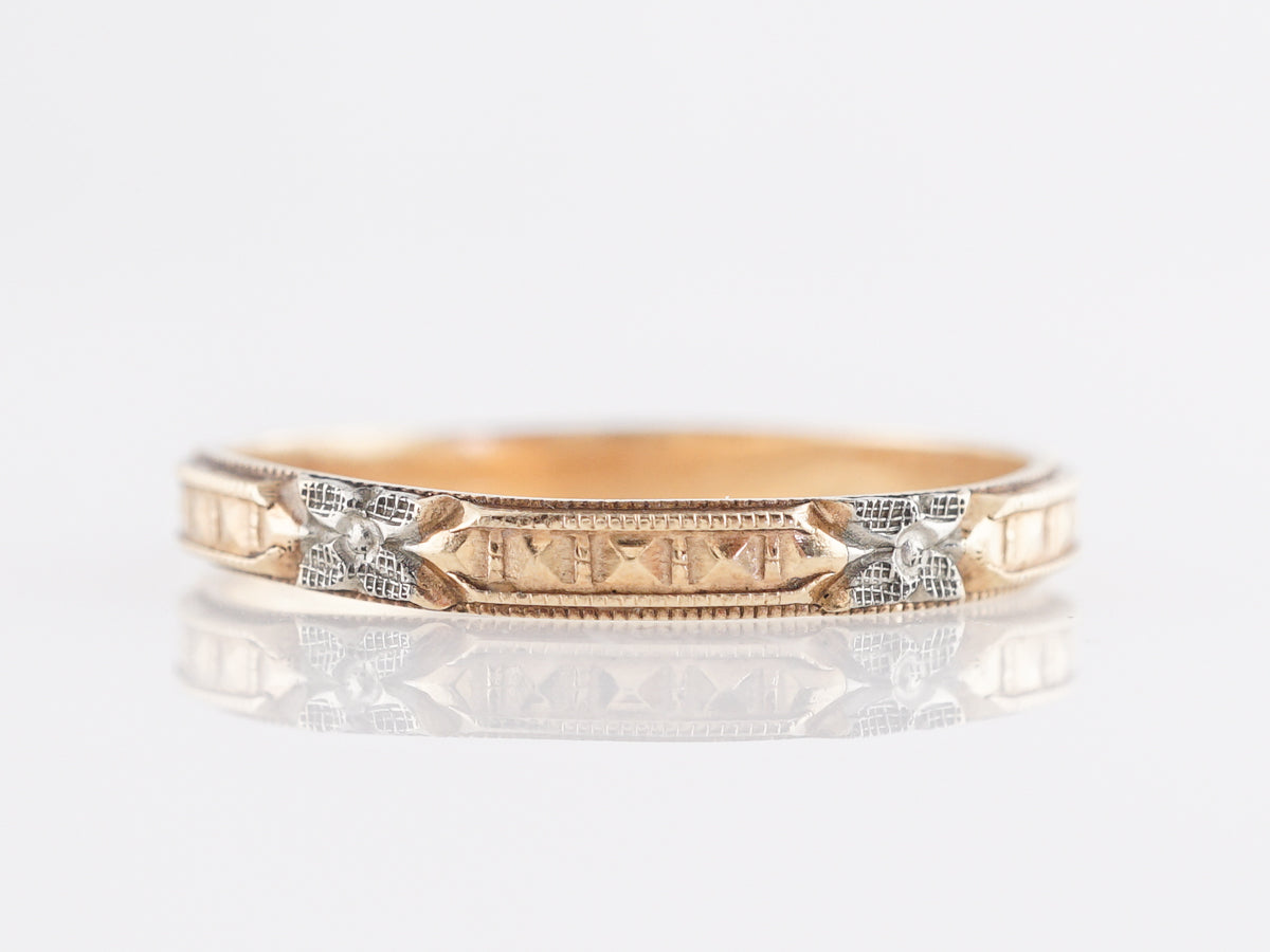 Retro Two-Tone Blossom Wedding Band in 14k. This Retro Two Tone Orange Blossom Wedding Band in 14k was created in the period between 1935 1950s. A mix of 14k yellow and white gold decorated with flowers and prisms throughout, this wedding band is a fun-loving blast from the past!