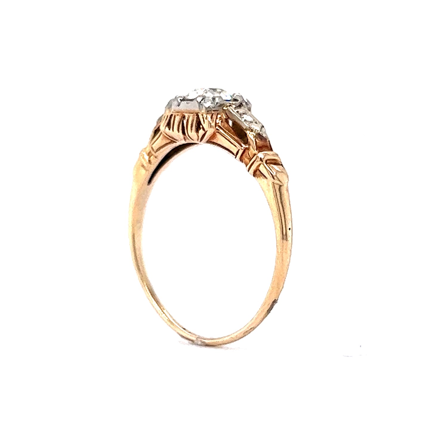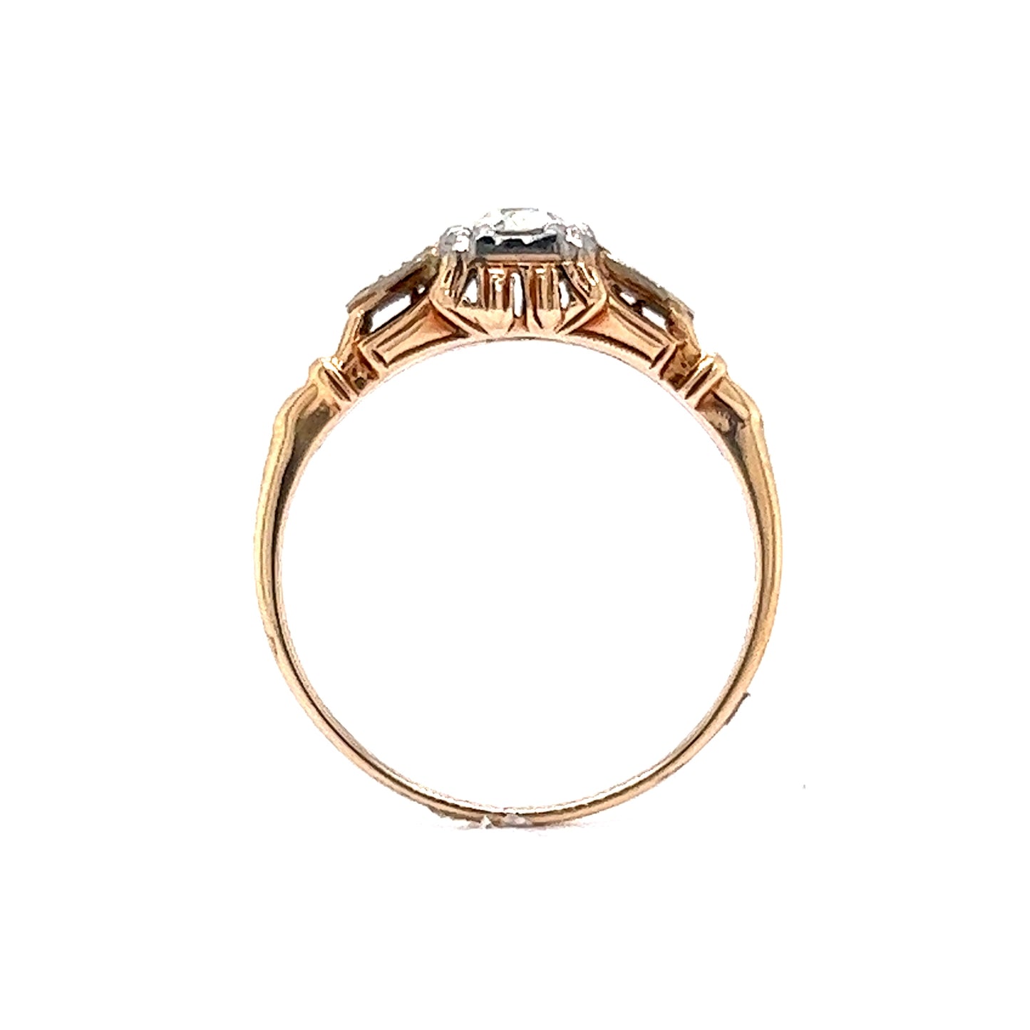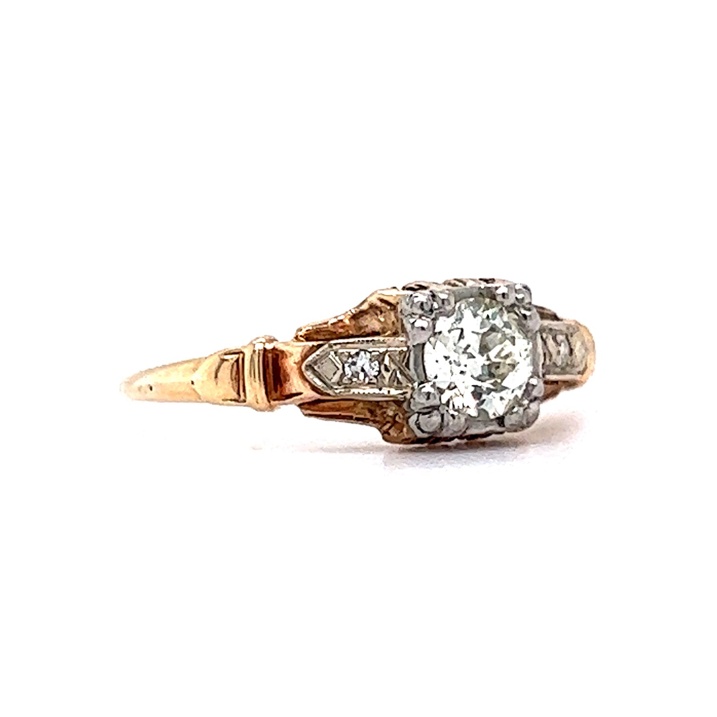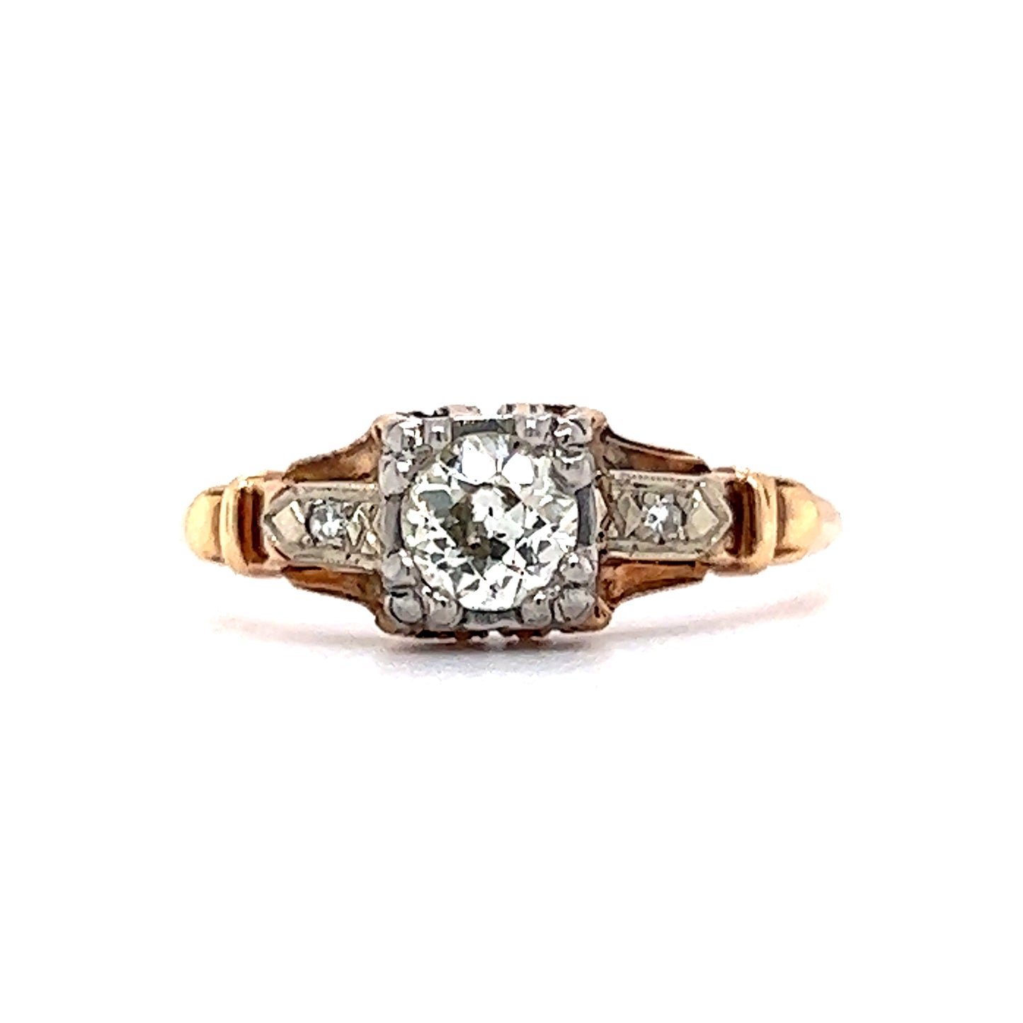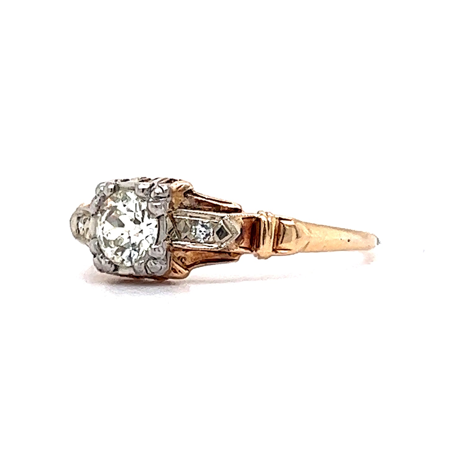 This beautiful Retro engagement ring features a .39 carat Old European cut diamond set in 14 karat white and yellow gold. The center stone is set with fishtail prongs, which creates somewhat of a square mounting, and is further accented by single cut diamonds on the shoulder. The shank is yellow gold and creates a nice contrast with the white gold on the face of the ring.