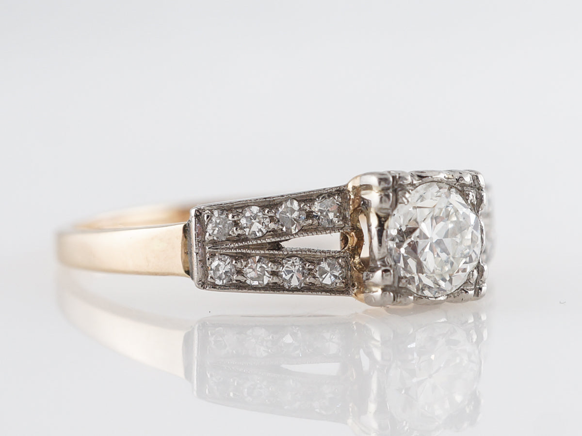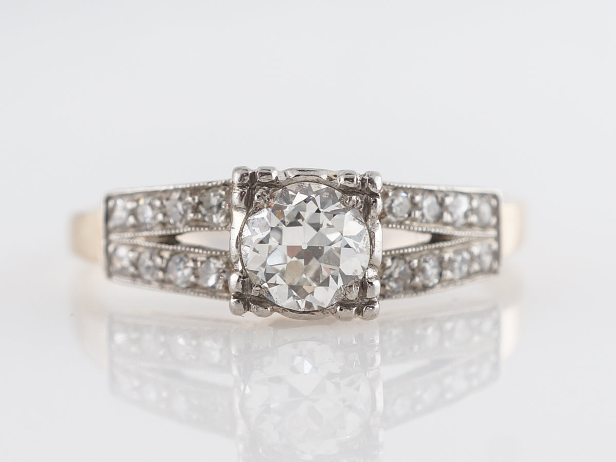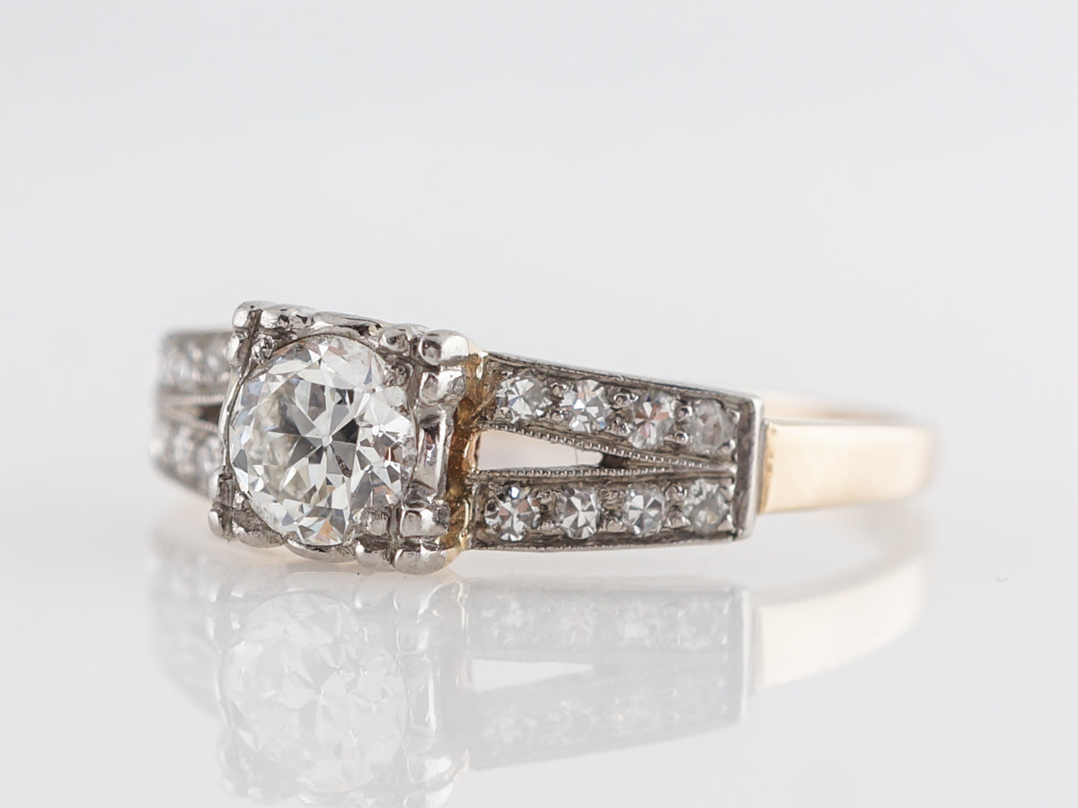 This beautiful two-tone ring from the Retro era contains a .60 carat Old European cut diamond. The lower shank is set in 14 karat yellow gold and splits at the shoulders that are finished in palladium. Adorned with many small accent diamonds, the split shank has a muted color and a very thin open space. A vintage ring with subtle charms, gorgeous contrast, and diamond sparkle!