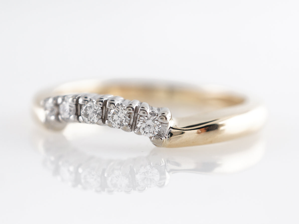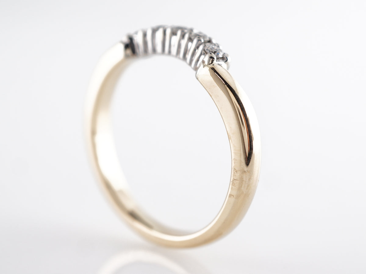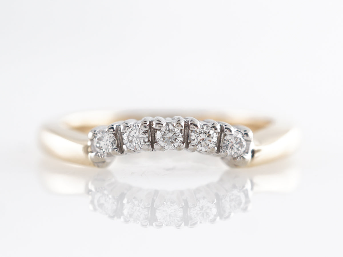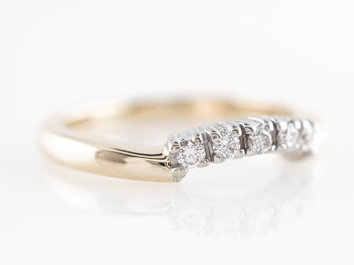 Retro Two-Toned Diamond Wedding Band in 14k. This original vintage Retro diamond wedding band features five (5) diamonds across the top of the band. The diamonds are set in white gold, accentuating the color of the stones. The shank of the band is finished in yellow gold, creating a gorgeous two-tone look that allows this ring to be paired with either a white or yellow engagement ring. The band is slightly curved and is perfect for a slightly wider engagement ring.