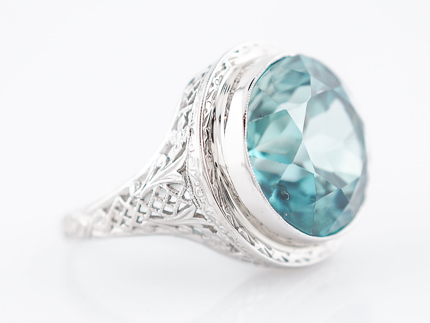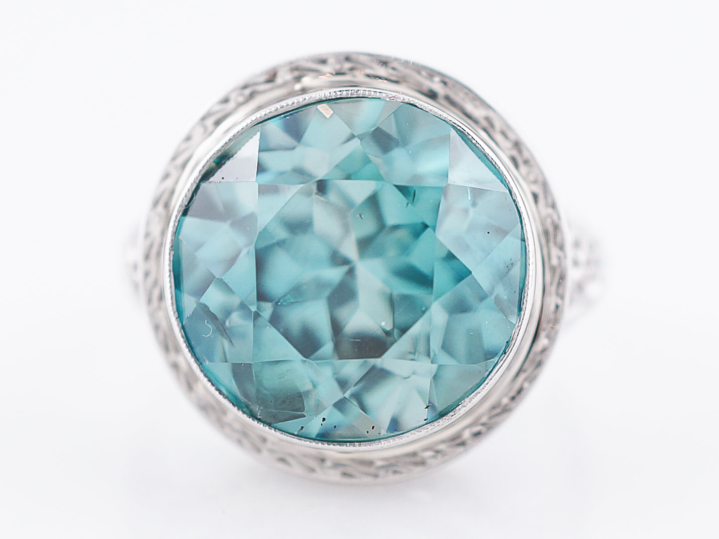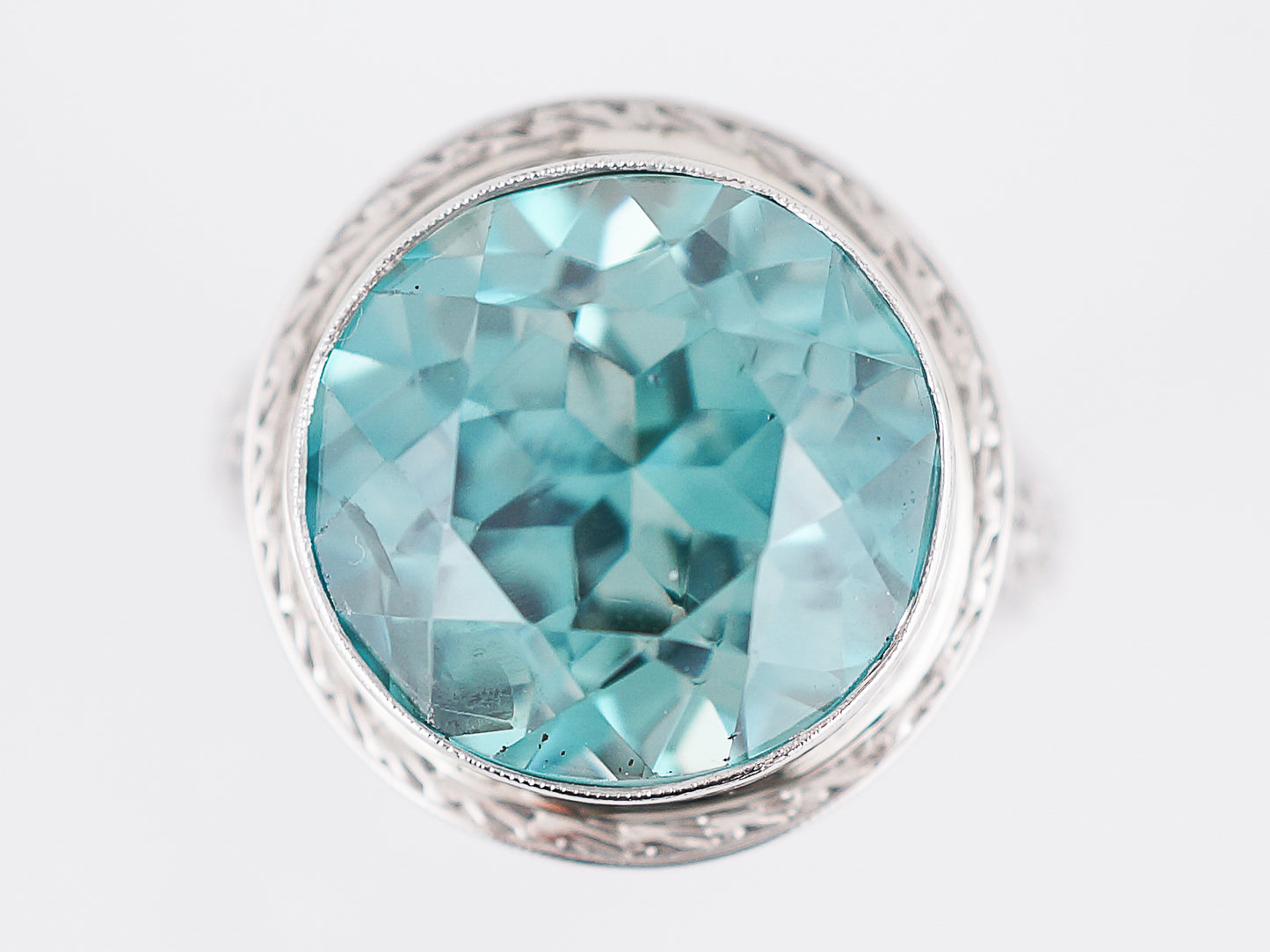 The stone and setting in this Art Deco ring are both spectacular. The blue zircon is a big, beautiful sparkling gem with a lovely greenish blue color. The size of the stone alone makes this a statement ring and the intricately engraved white gold bezel setting makes it even more special. Even though its a large piece it has a low profile making it easy to wear. It would make a perfect, eye catching cocktail ring.