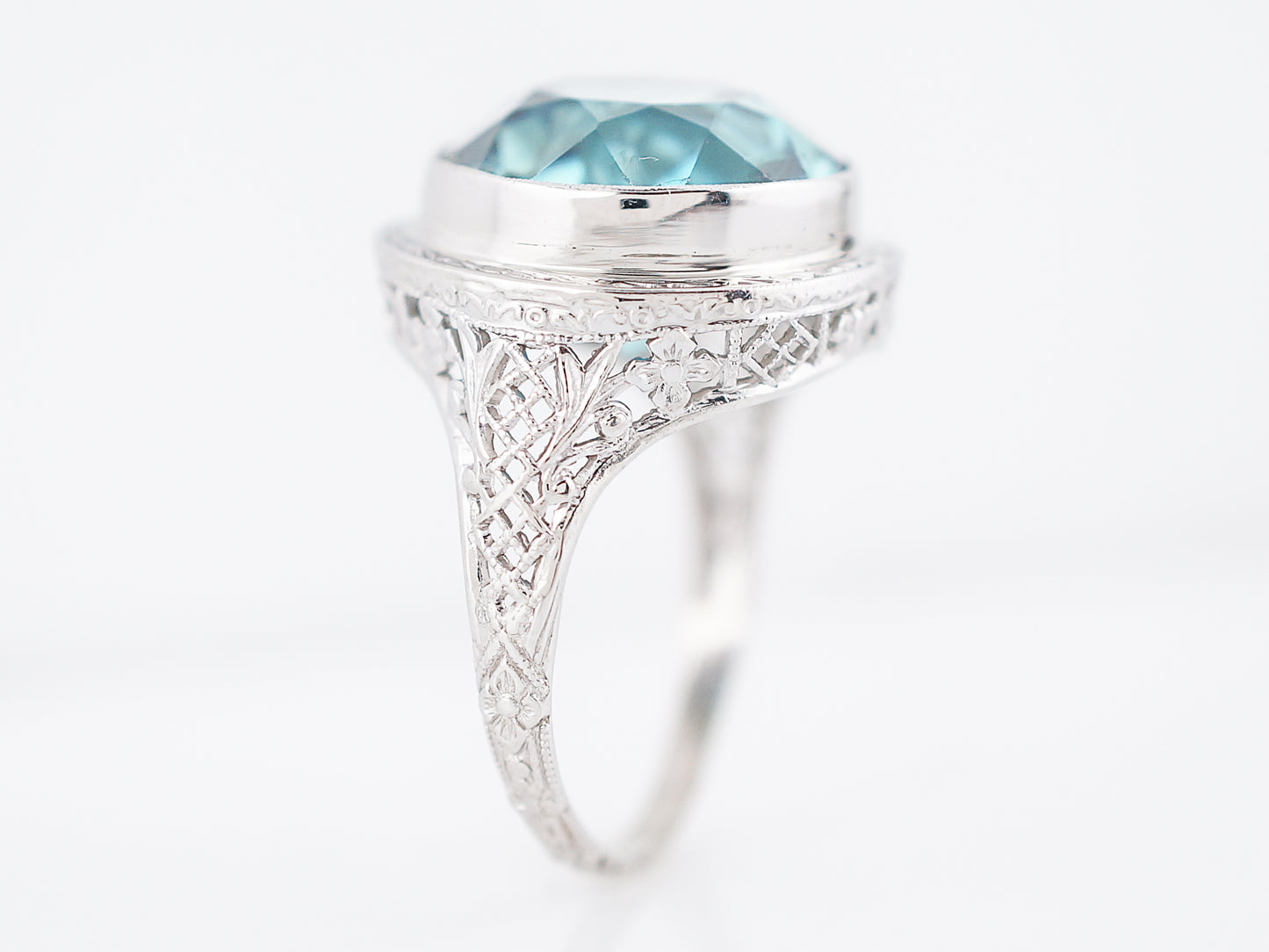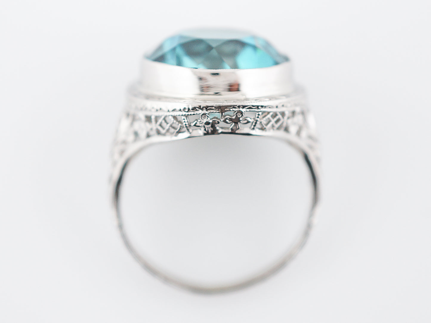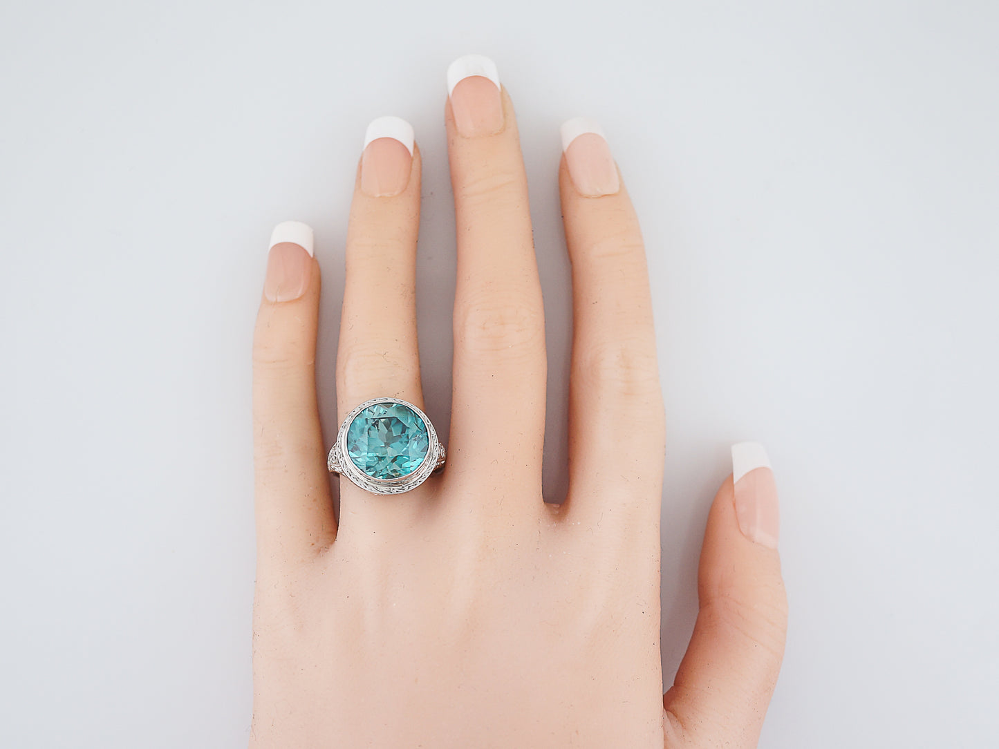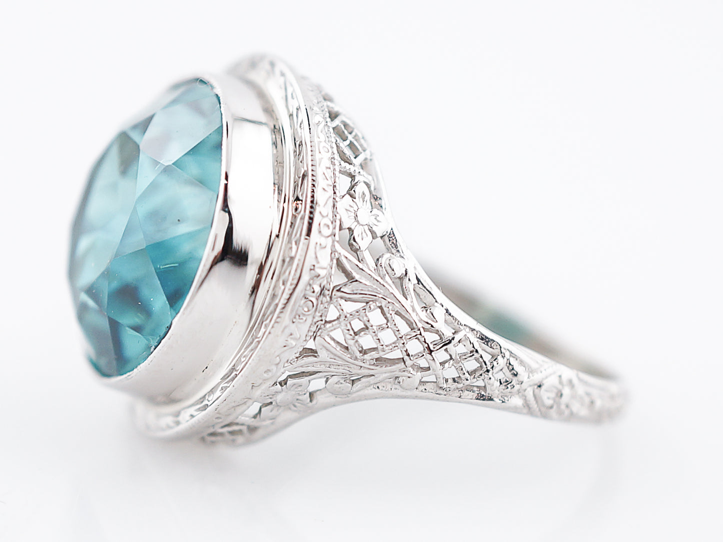 The stone and setting in this Art Deco ring are both spectacular. The blue zircon is a big, beautiful sparkling gem with a lovely greenish blue color. The size of the stone alone makes this a statement ring and the intricately engraved white gold bezel setting makes it even more special. Even though its a large piece it has a low profile making it easy to wear. It would make a perfect, eye catching cocktail ring.