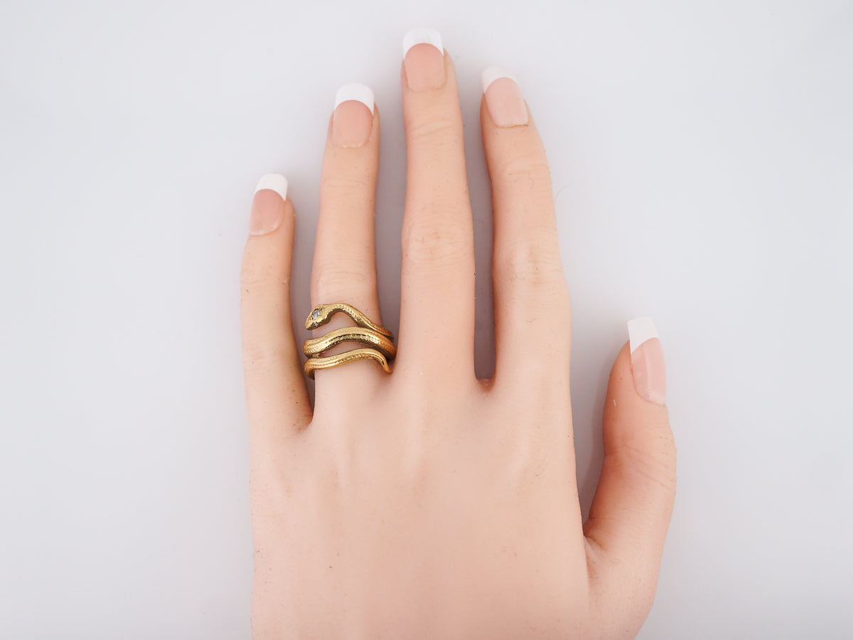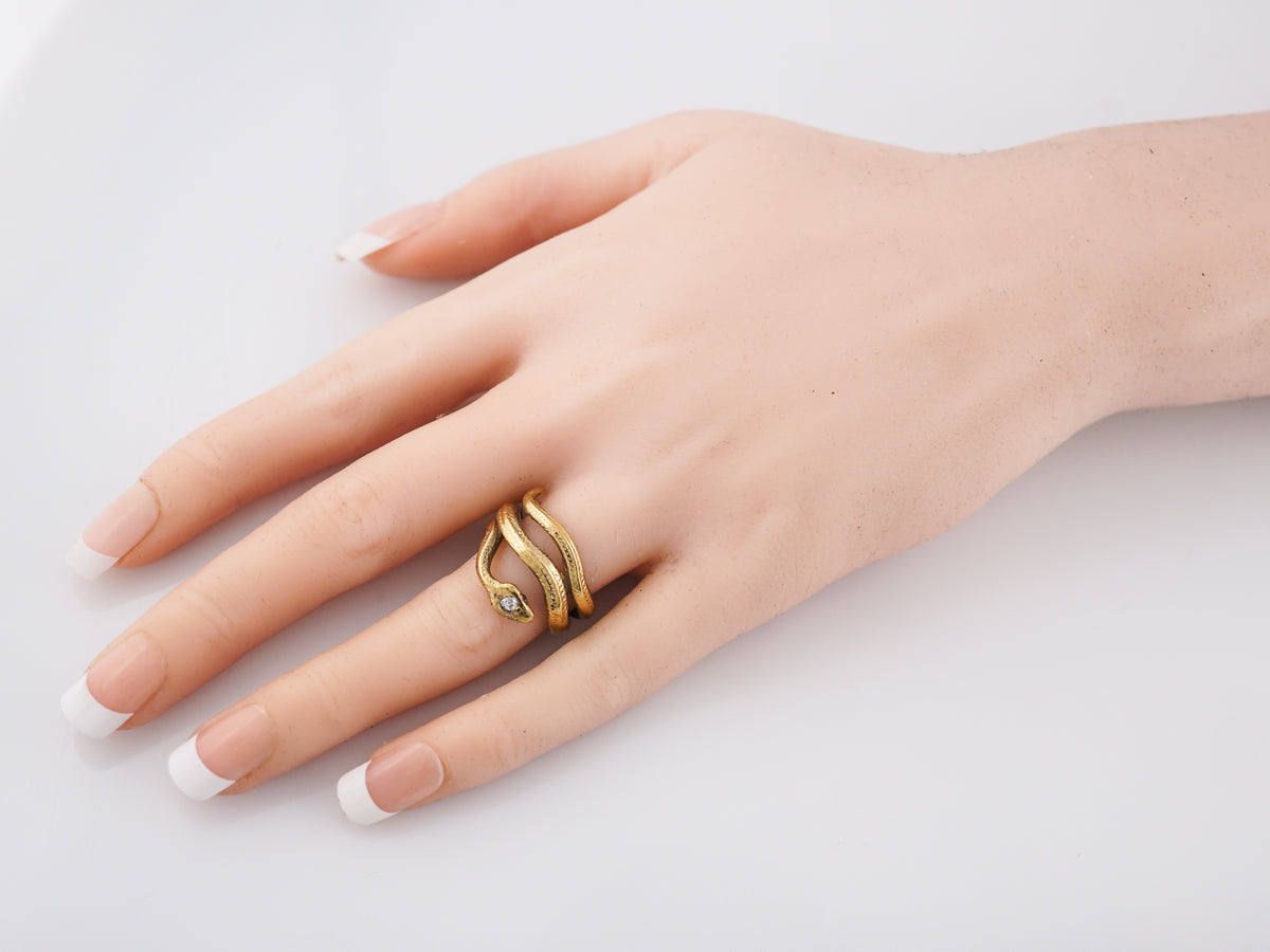 Snake designs, like this modern ring have remained a popular motif in jewelry throughout the ages. Faintly textured and wrapping the finger three times, this 14 karat yellow gold serpent is anything but scary. A glittering .07 carat old European cut diamond rests in the crown of the head giving it a touch of sparkle!